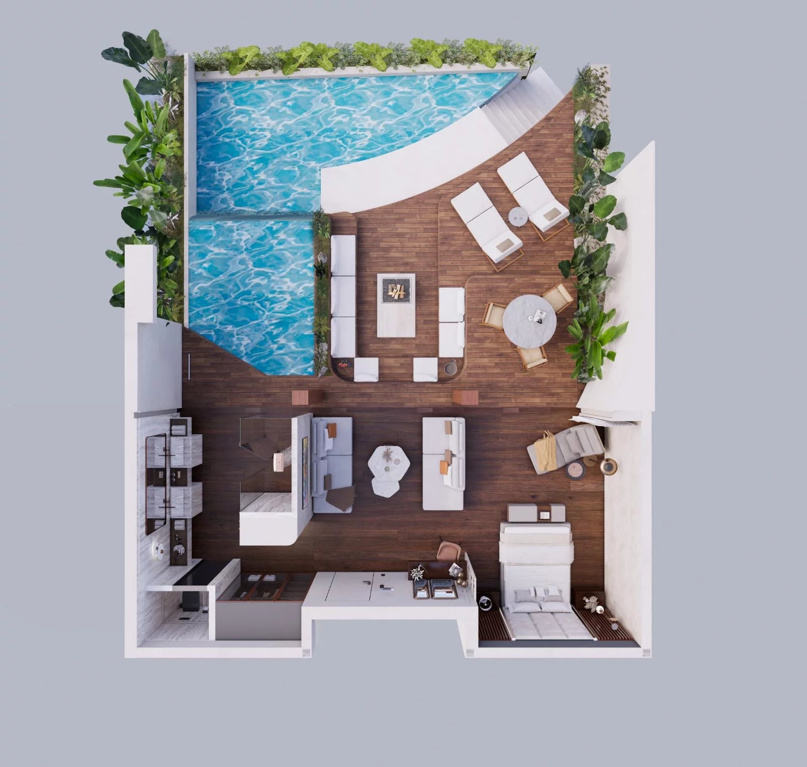 • Upper bungalows with plunge/jacuzzi pool on roof deck.
