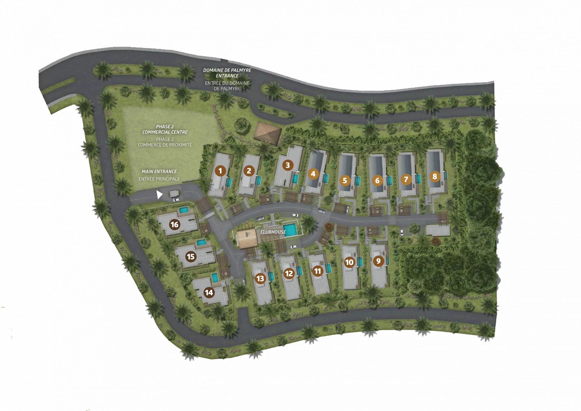 PALMARIS is a development masterminded on a large plot of 1.66 hectares, giving a vast area to landscaped spaces, allowing respect for privacy and offering the gentle atmosphere of a privileged and secure village.