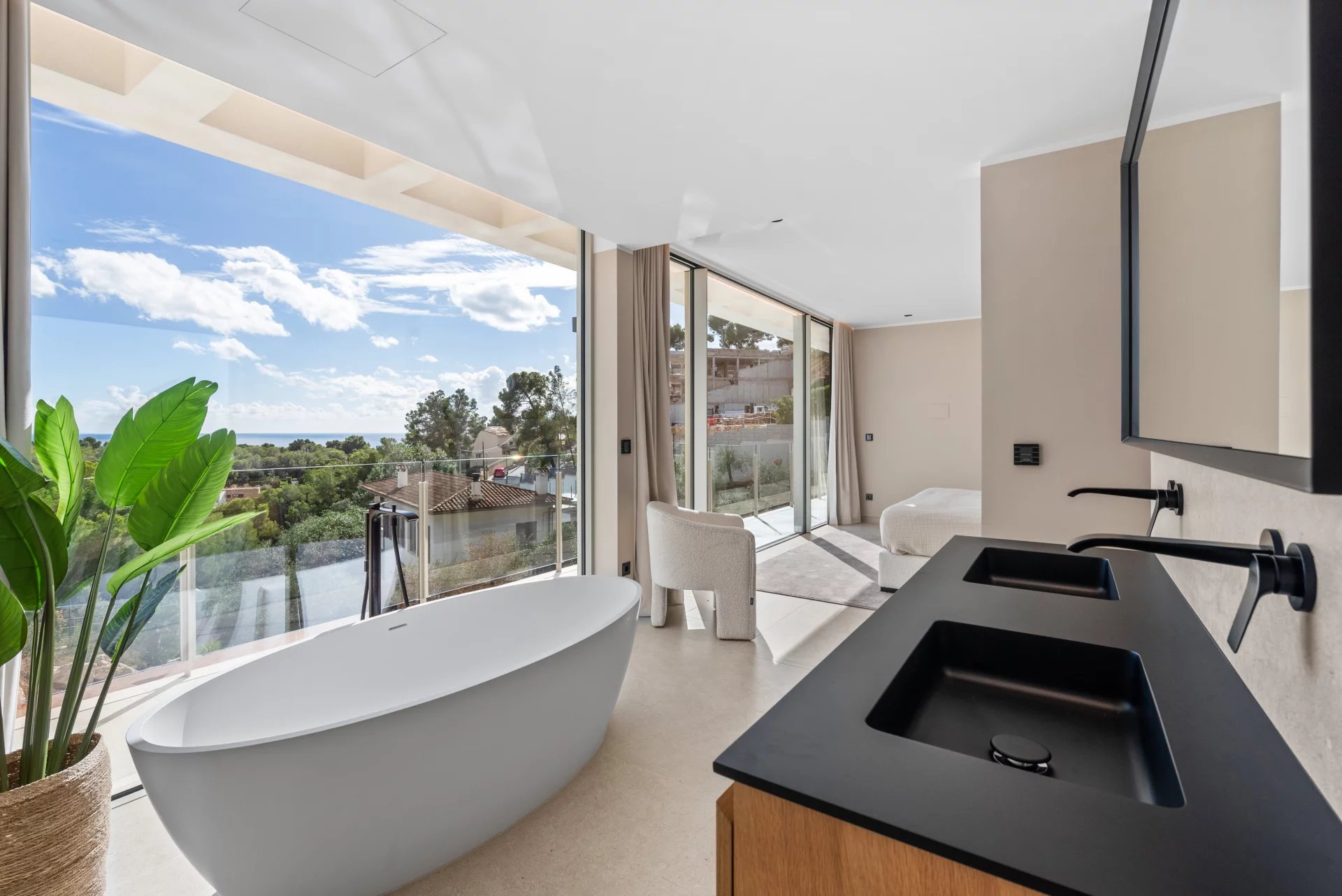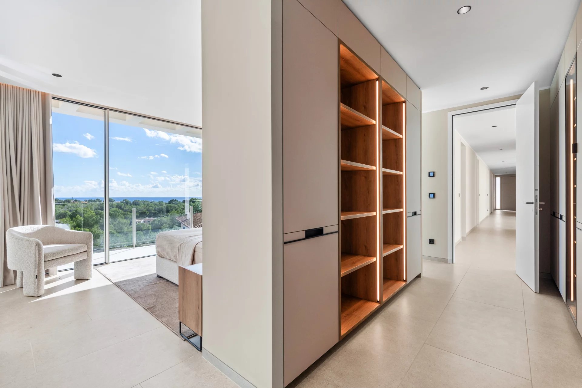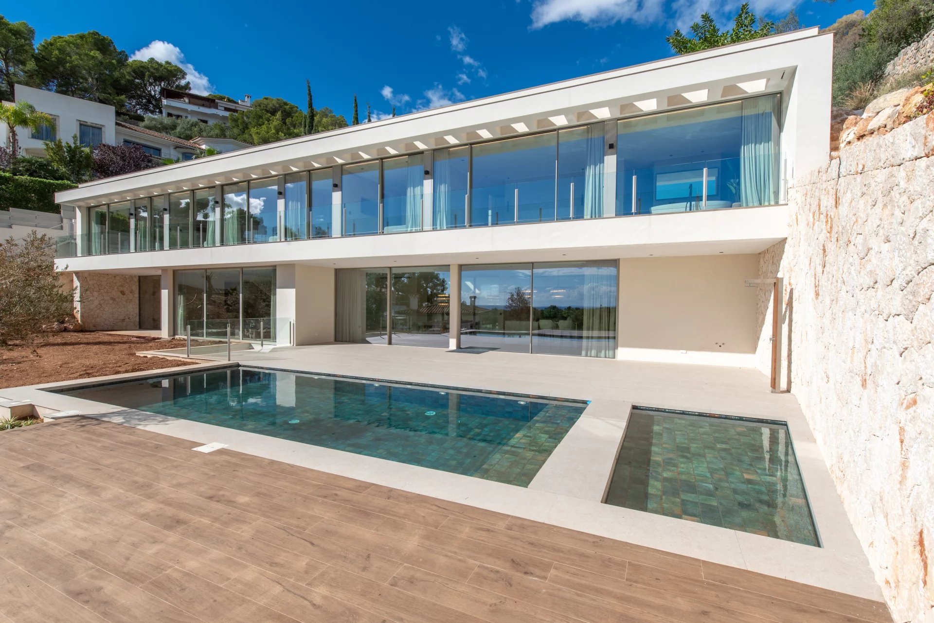 We present this exclusive villa of contemporary design, located in the most coveted area of Puerto Portals and ready to move in. An exceptional residence that combines modern architecture, Mediterranean elegance and panoramic sea views, offering maximum comfort in a privileged environment. On a plot of approximately 1,328 m², this villa stands with a living area of about 680 m², distributed with style and brightness. On the main floor is the entrance area and five spacious bedrooms en suite, all with stunning sea views and direct access to private terraces. Upstairs 5 bedrooms en suite. The first floor offers an elegant open concept living space, a fully equipped designer kitchen with top quality materials and dining area, a second auxiliary kitchen, a guest toilet and a bedroom with en suite bathroom. The spacious terraces and infinity pool create the perfect setting to enjoy the Mallorcan outdoor lifestyle all year round. On the lower level, the villa has a private cinema room, a gym, a laundry room and a technical room, as well as a garage for several vehicles. Among its many features are underfloor heating, air conditioning, a water treatment system, elevator, advanced home automation, a carefully designed LED lighting, automatic irrigation system, high quality insulating glazing, plus a spectacular pool and private gym. A villa where luxury, privacy and design merge to offer a unique residential experience in one of the most exclusive locations in Mallorca.