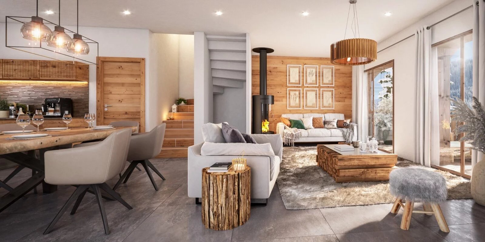 The facades of the chalets are clad in sophisticated wood cladding, in perfect harmony with the mountain setting. Inside, the combination of rustic charm and modernity creates a warm atmosphere, enhanced by high-quality contemporary facilities. Each home has four bedrooms, three bathrooms, a large sunny living area, ski storage and an attached garage. The building meets the highest standards of thermal efficiency, ensuring optimum performance.