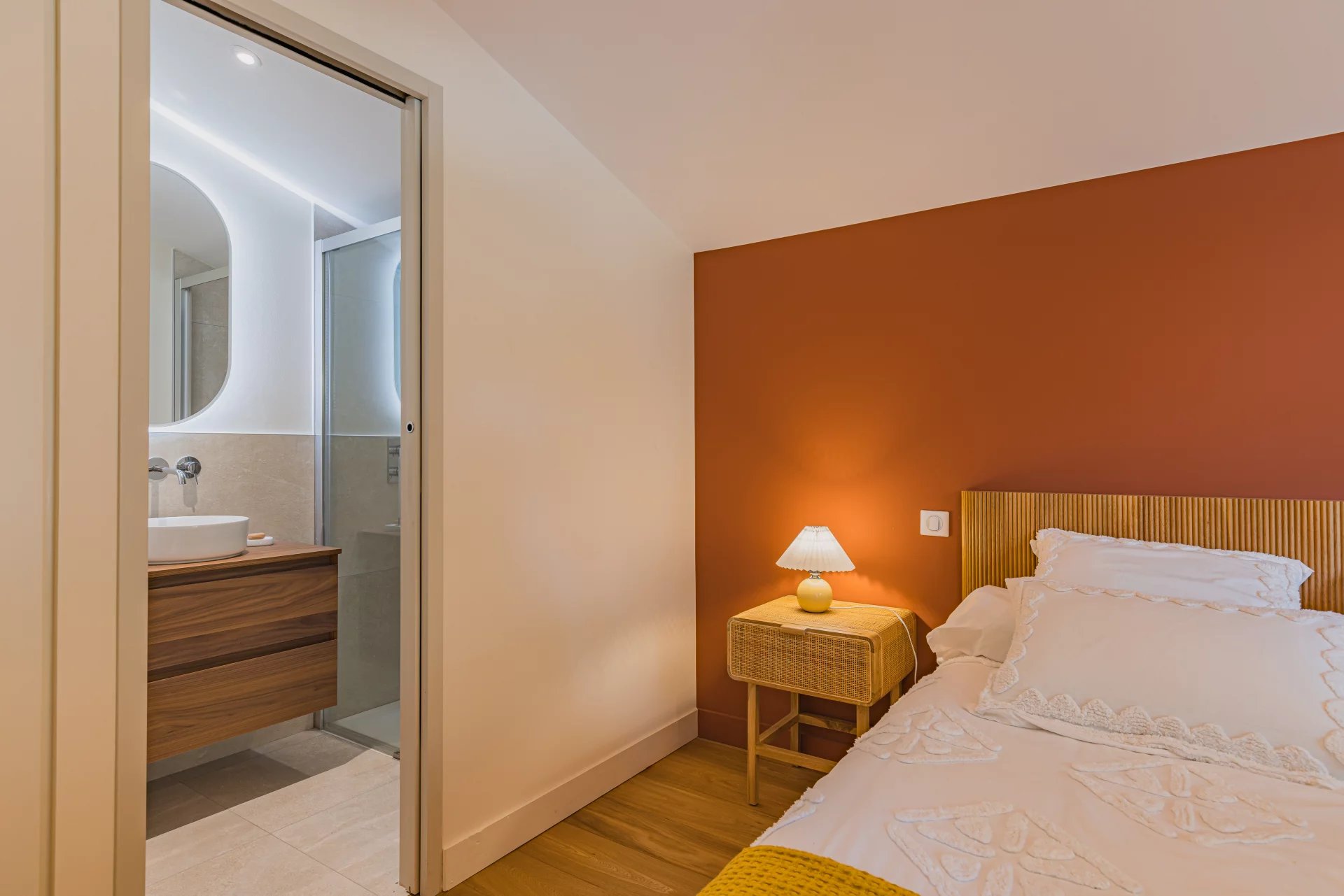 Upstairs, two bedrooms with their own private bathrooms enjoy a stunning view of the Bay, offering a soothing panorama at any time of day. A third bedroom on the ground floor, also equipped with its own bathroom, completes the layout designed for privacy and comfort. Air conditioning, optimized spaces, and meticulous finishes—together, they create a fully realized home, ready to move into.