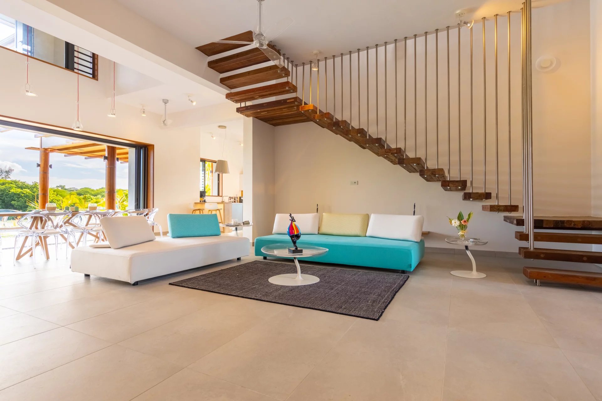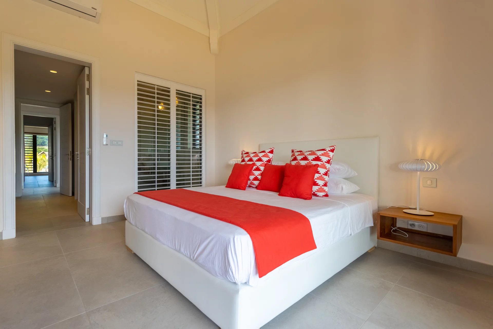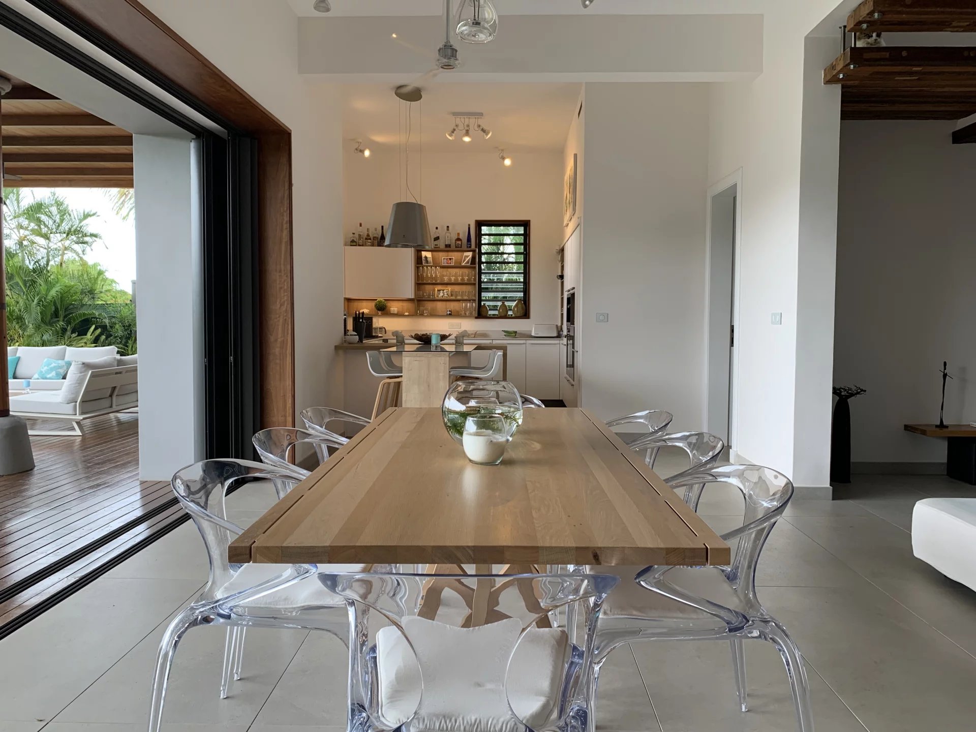 The first floor has 4 en-suite bedrooms with dressing rooms, including 2 master suites with bathtubs. Two of the bedrooms have a terrace overlooking the river. Also an office area. The spacious TV lounge gives access to a very intimate kiosk. It also offers a magnificent view of the swimming pool, the river and the garden. The choice of furniture and interior decoration brings just enough color and texture to this architecture without excess and clutter. The villa also has a closed garage for 2 cars with storage space. It is fully air-conditioned.