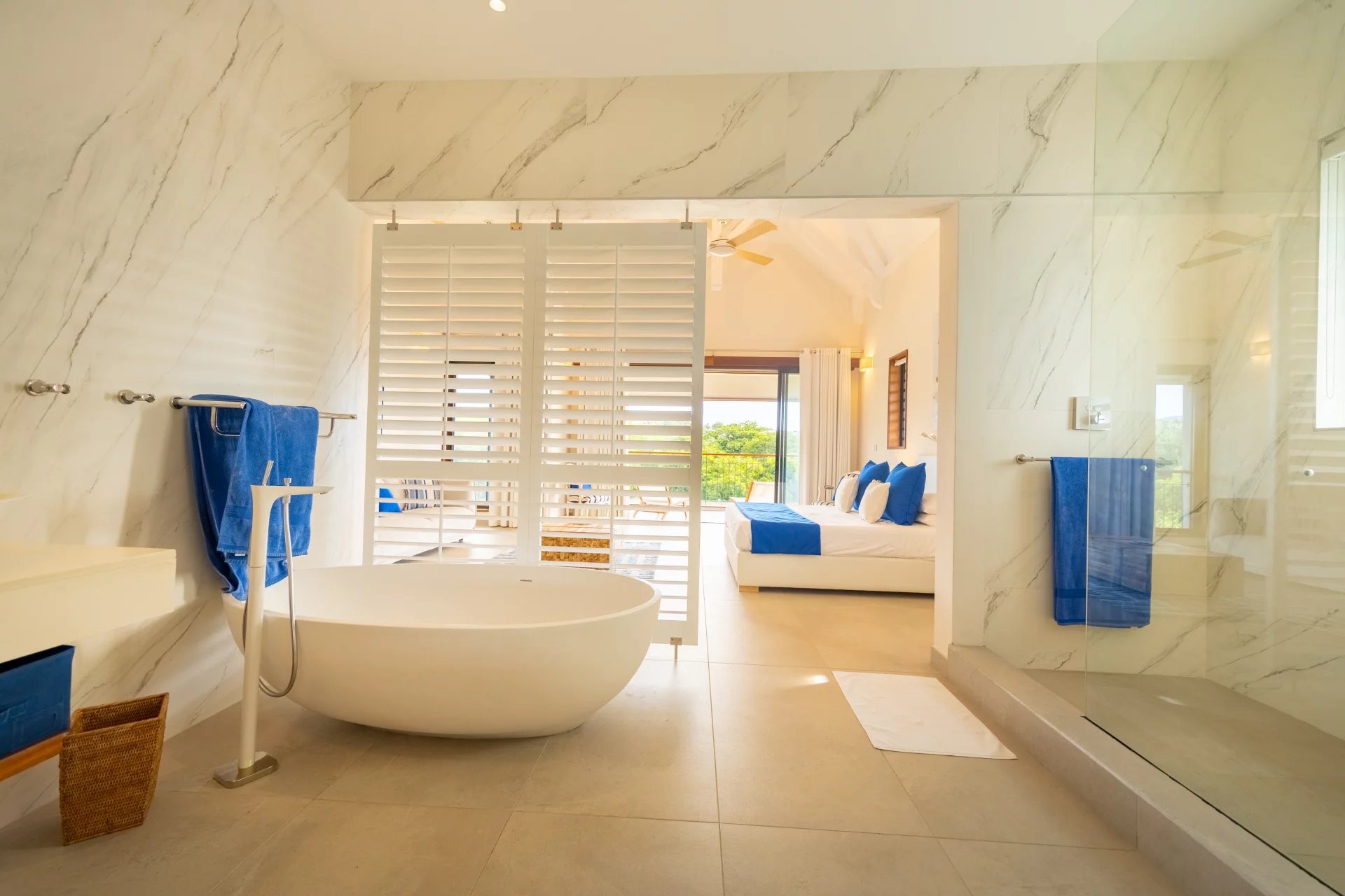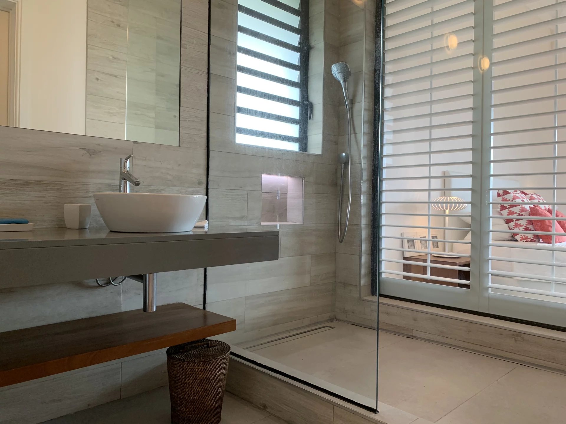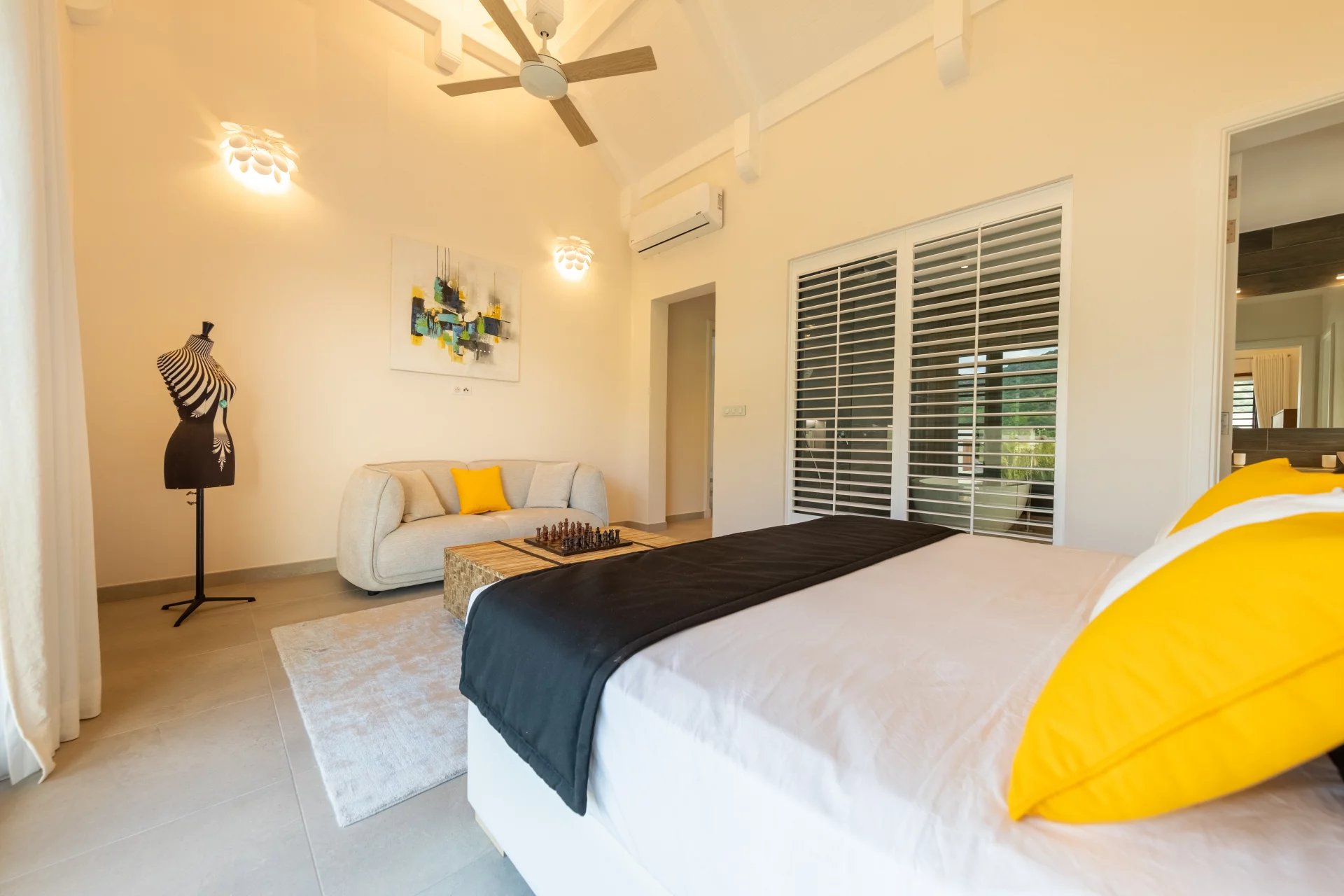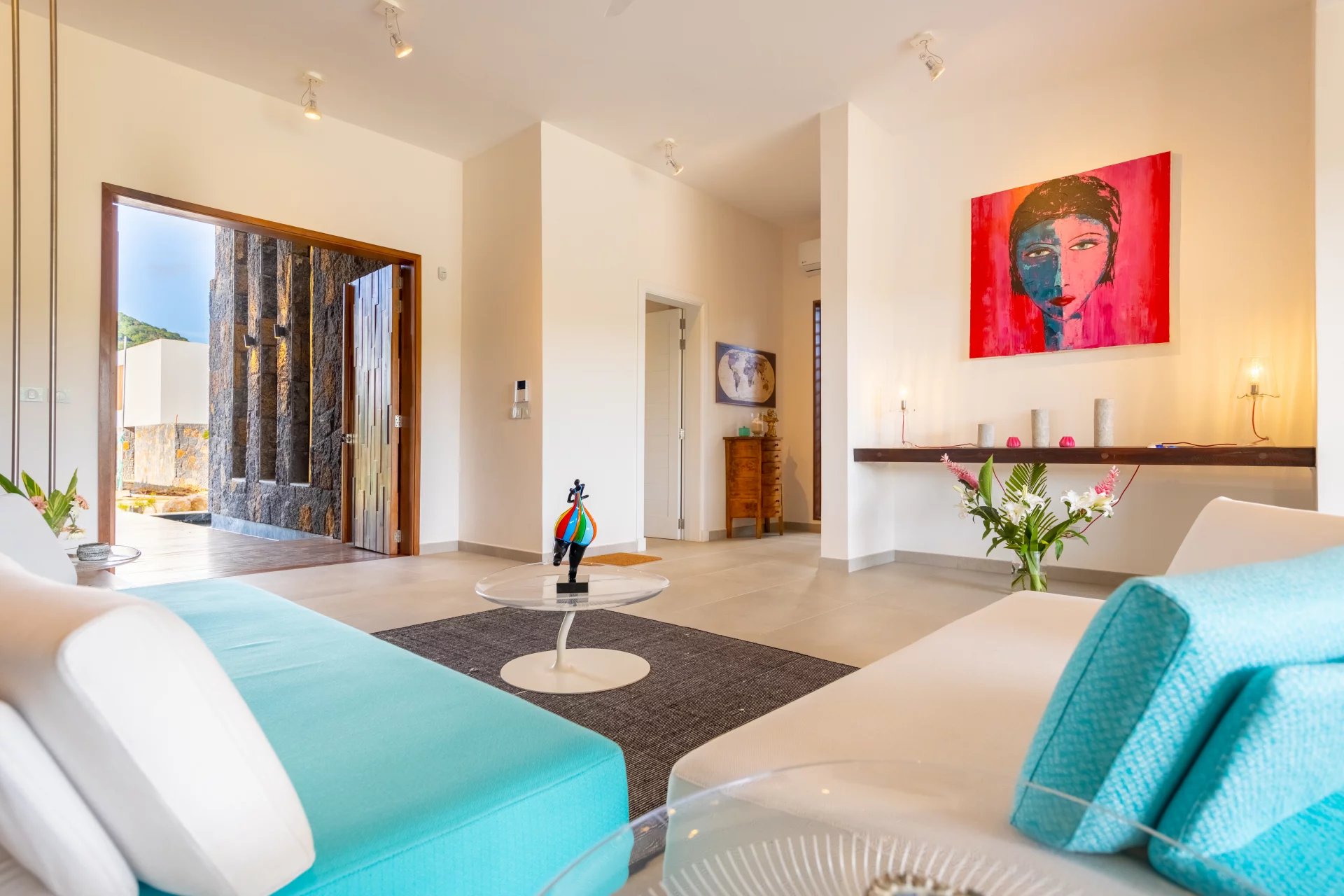 The first floor has 4 en-suite bedrooms with dressing rooms, including 2 master suites with bathtubs. Two of the bedrooms have a terrace overlooking the river. Also an office area. The spacious TV lounge gives access to a very intimate kiosk. It also offers a magnificent view of the swimming pool, the river and the garden. The choice of furniture and interior decoration brings just enough color and texture to this architecture without excess and clutter. The villa also has a closed garage for 2 cars with storage space. It is fully air-conditioned.