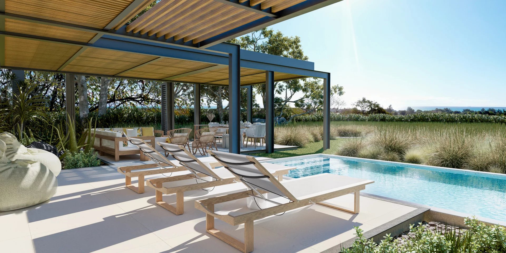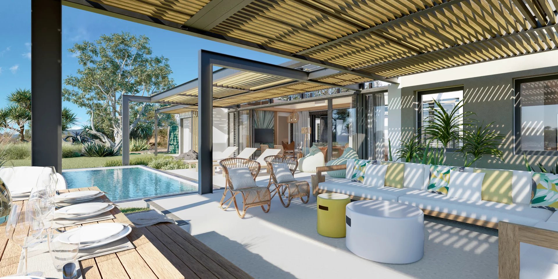 VILLA N: This villa combine elegance, space and privacy, with superb views of the golf course and Tourelle de Tamarin Mountain. These plots enjoy an ideal orientation, sheltered from the wind and taking full advantage of natural lighting. Its patio with tropical landscaping is a green lung and a central point for the household’s daily life. It is an ultimate tropical family home with three en-suite bedrooms (with an optional fourth bedroom) and large living spaces combining a living room, a dining room and an open kitchen facing out towards the outdoor living spaces (gazebo and pool).