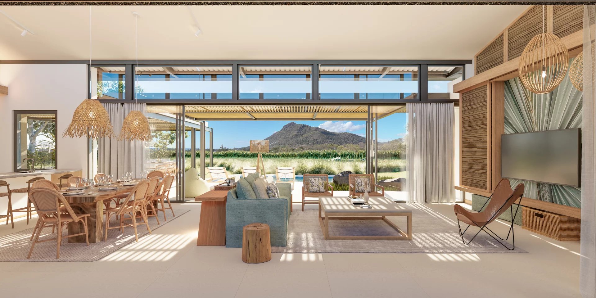 The first phase includes 81 villas and residential plots in the heart of the estate, and will be accompanied by the construction of the clubhouse and the first 9 holes of the golf course. Phases 2 and 3 will follow with 78 and 61 units respectively. The 2nd phase will be accompanied by the construction of the last 9 holes of the course. Each phase is expected to be completed within three years of commencing commercialization. Three models of villas with an actual built surface of more than 400 m² are offered on land with an average surface area of 2,000 m². Based on the concept of sustainable architecture, each villa has a different orientation, with the lowest possible environmental impact by taking advantage in particular of the topology of the land, as well as natural ventilation and light. This unique project of exceptional scale in a very sought-after environment offers a breathtaking view of Le Morne and the Indian Ocean.