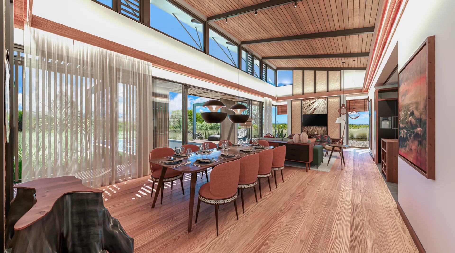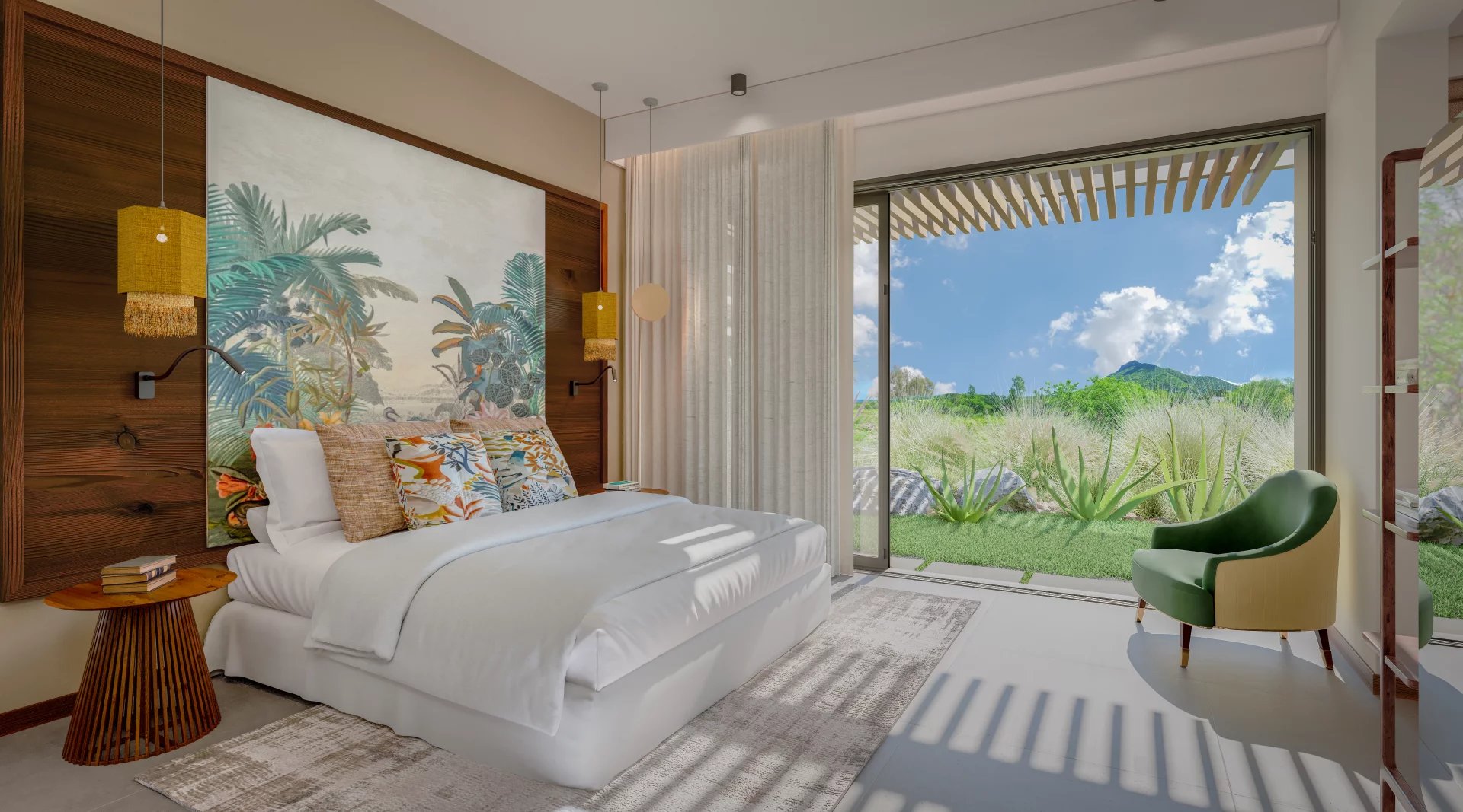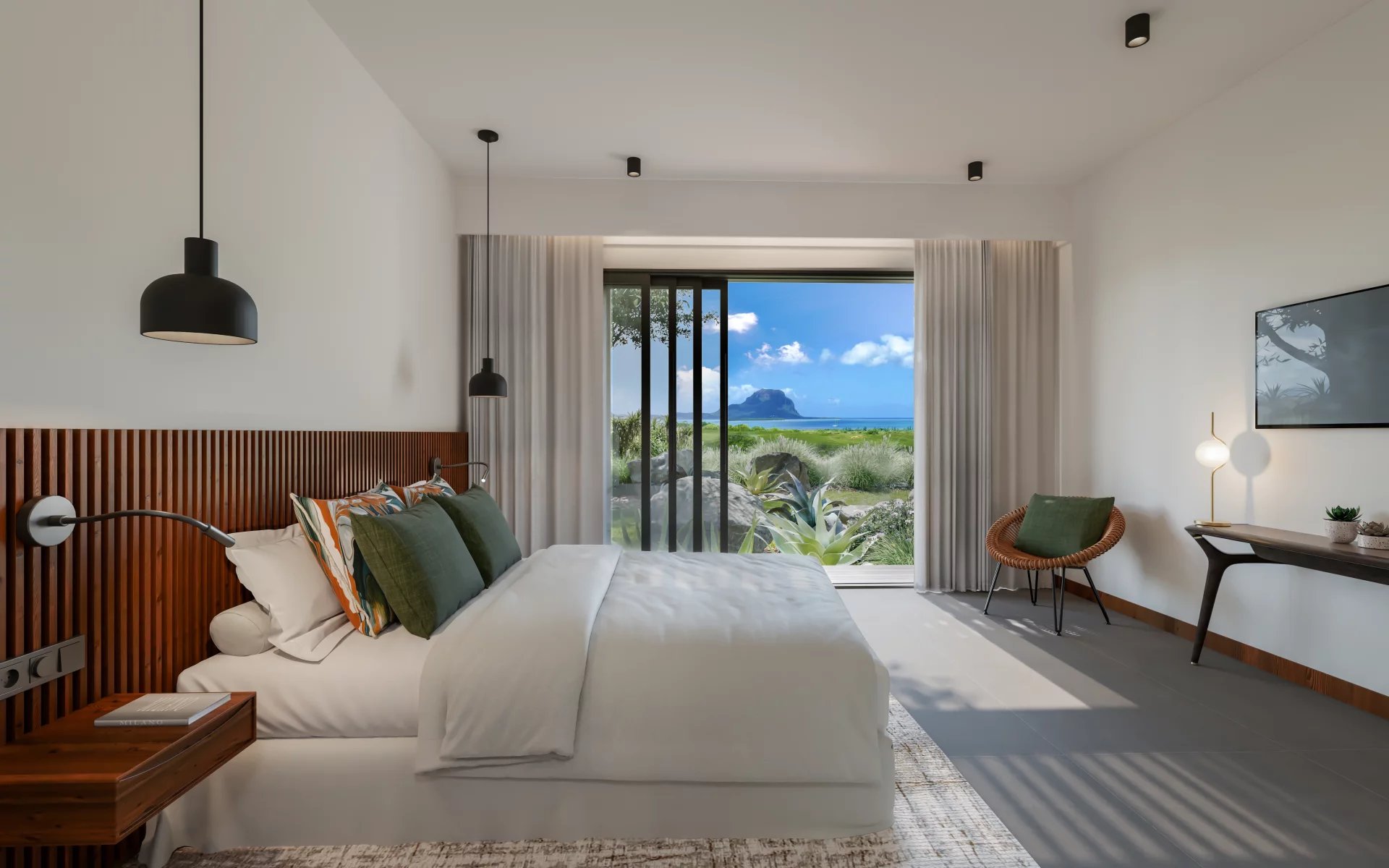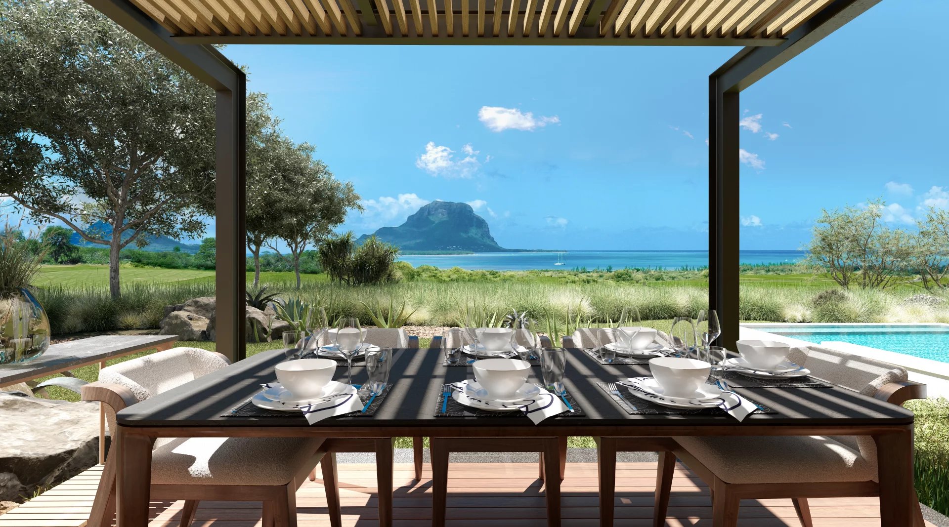 The site benefits from a unique savannah atmosphere. Its climate is very dry and its current landscapes are composed of a combination of tall Black River grasses, endemic trees, black wood trees, tamarind trees, Creole agaves and volcanic rocks. The landscaping concept aims to preserve the beauty of the site by reusing 100% of the site's existing plants for the roadsides, and by landscaping 90% of the environment around each villa with existing plants from the site and plants endemic to Mauritius