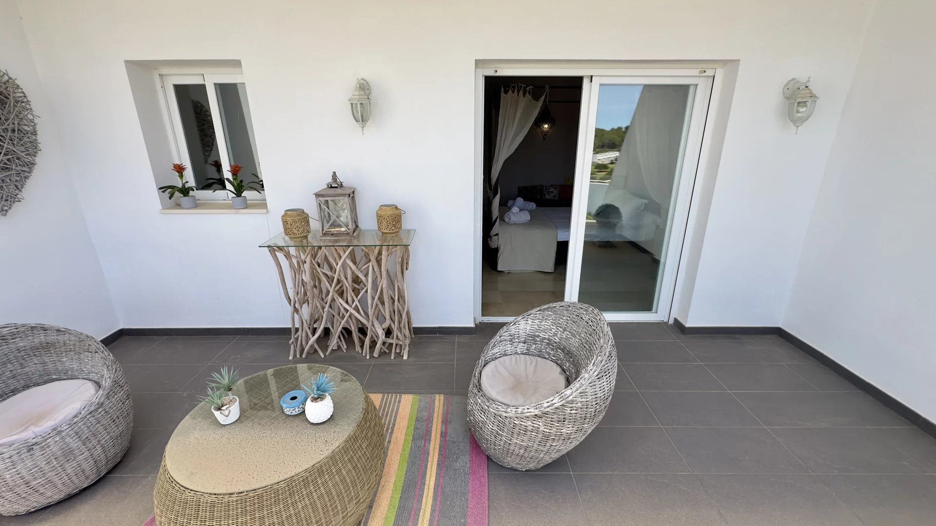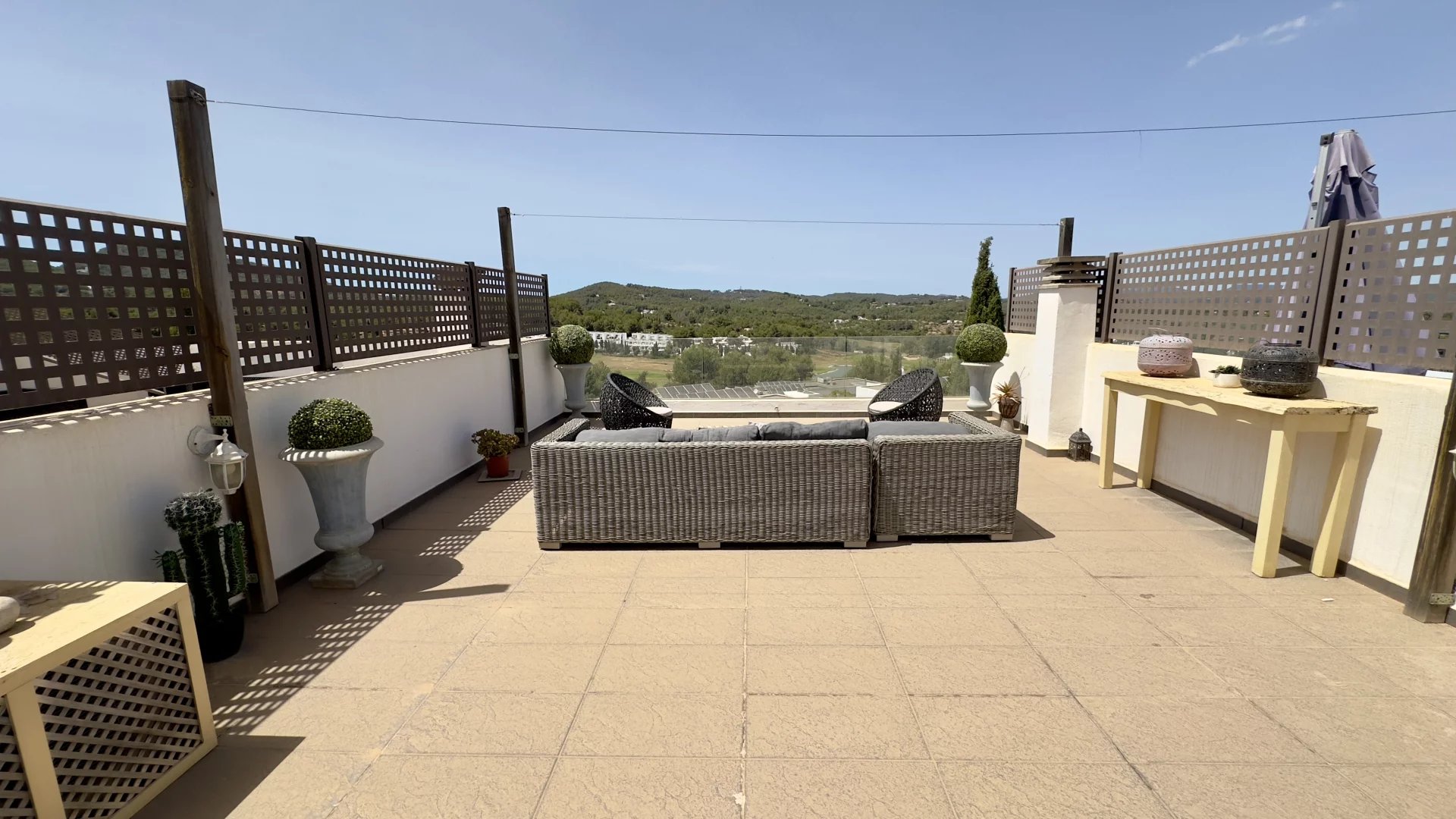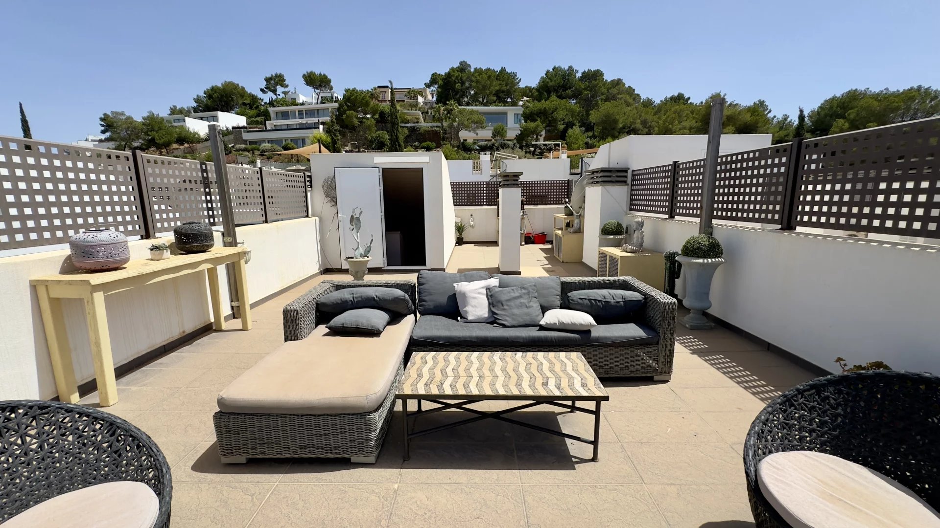 This house features three terraces: a terrace on the ground floor for outdoor dining and relaxation, a balcony accessible from the master bedroom, perfect for enjoying serene views, and a rooftop terrace with impressive panoramic views, equipped with a barbecue area and a chill-out zone.