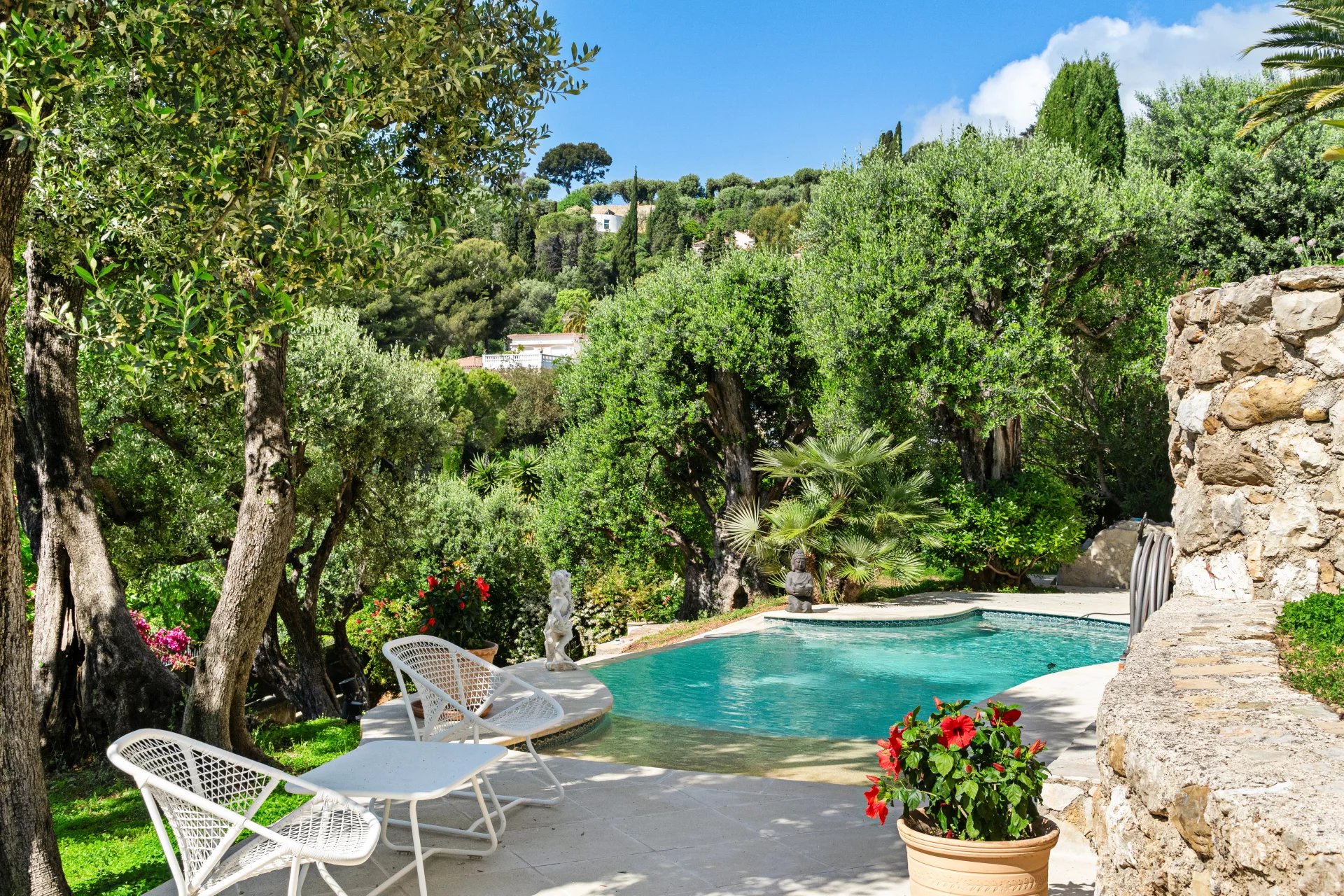 Outside, the garden features an elegant swimming pool surrounded by relaxation areas, creating an intimate and privileged setting. Several parking spaces complete this property.