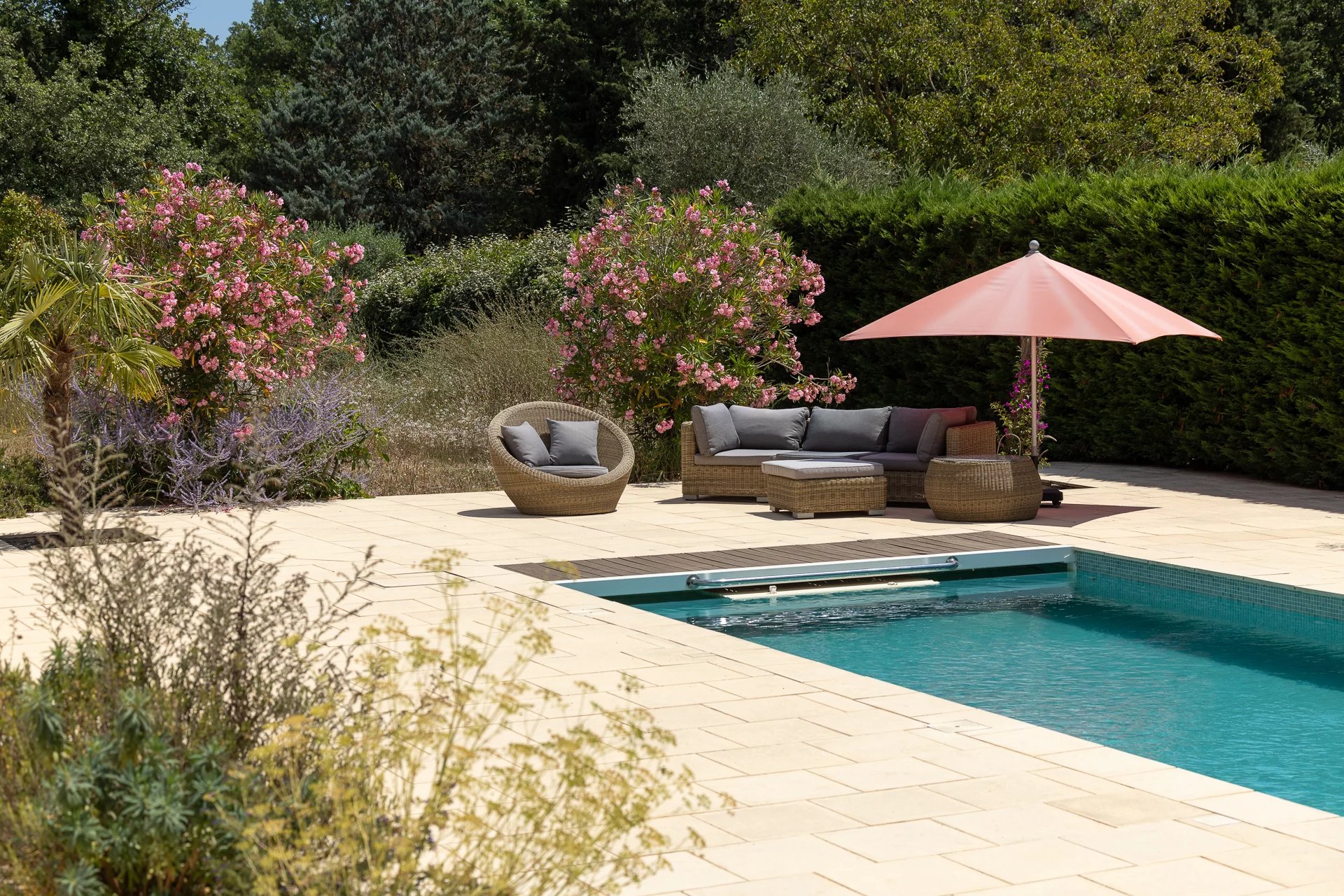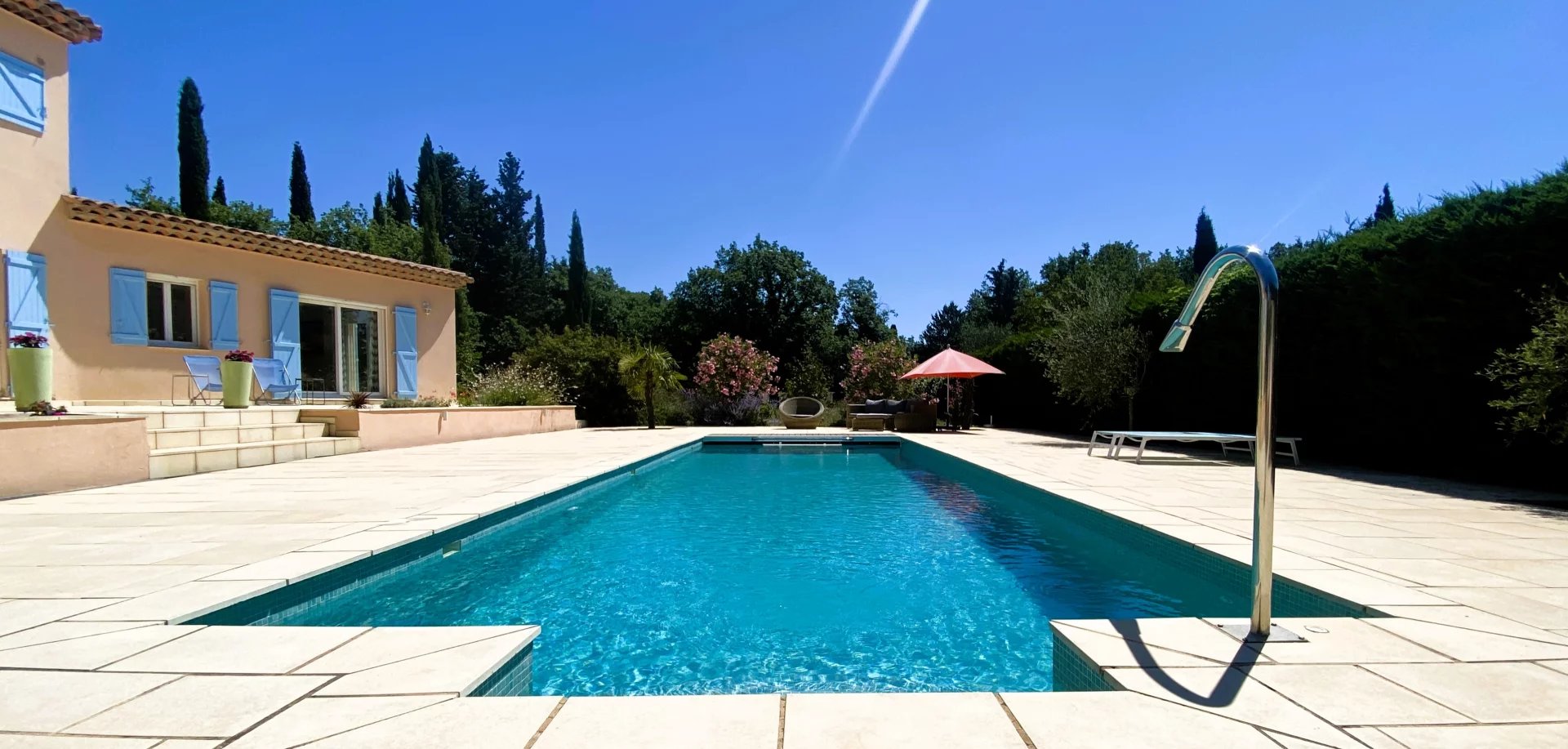 Learn moreUpstairs is the master bedroom (18sqm) with en suite shower room. The pool house with its toilet, the open-plan yoga and meditation cabin, the outdoor jaccuzzi and the shady woodland area at the rear of the property are all worth a visit. The swimming pool is heated by a heat pump and is not overlooked. The garden is irrigated and planted with fruit trees, lavender and everything that makes Provence so charming. Parking for several vehicles and easy access. A relaxing atmosphere full of good vibes and light, but also cool thanks to the surrounding wooded "decorum".