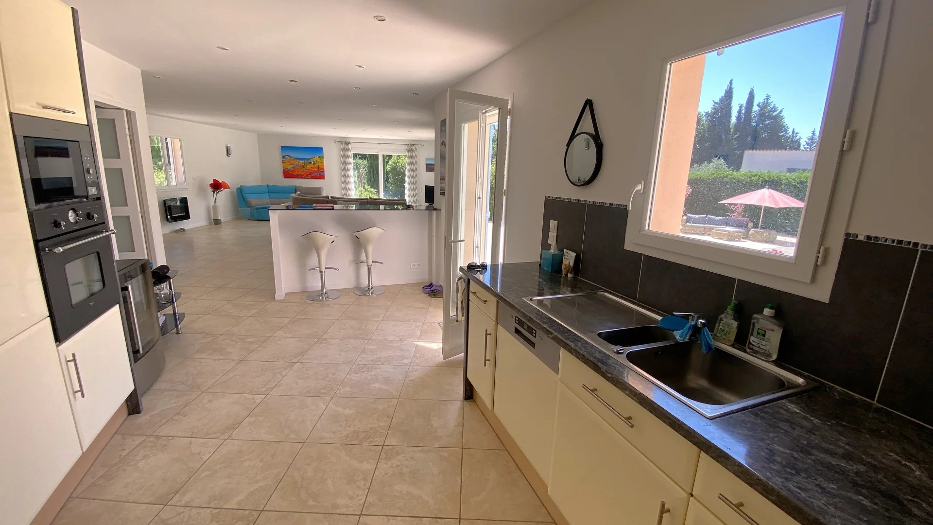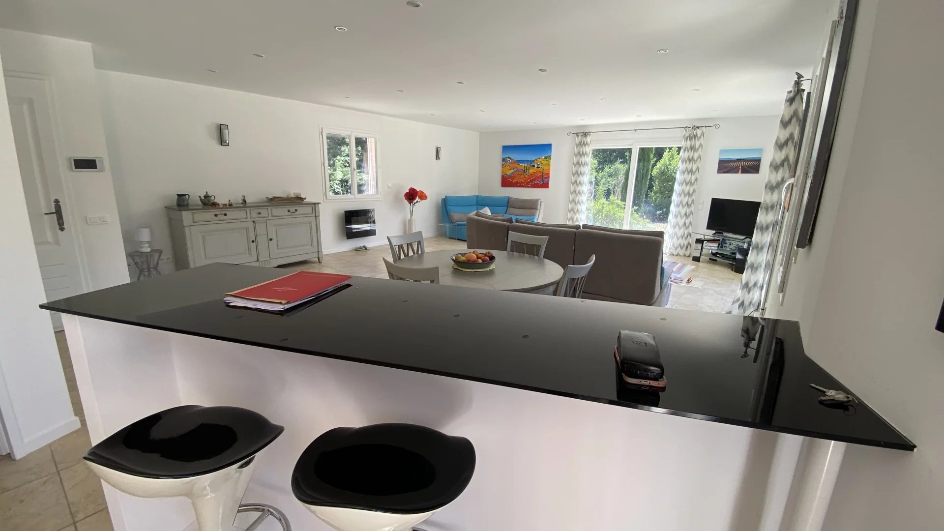 Upstairs is the master bedroom (18sqm) with en suite shower room. The pool house with its toilet, the open-plan yoga and meditation cabin, the outdoor jaccuzzi and the shady woodland area at the rear of the property are all worth a visit. The swimming pool is heated by a heat pump and is not overlooked. The garden is irrigated and planted with fruit trees, lavender and everything that makes Provence so charming. Parking for several vehicles and easy access. A relaxing atmosphere full of good vibes and light, but also cool thanks to the surrounding wooded "decorum".