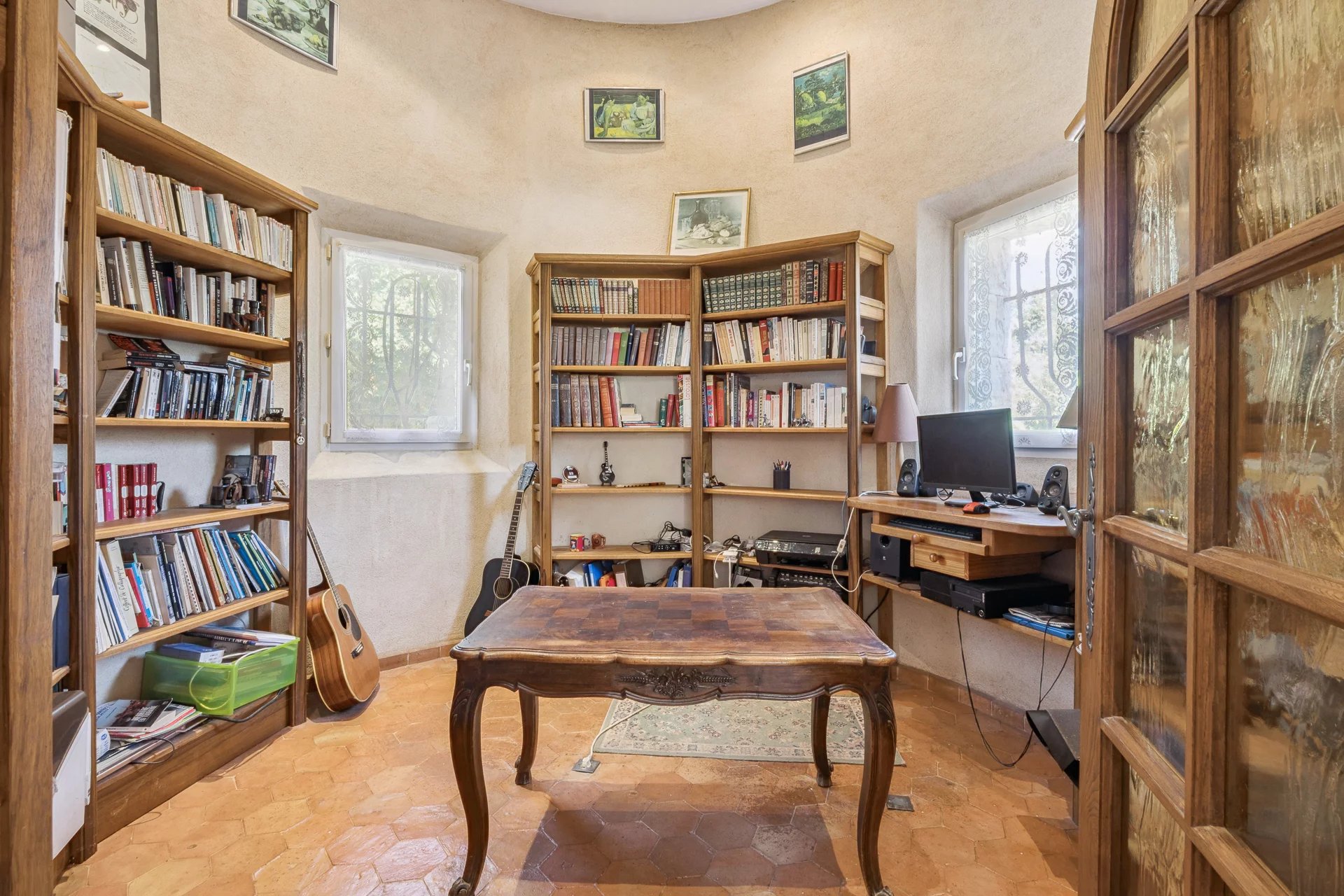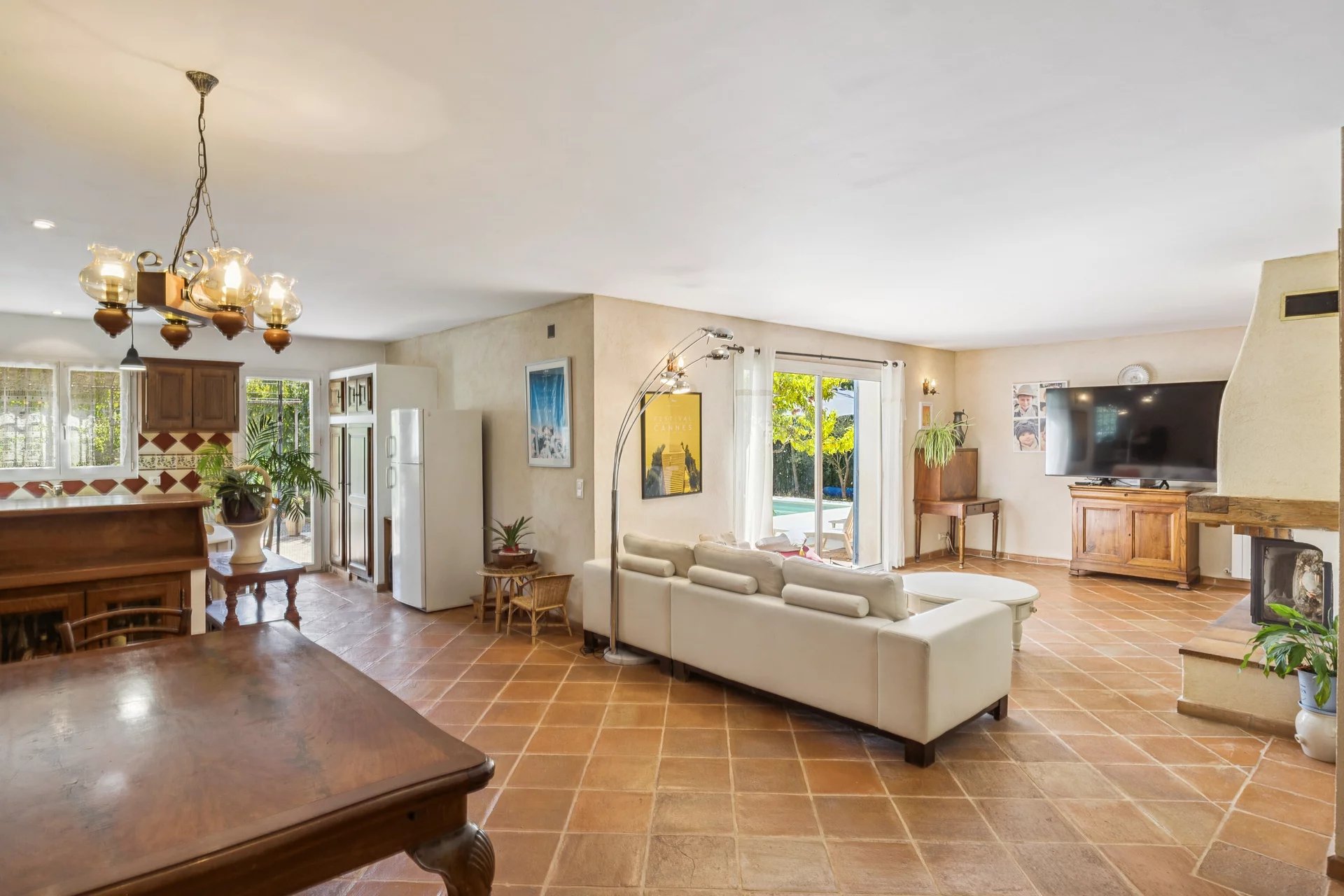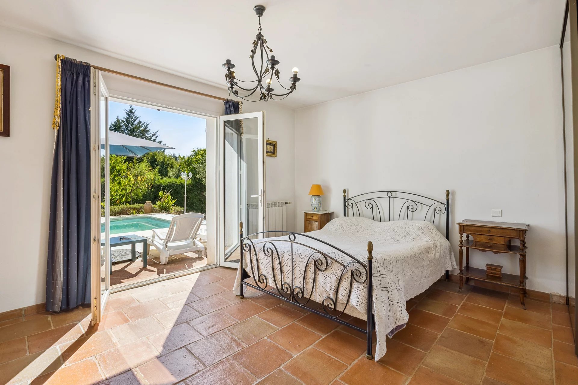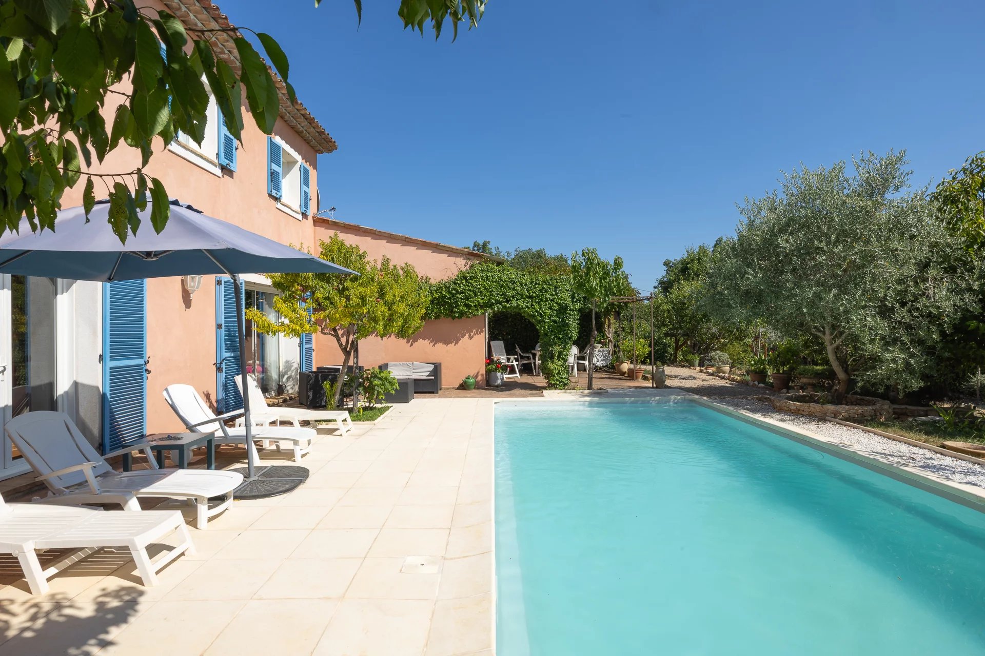 It offers generous single-level living spaces, with a bright living area opening onto the terrace and the swimming pool. Four bedrooms, including one on the garden level, provide the perfect accommodation for family and friends. The floors and walls are adorned with Salernes terracotta tiles and faience, a guarantee of meticulous finishes and preserved authenticity.