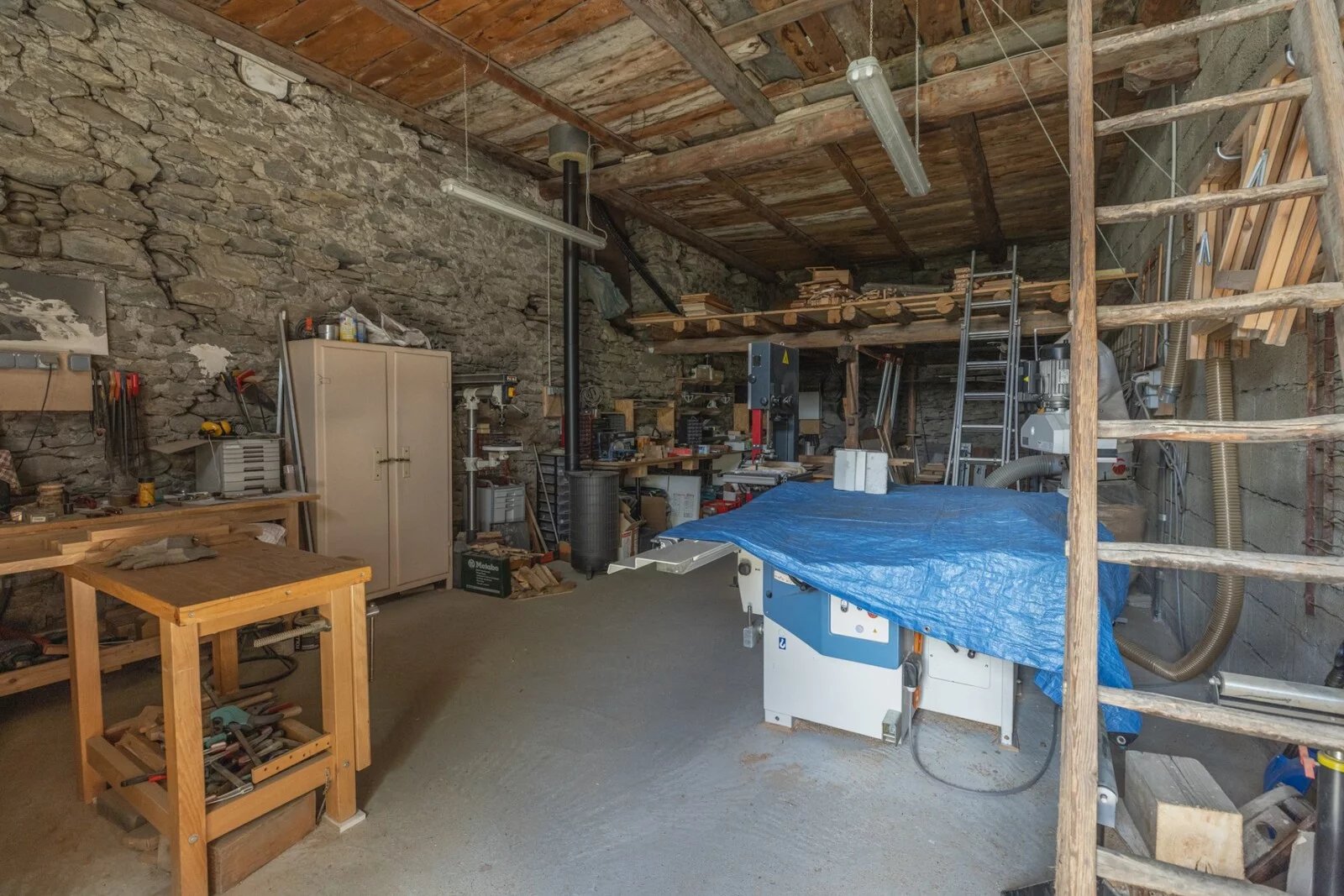 The property comprises the living house, an adjoining barn with a floor surface area of 53sq.m and a ridge height of almost 10 meters (currently used as a carpentry workshop), a large terrace of over 60sq.m, a large garage of almost 60sq.m, a healthy cellar of over 20sq.m and a garden.