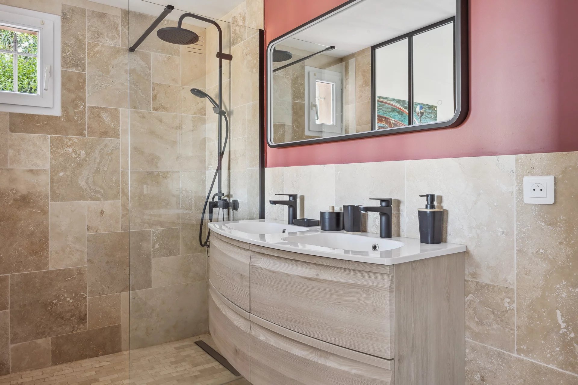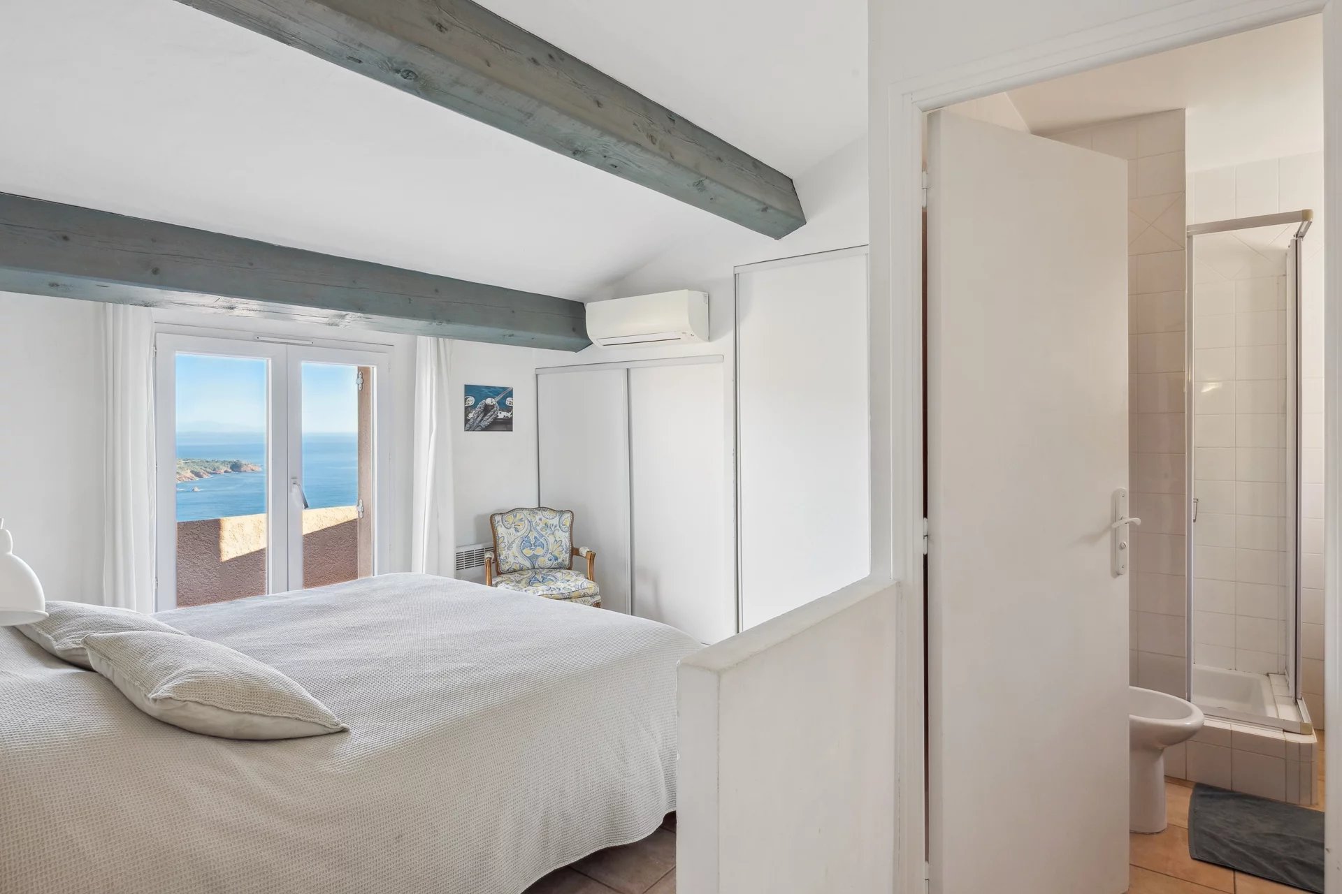 The first part of the villa includes a vast living/dining room opening onto a terrace, an equipped kitchen, a laundry room, 4 bedrooms including 2 master suites. The second also offers a cosy living/dining area opening onto a terrace, a fitted kitchen, 3 bedrooms including 2 master suites. The property is set on the land of over 1,900 m² planted with Mediterranean trees, with an infinity pool and two garages. Just a few minutes from Agay shops and 50 minutes from Cannes-Mandelieu airport.