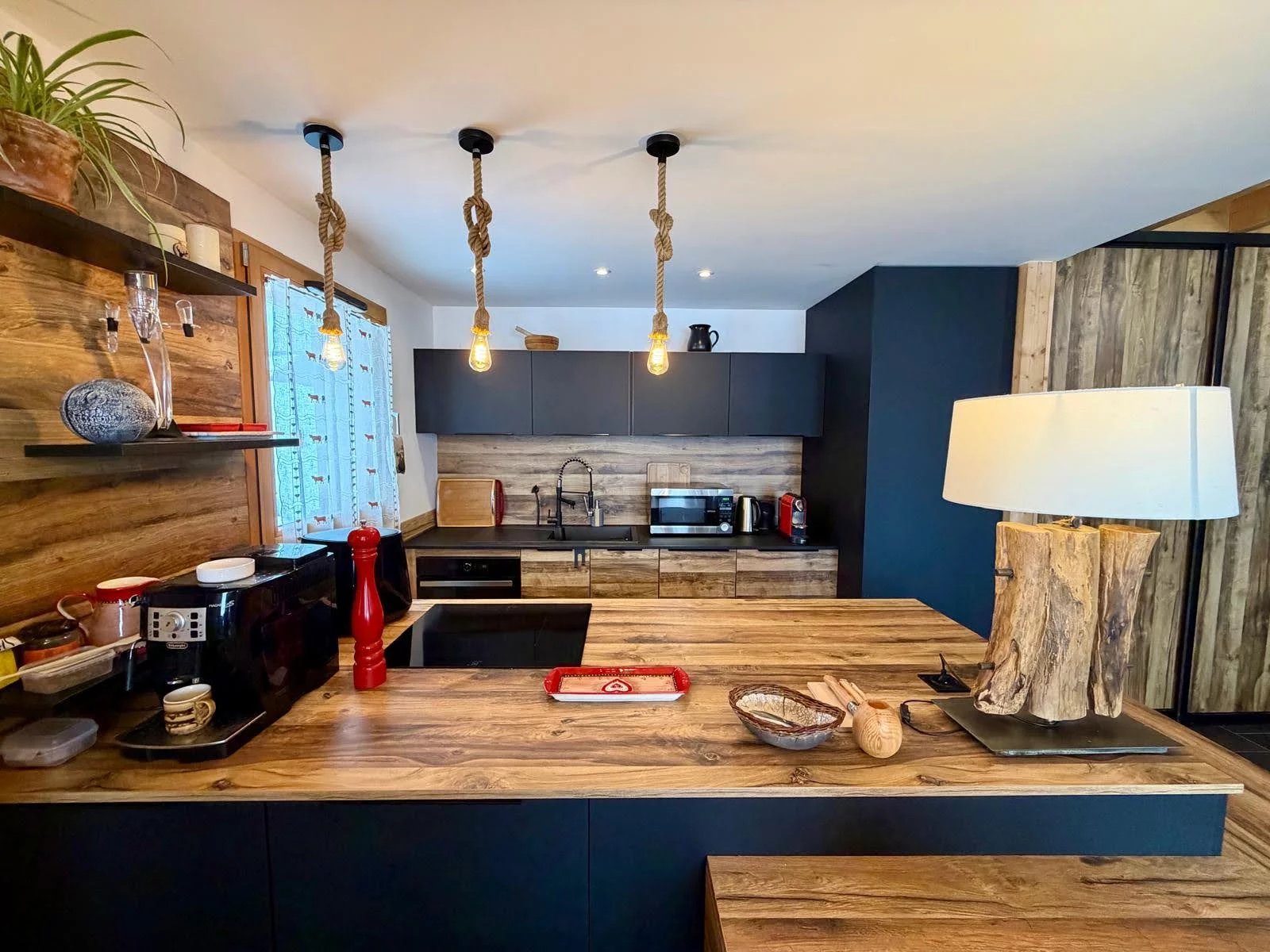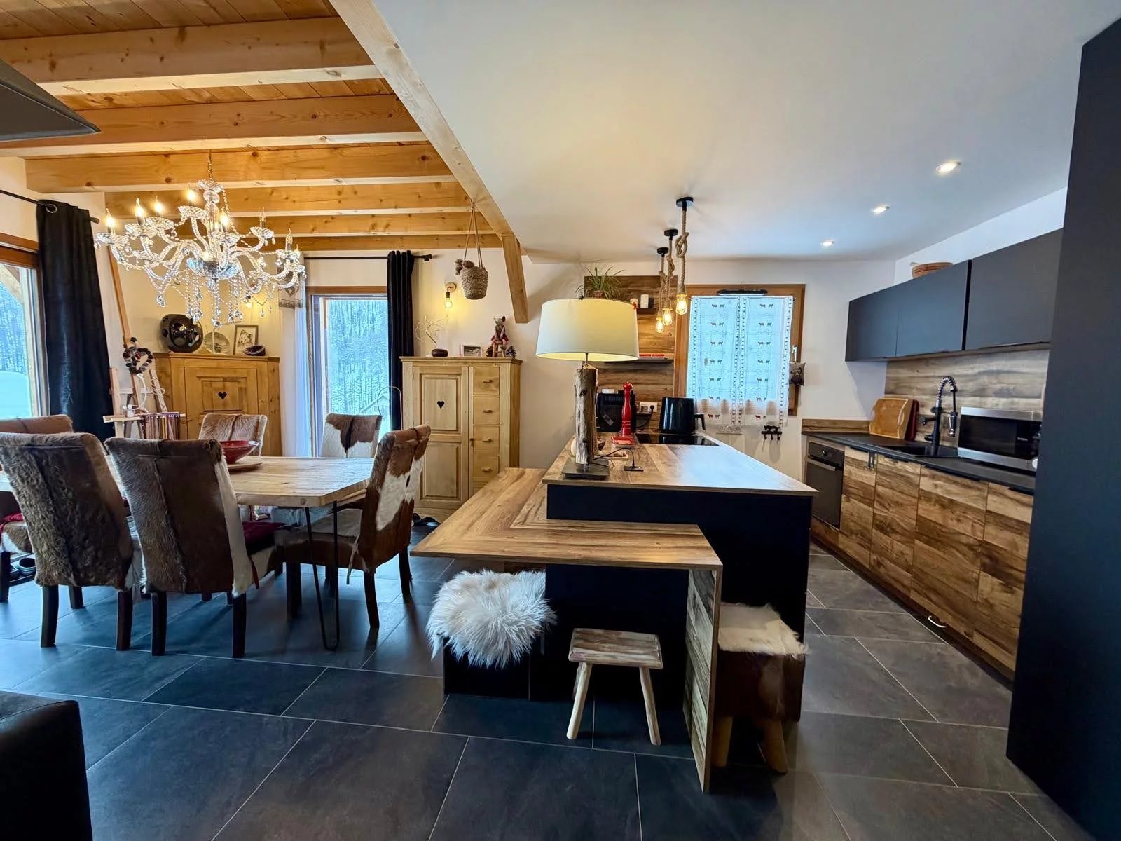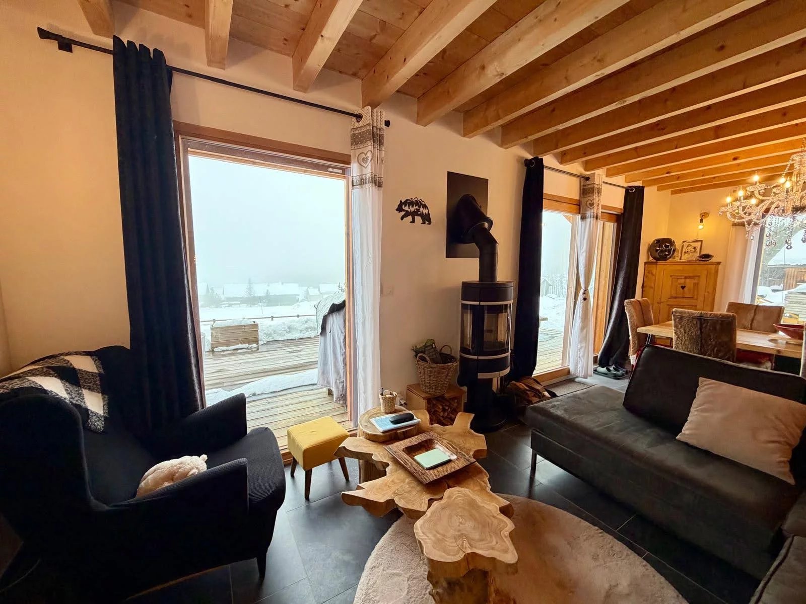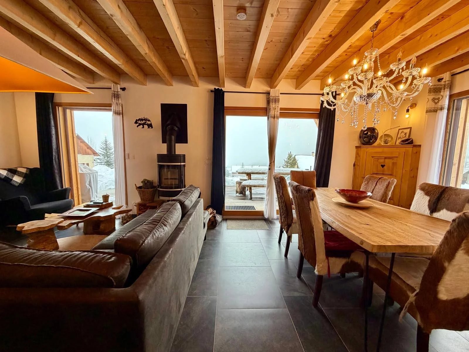 As soon as you cross the threshold, the delicate scent of new wood welcomes you into a vast, light-filled living room, where each window frames a breathtaking view of the valley like a work of art in motion. The sleek, fully equipped Schmidt kitchen is perfect for sharing meals, while the crackling wood-burning stove provides authentic warmth, complemented by a discreet and efficient heat pump.