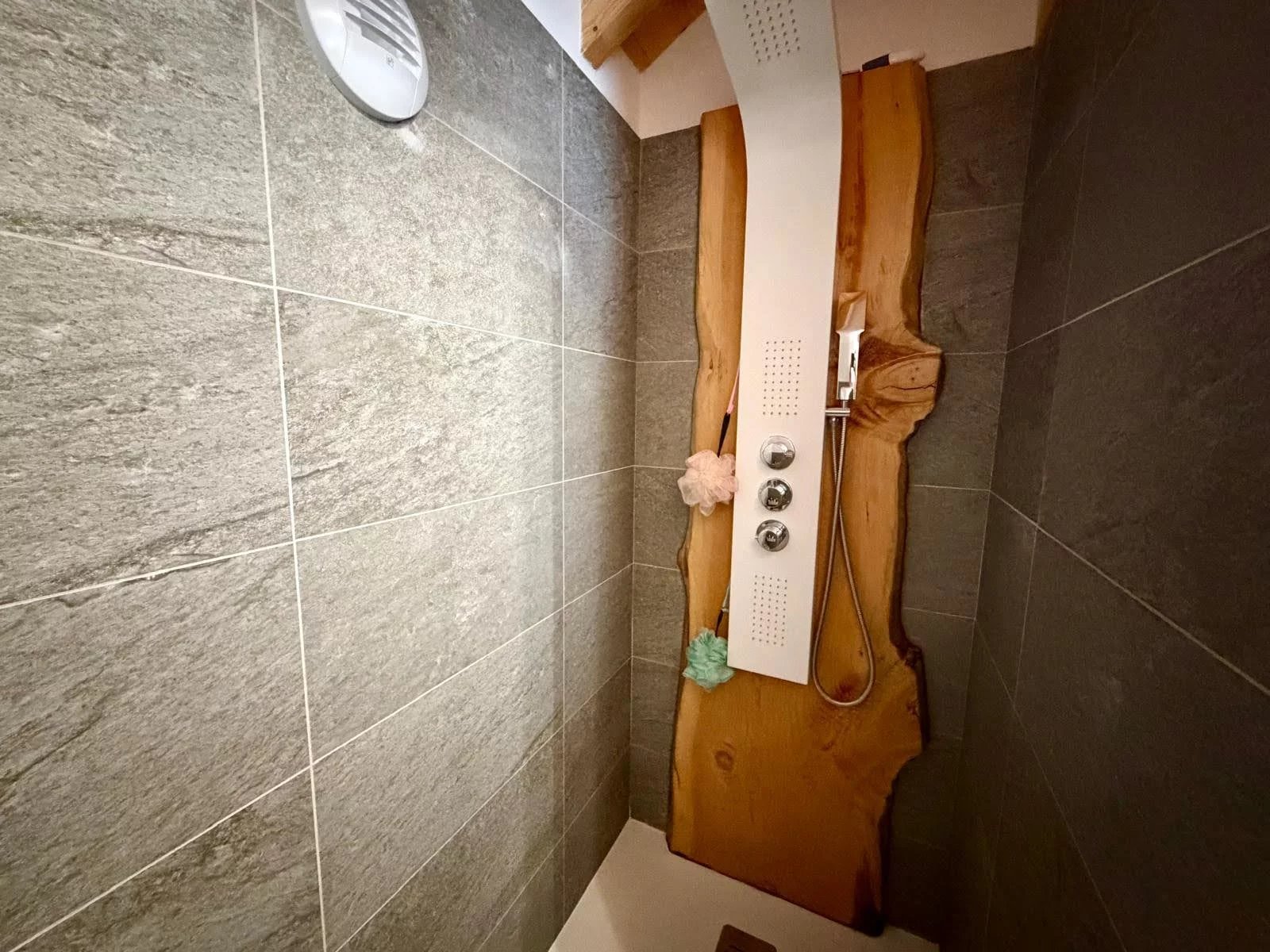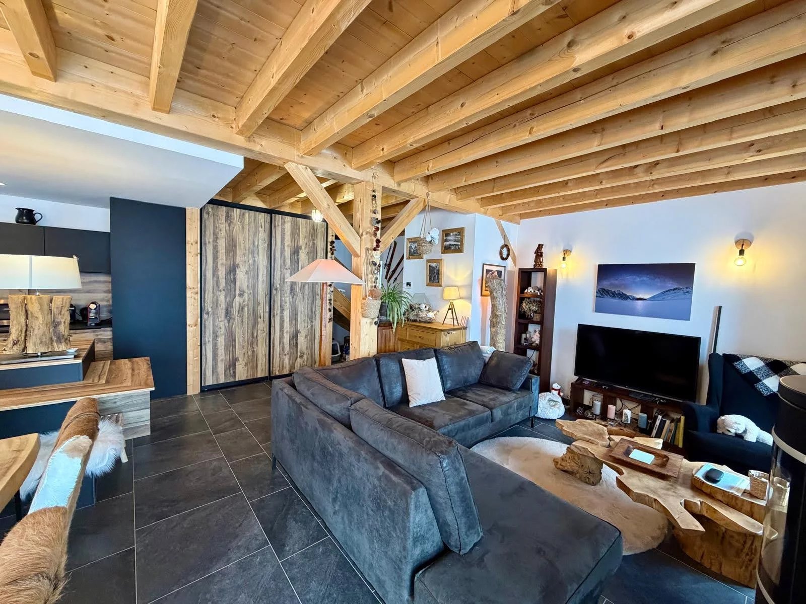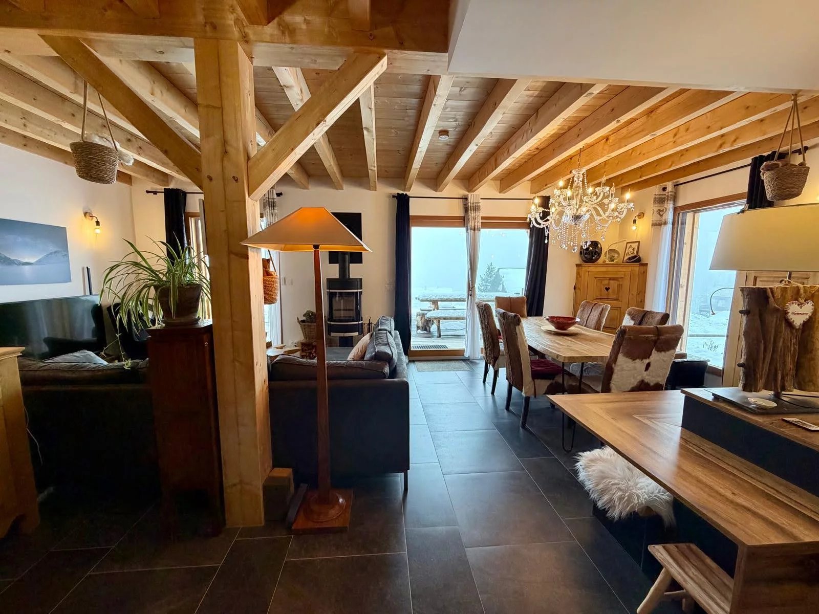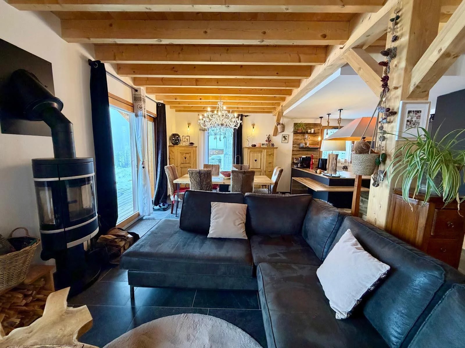 As soon as you cross the threshold, the delicate scent of new wood welcomes you into a vast, light-filled living room, where each window frames a breathtaking view of the valley like a work of art in motion. The sleek, fully equipped Schmidt kitchen is perfect for sharing meals, while the crackling wood-burning stove provides authentic warmth, complemented by a discreet and efficient heat pump.