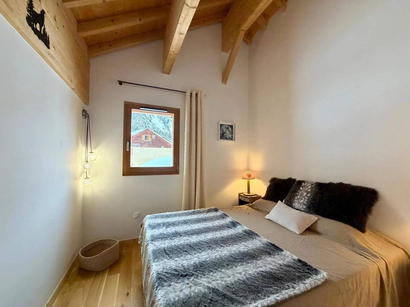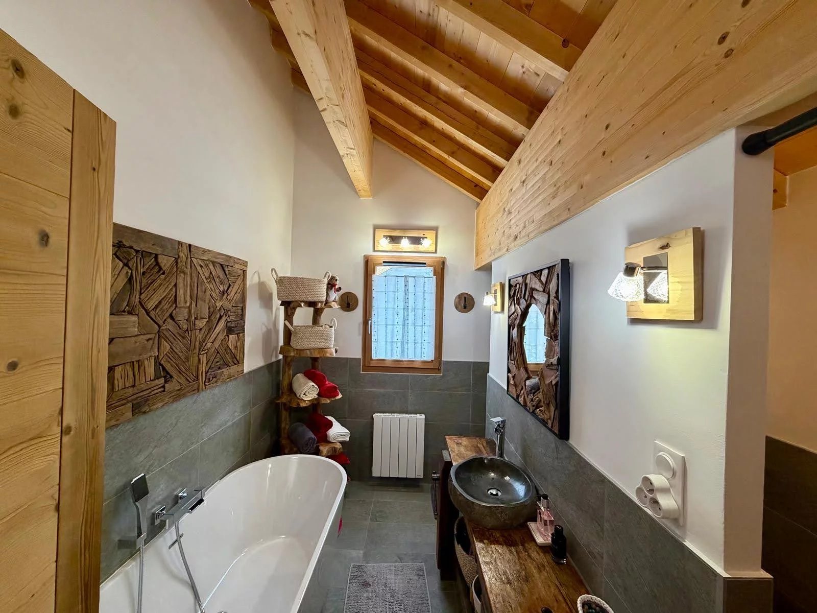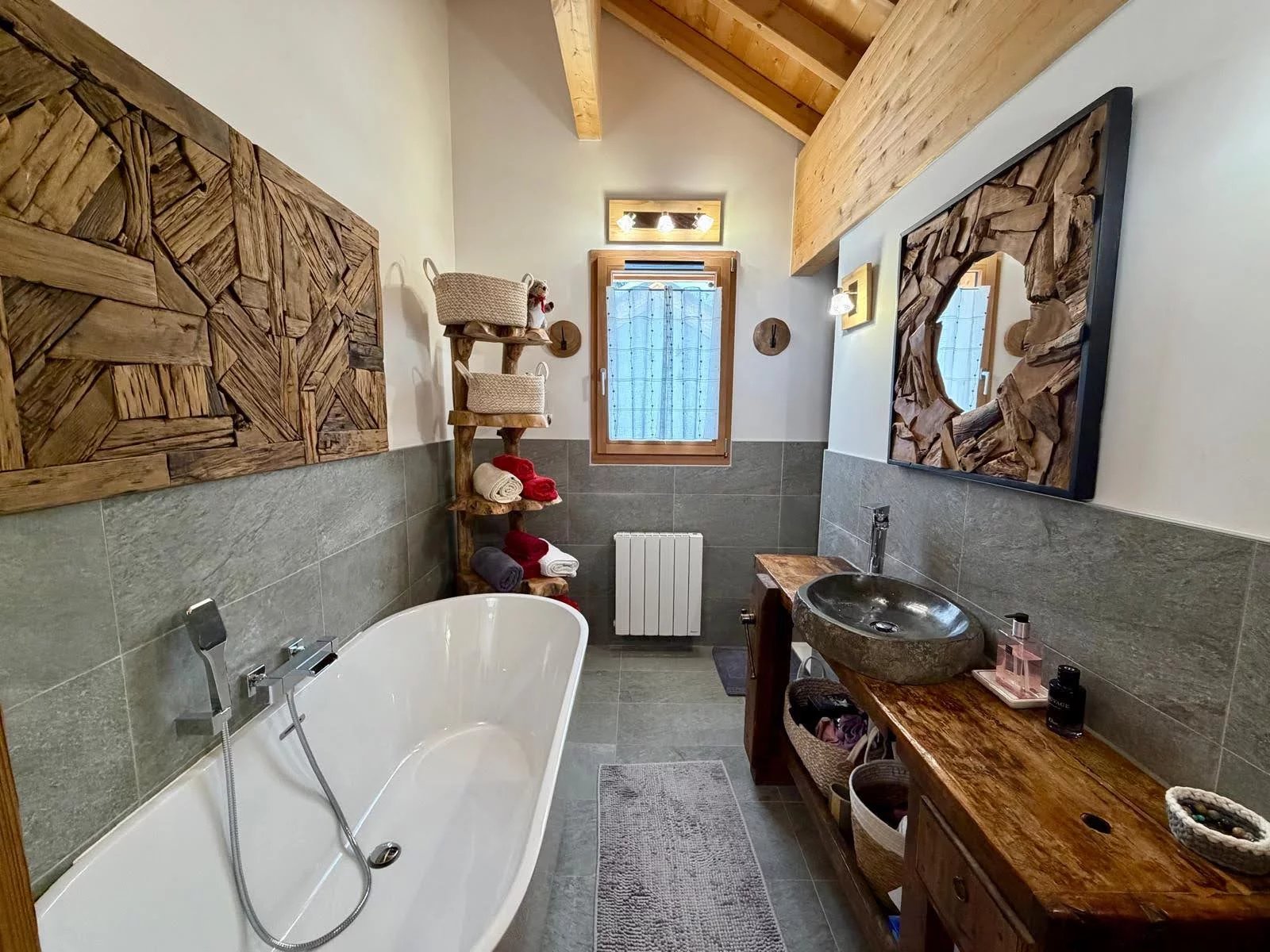 The sleeping area has been designed for the tranquility of mountain evenings. It comprises three inviting bedrooms offering six comfortable beds, as well as a versatile room that can be transformed to suit your needs: a peaceful office, a guest bedroom, or even a yoga space. A full bathroom, complete with a shower and bathtub, invites relaxation after a day in the great outdoors.
