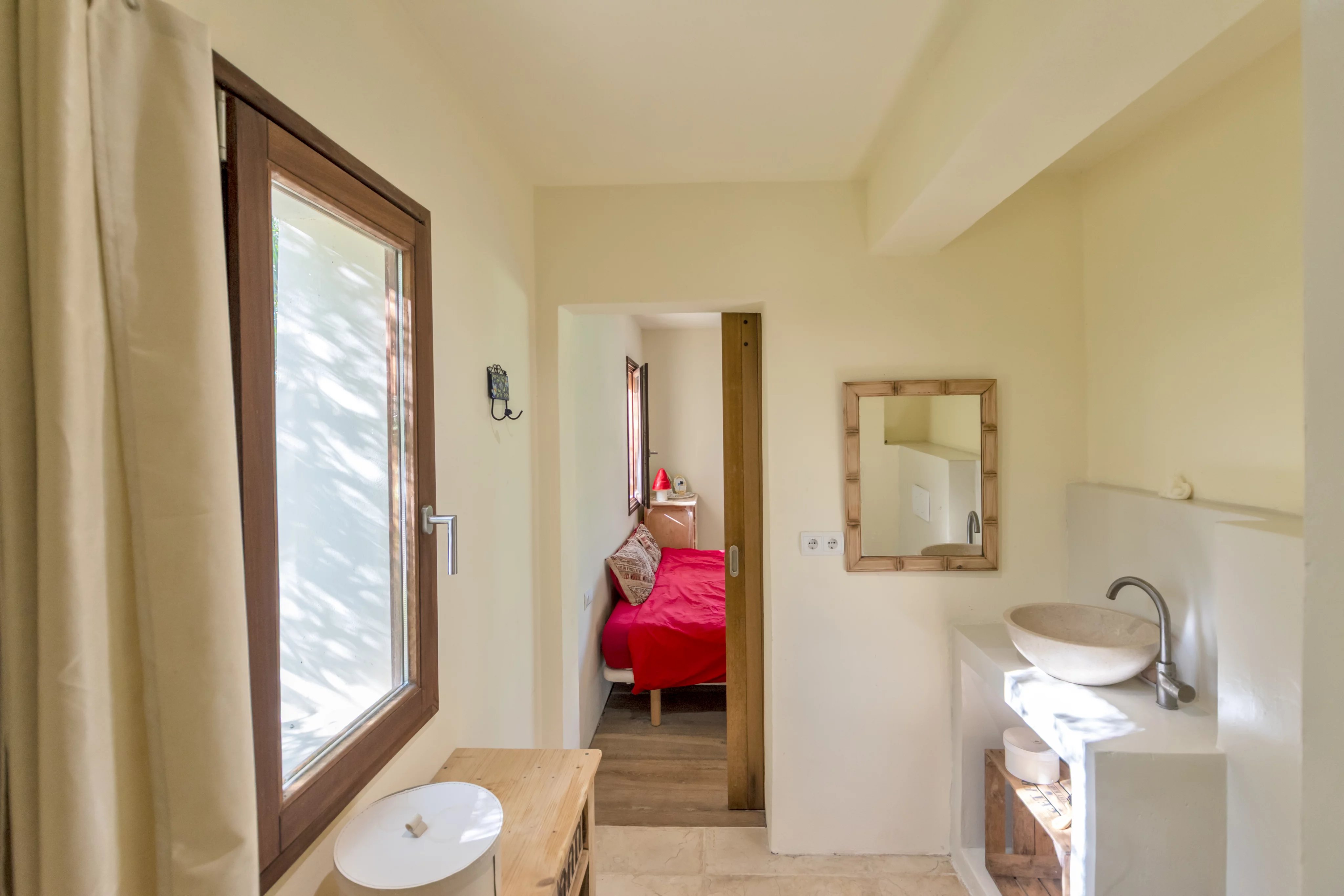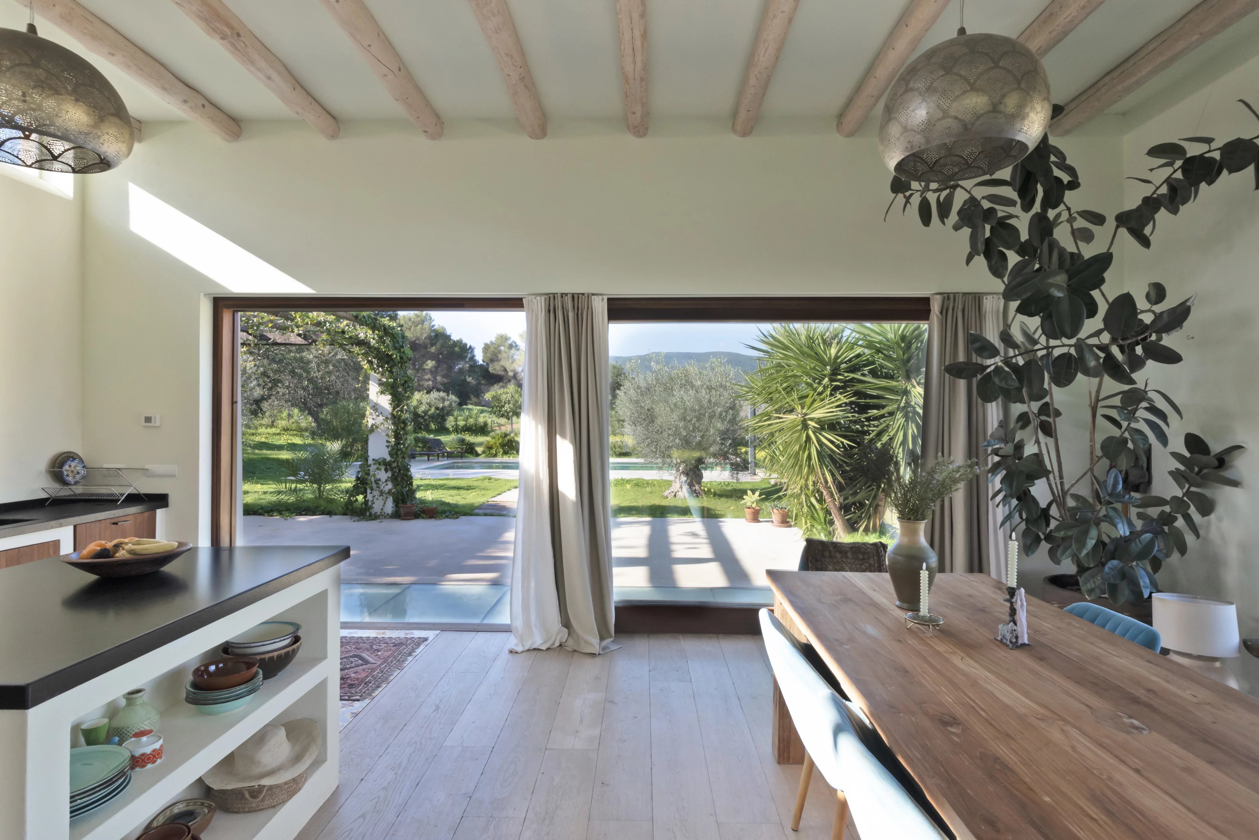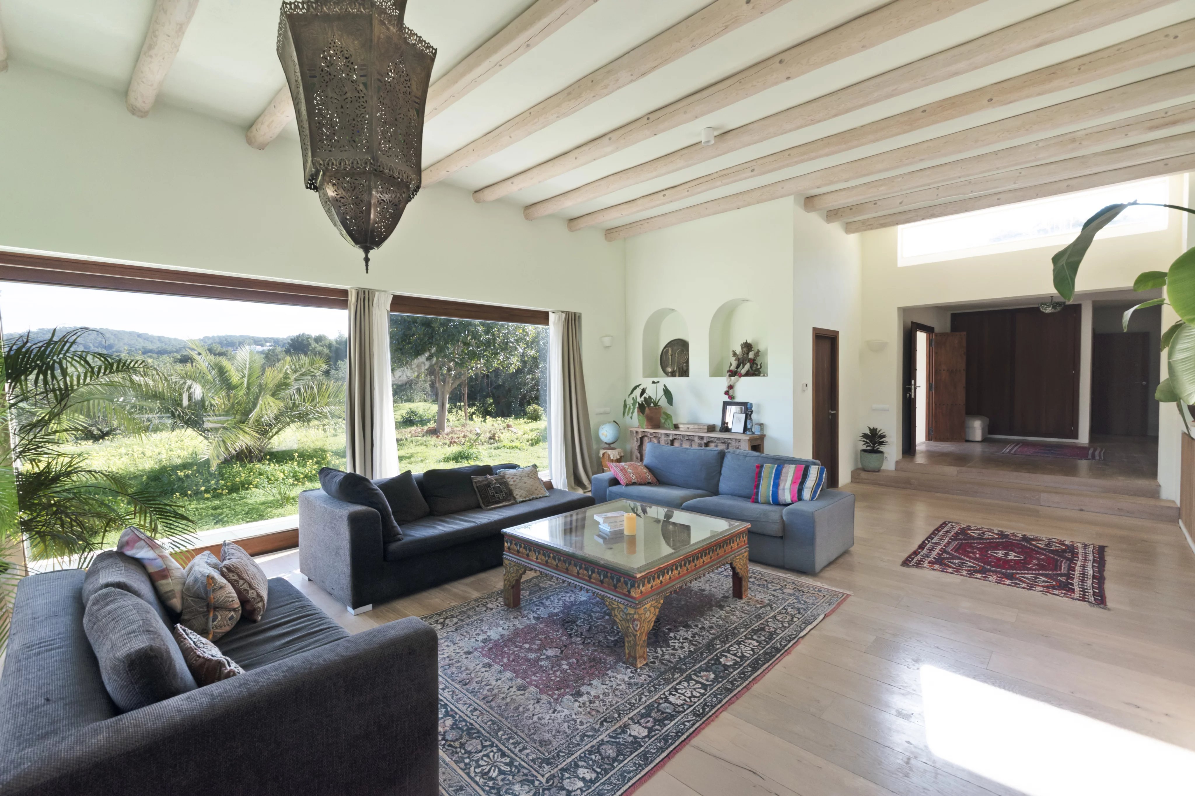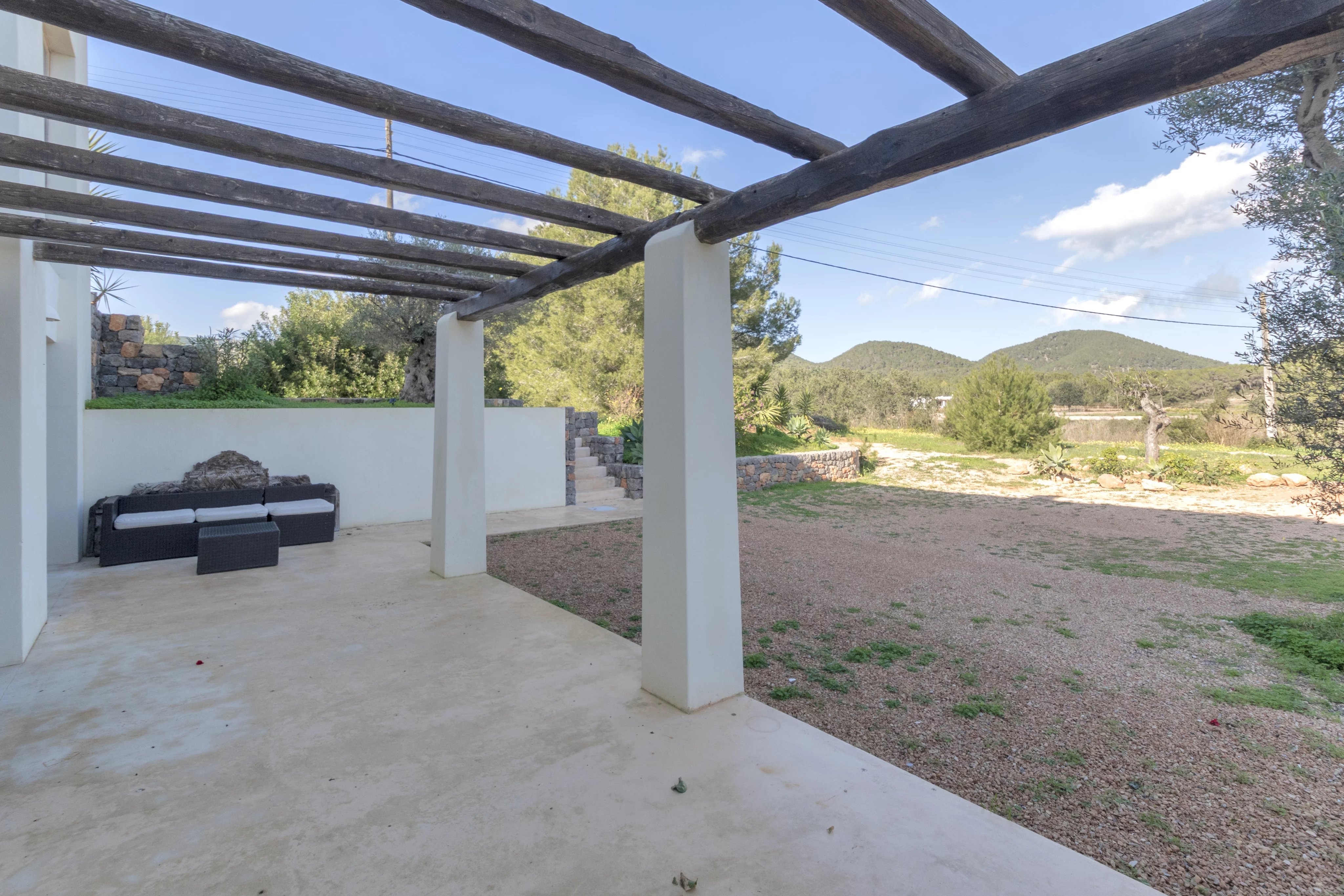 The main house is laid out on a single level with 3.75-meter-high ceilings and features a spacious entrance hall, 4 bedrooms, 3 full bathrooms, and a guest toilet. The living-dining room, with beam ceilings and 6-meter-high windows, offers panoramic views of the extensive grounds and Ibiza’s mountains. The open-plan kitchen connects to the terrace, garden, and private pool, creating a perfect space for daily living and entertaining.