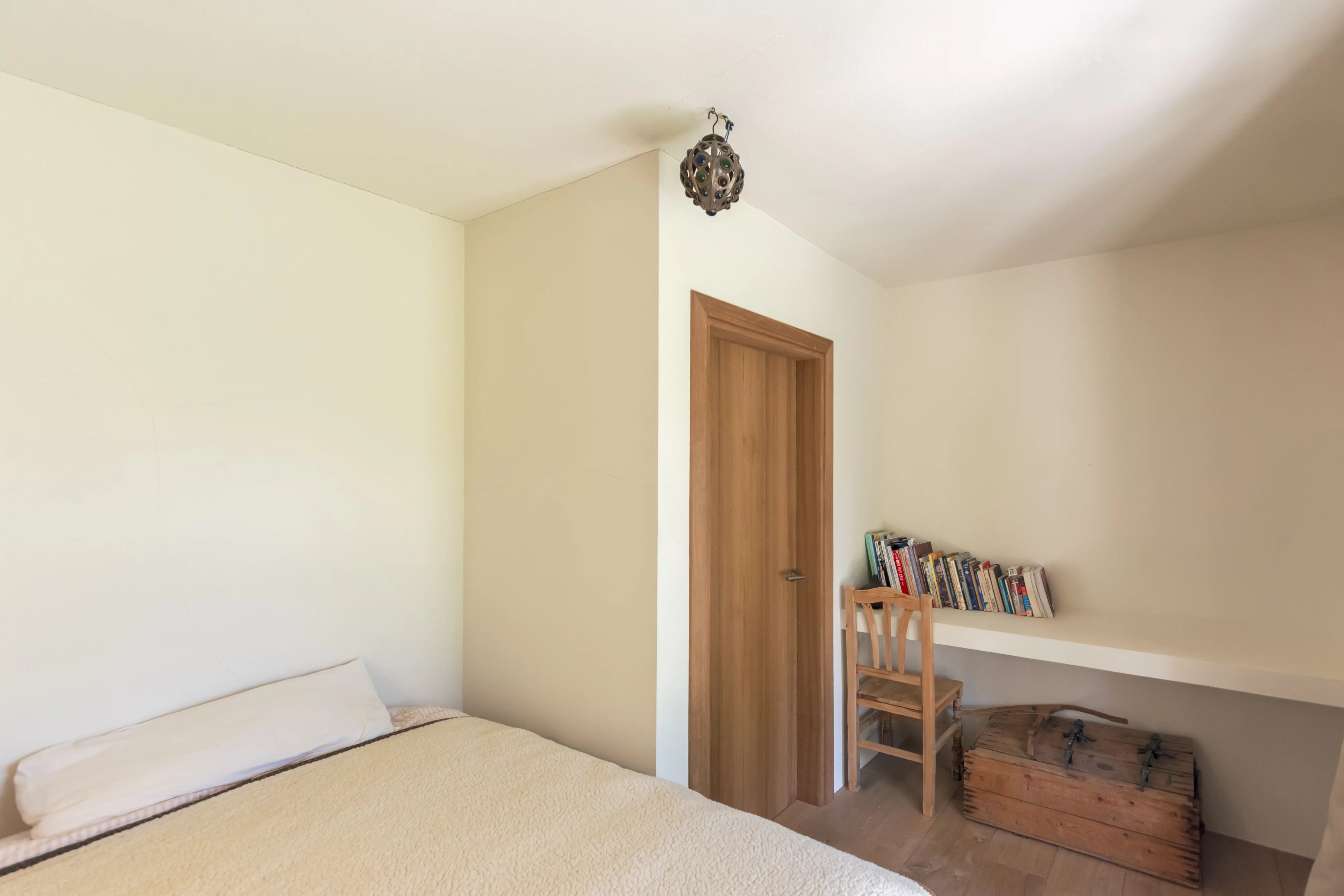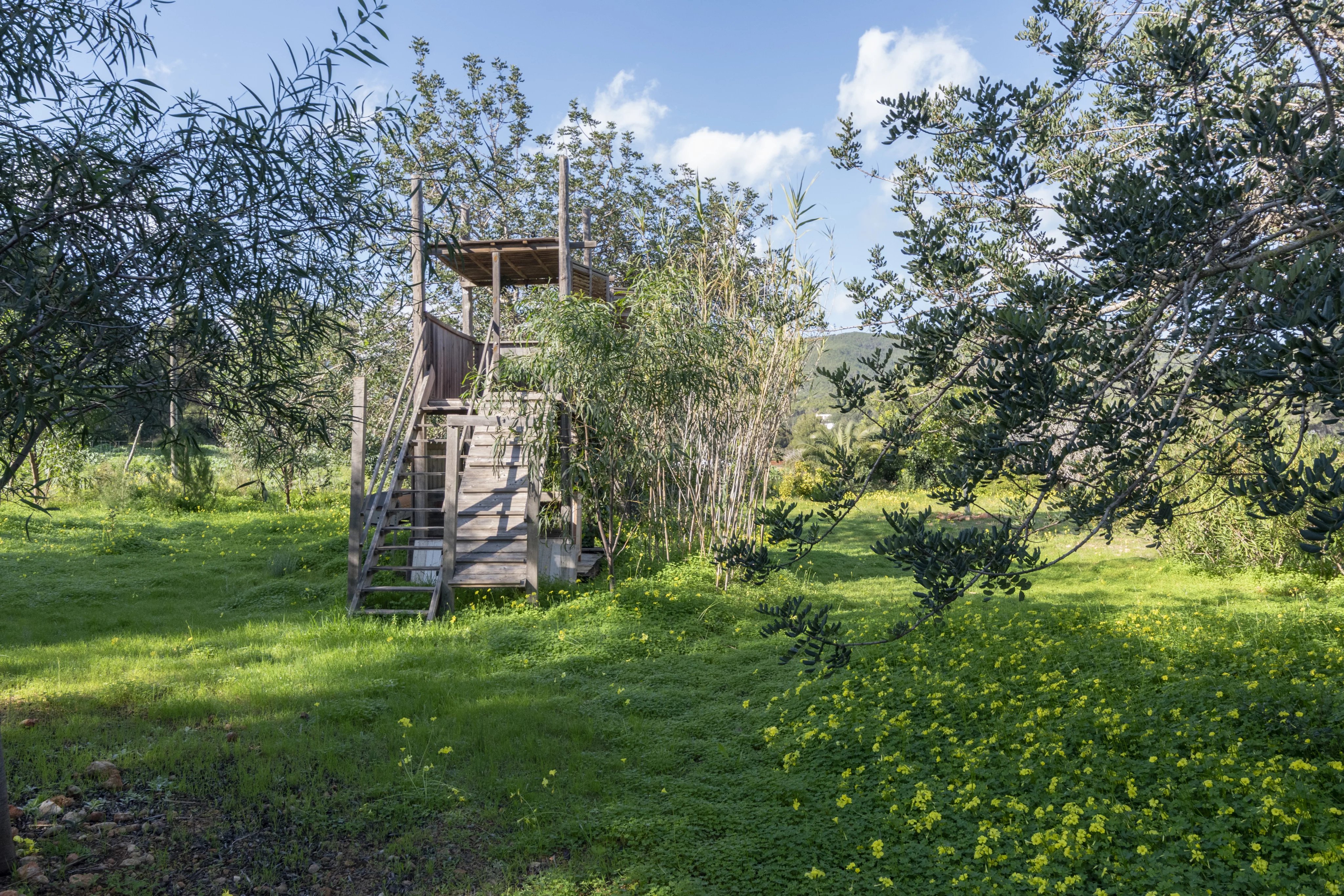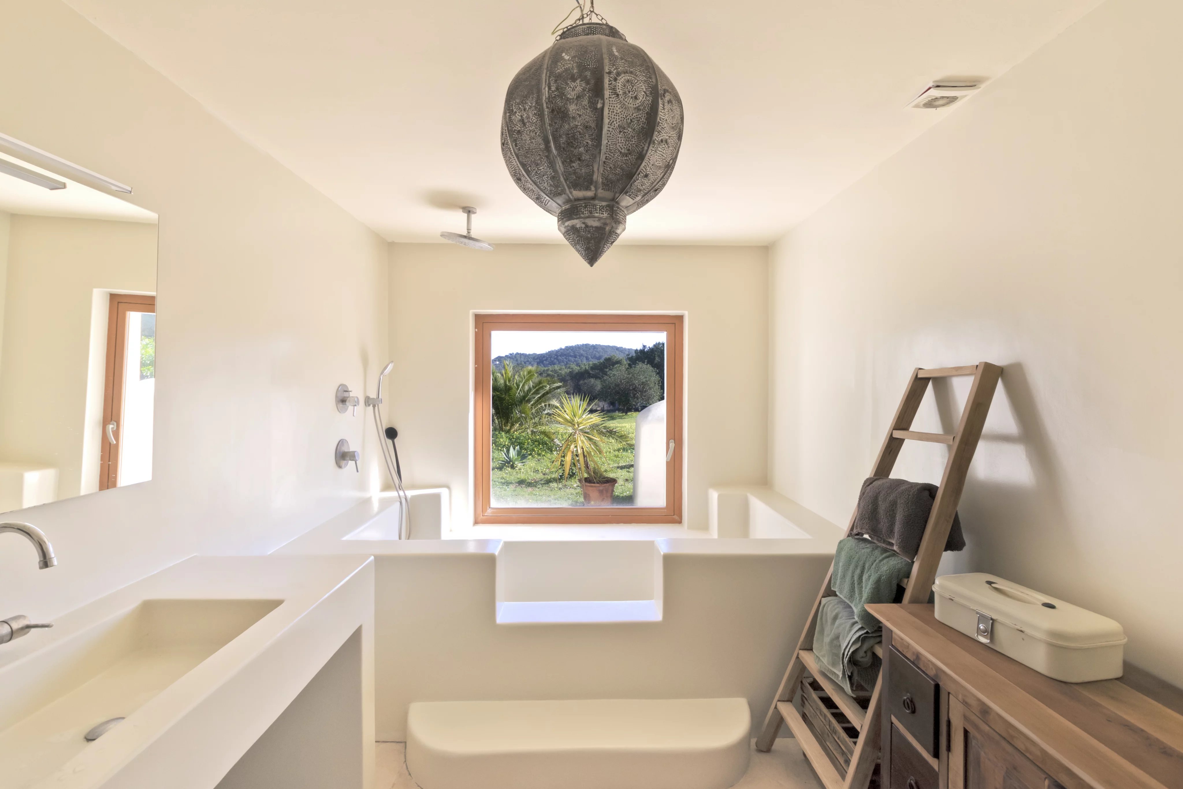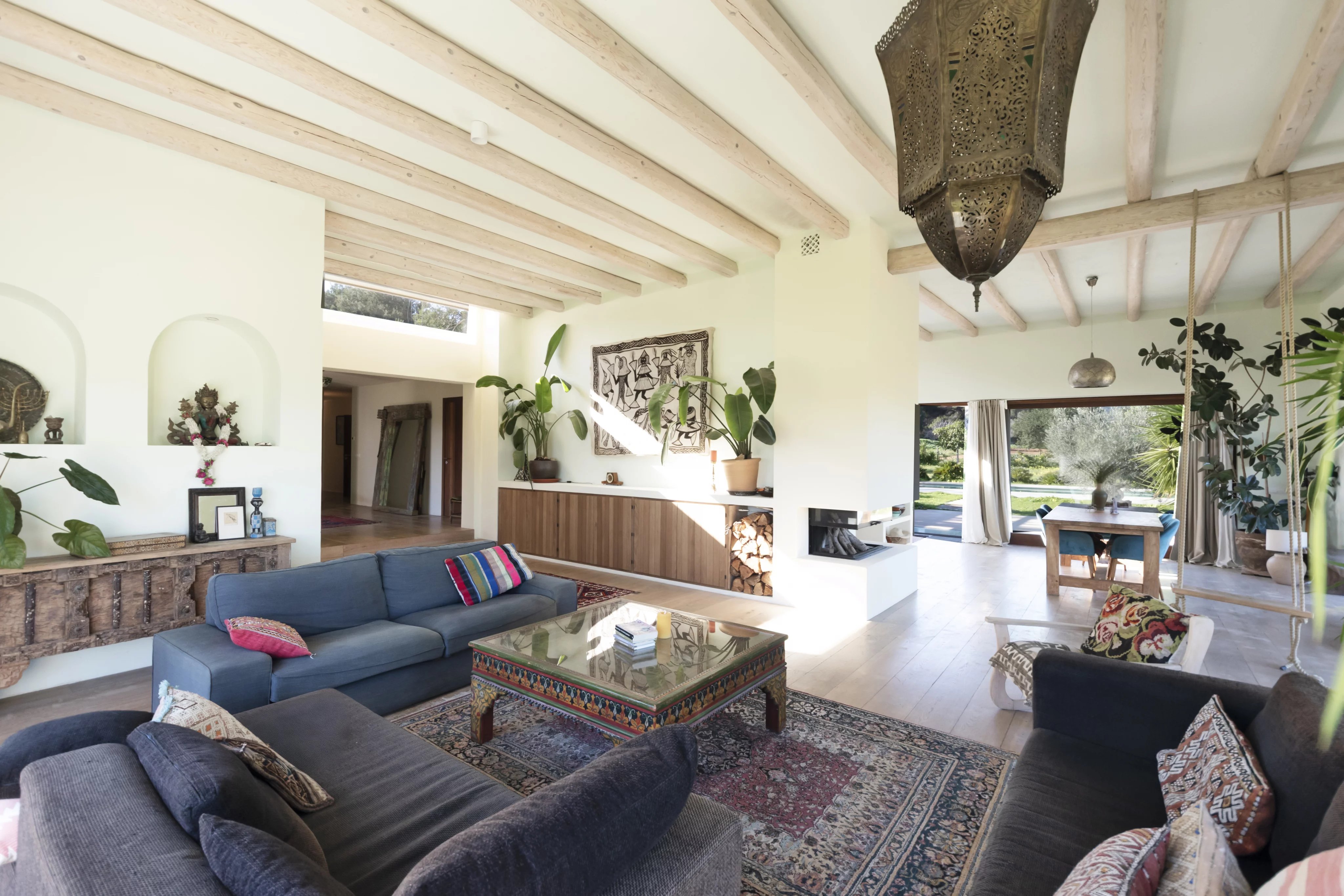 The main house is laid out on a single level with 3.75-meter-high ceilings and features a spacious entrance hall, 4 bedrooms, 3 full bathrooms, and a guest toilet. The living-dining room, with beam ceilings and 6-meter-high windows, offers panoramic views of the extensive grounds and Ibiza’s mountains. The open-plan kitchen connects to the terrace, garden, and private pool, creating a perfect space for daily living and entertaining.