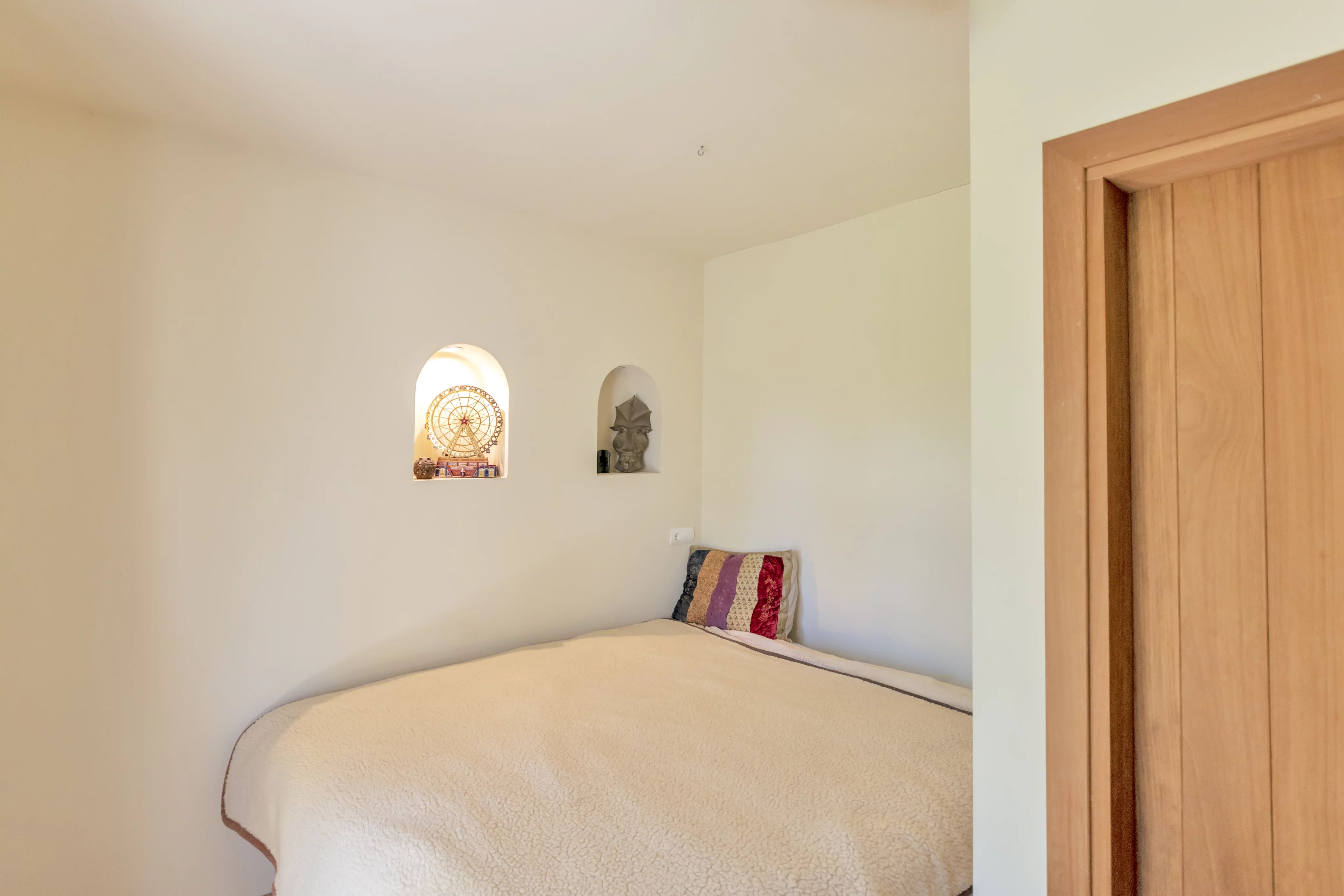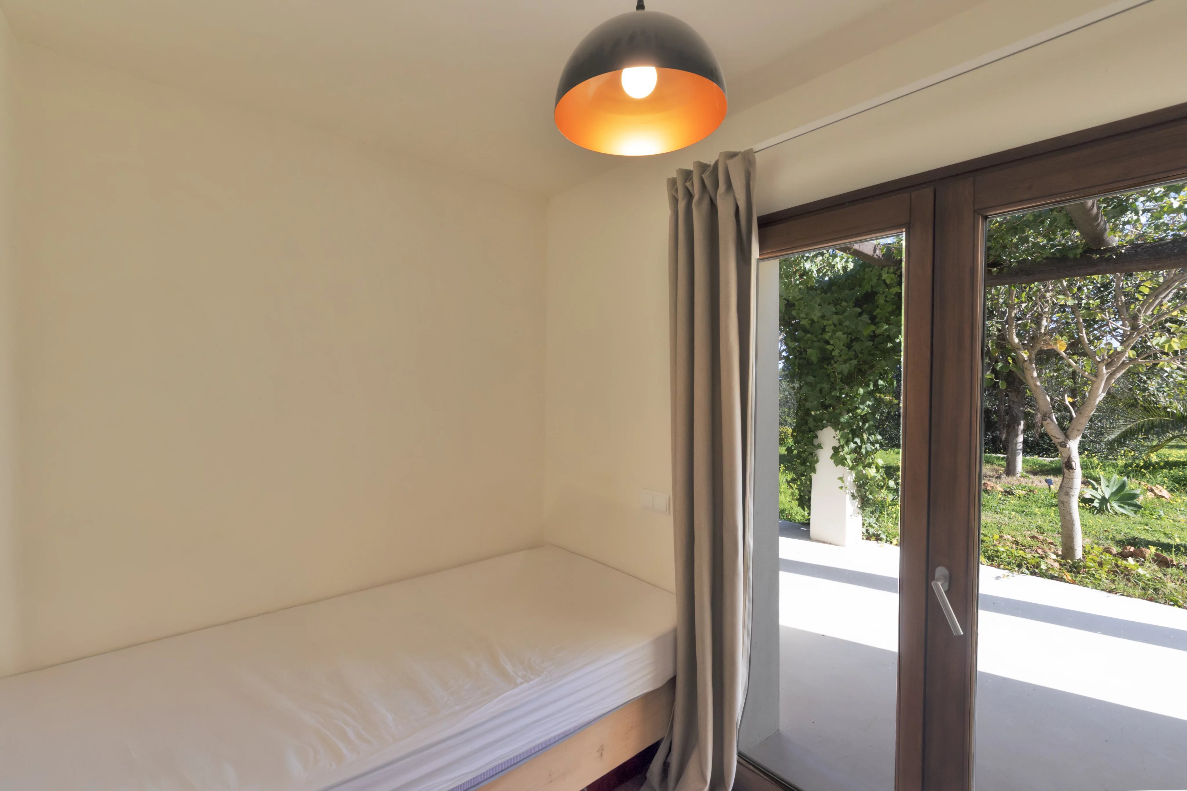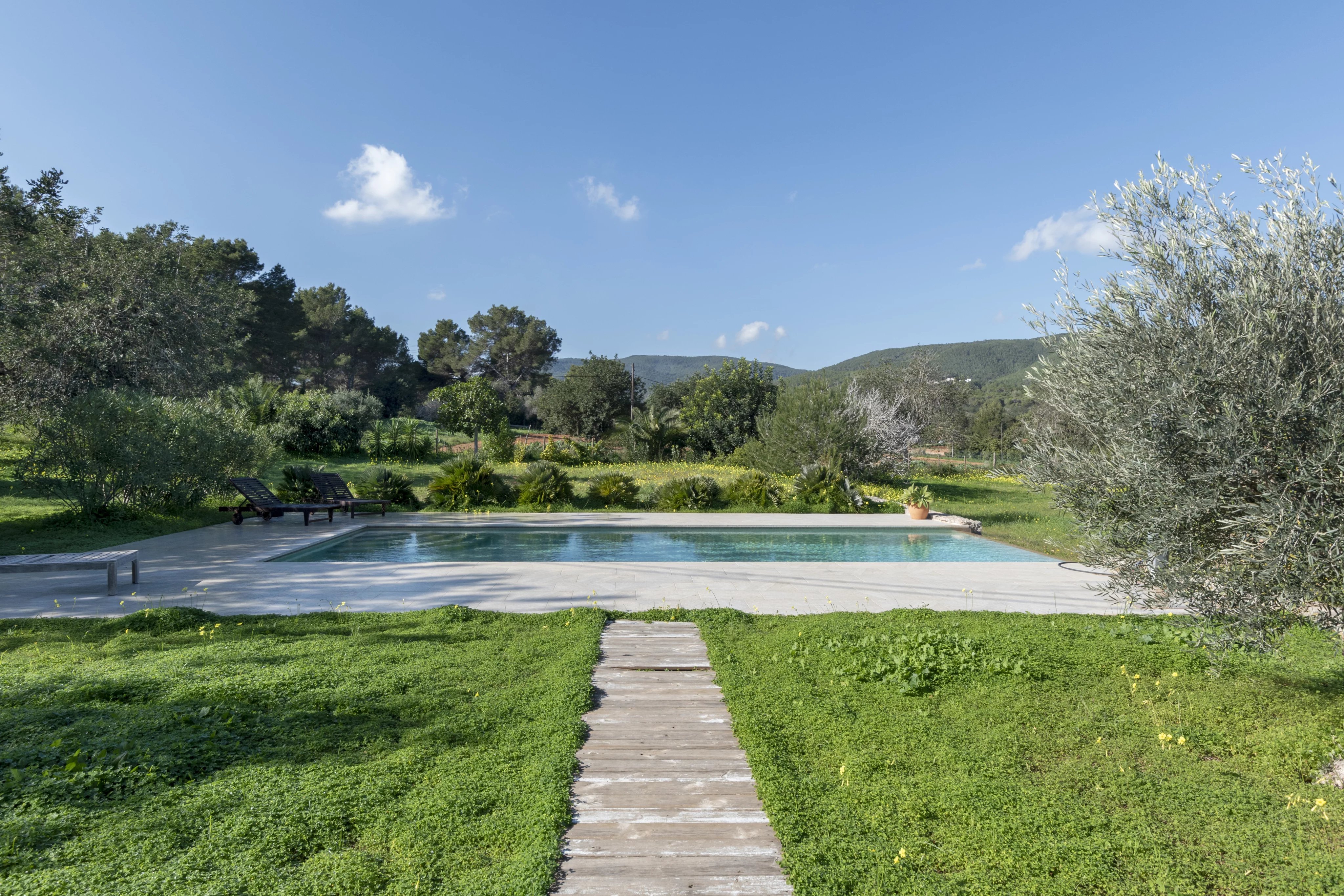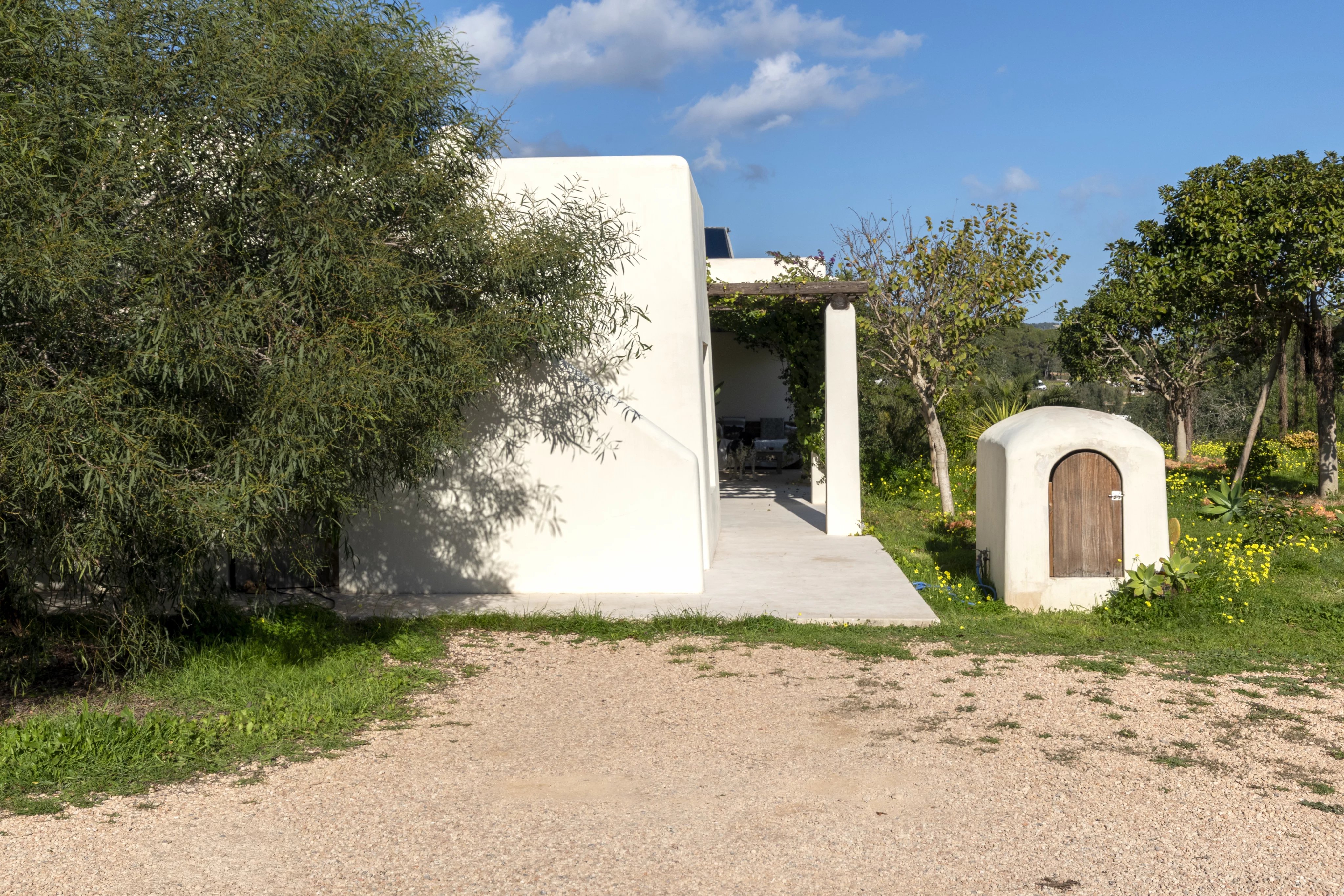 Learn moreThe main house is laid out on a single level with 3.75-meter-high ceilings and features a spacious entrance hall, 4 bedrooms, 3 full bathrooms, and a guest toilet. The living-dining room, with beam ceilings and 6-meter-high windows, offers panoramic views of the extensive grounds and Ibiza’s mountains. The open-plan kitchen connects to the terrace, garden, and private pool, creating a perfect space for daily living and entertaining.