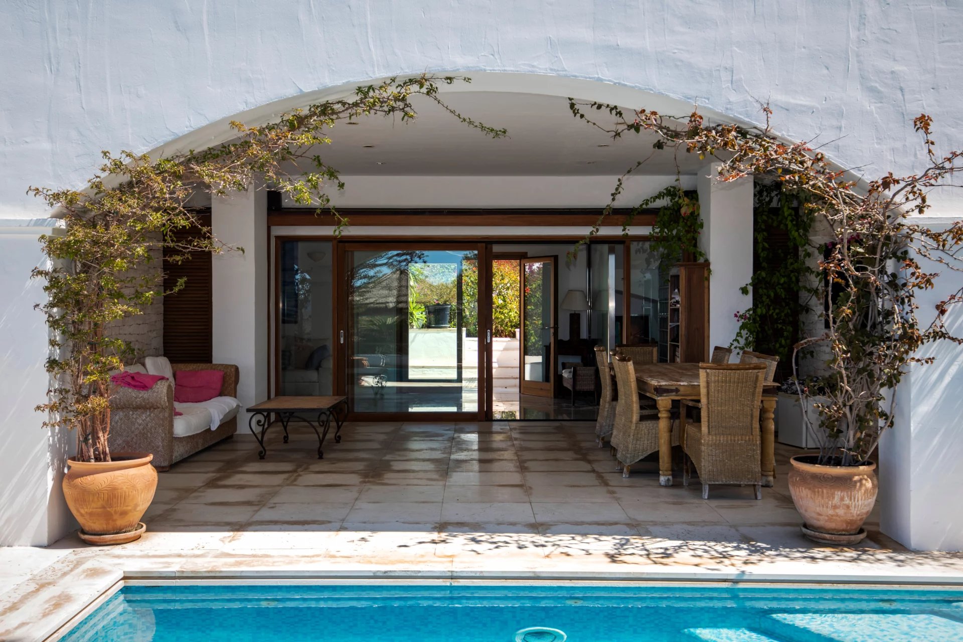 The property consists of three adjacent luxury villas - one in the romantic old Ibiza style, one in a modern holiday style and one with a guest house and housekeepers - all comes with 9 bedrooms, 8 bathrooms, spacious living areas, library, sauna, Jacuzzi.