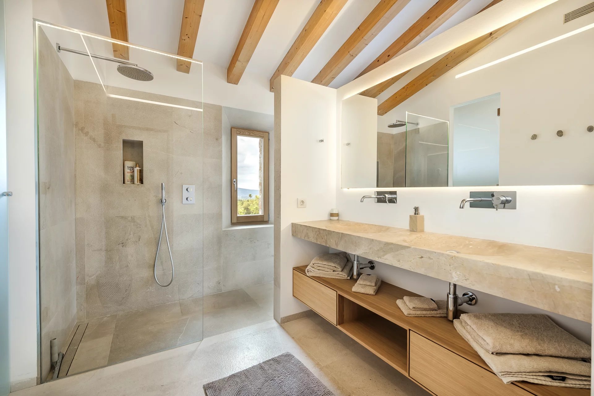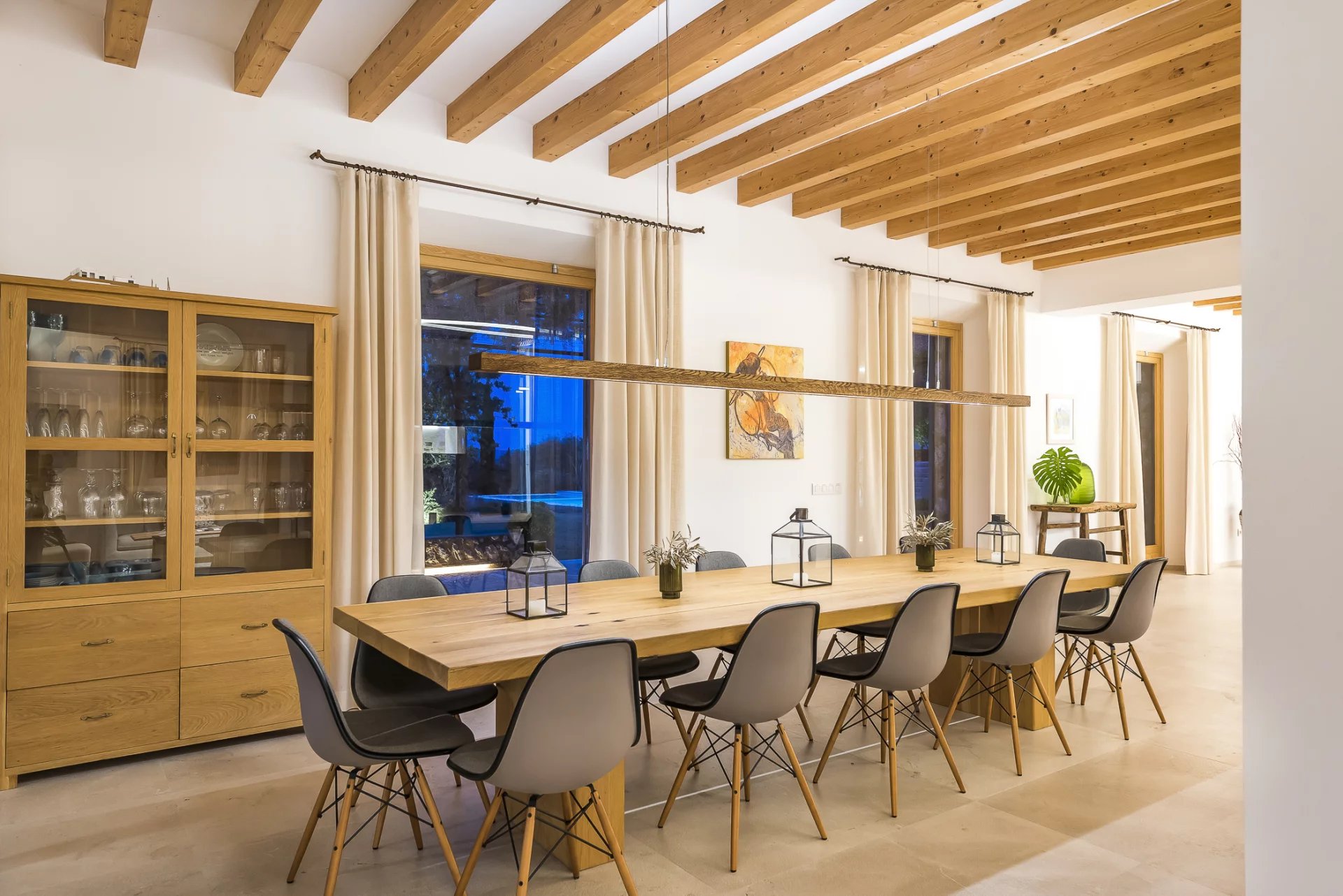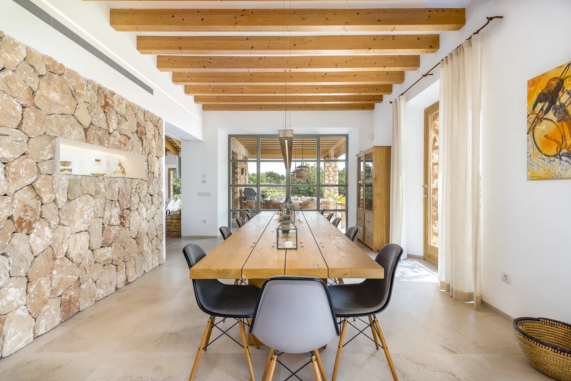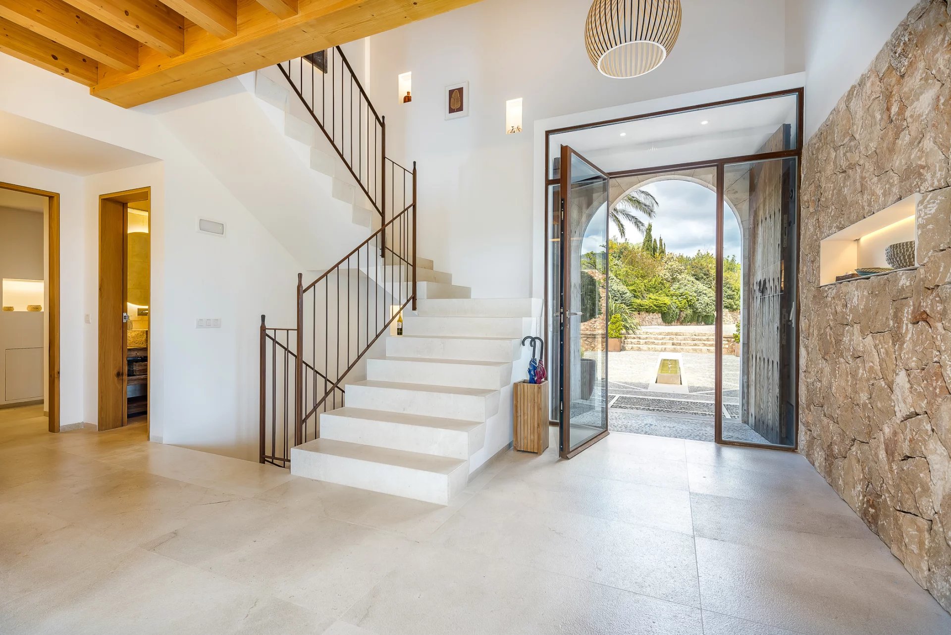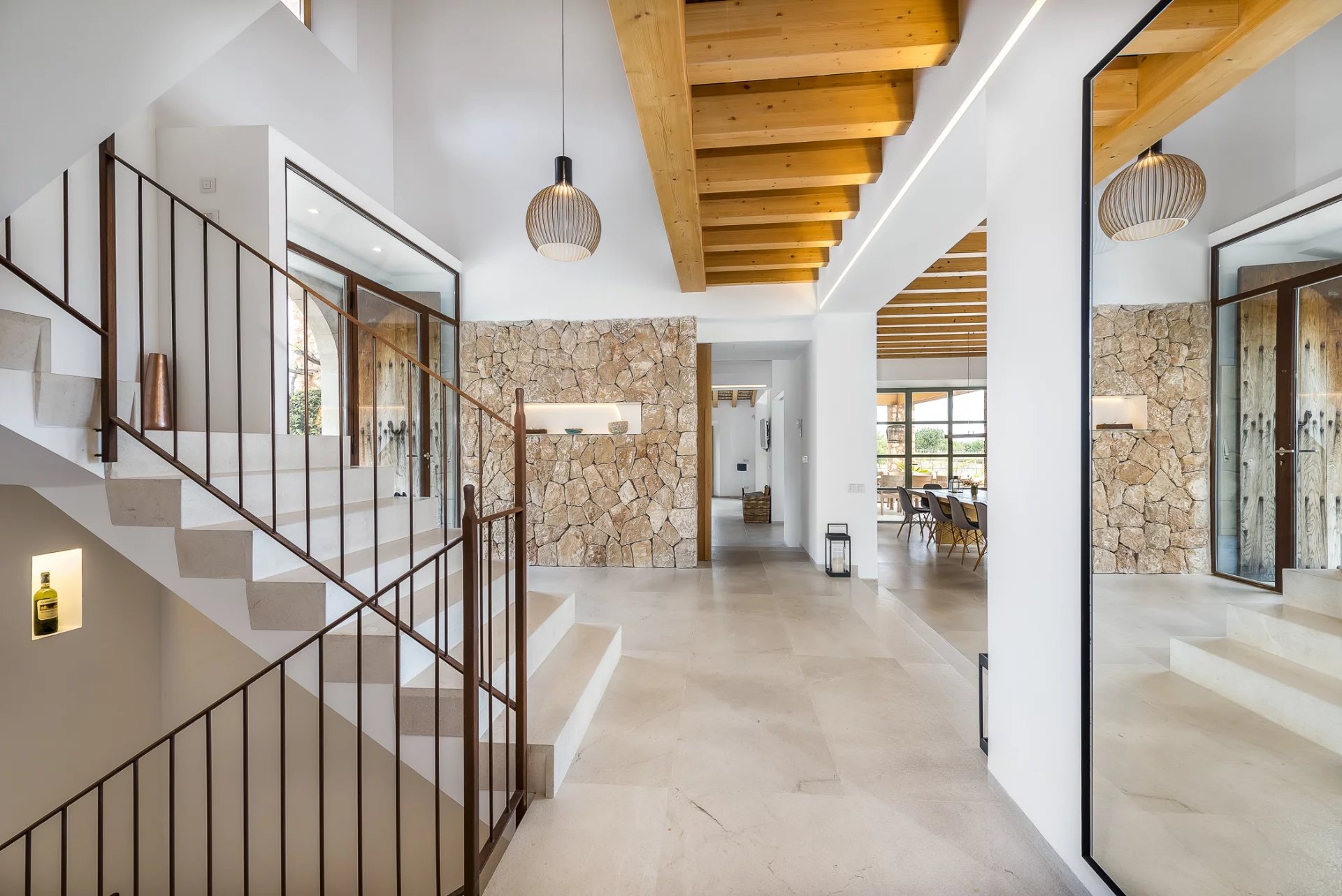 This stunning modern villa in Mallorca combines contemporary elegance with traditional Mediterranean charm. Designed with spacious interiors, natural stone floors, high-quality wood finishes, and floor-to-ceiling windows, the home offers an unparalleled living experience.