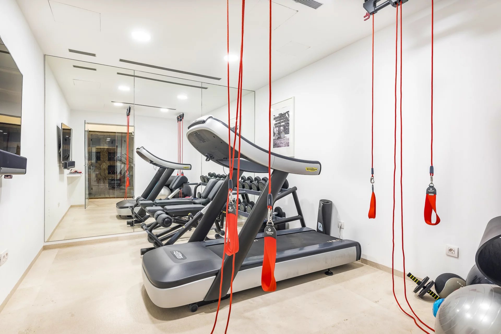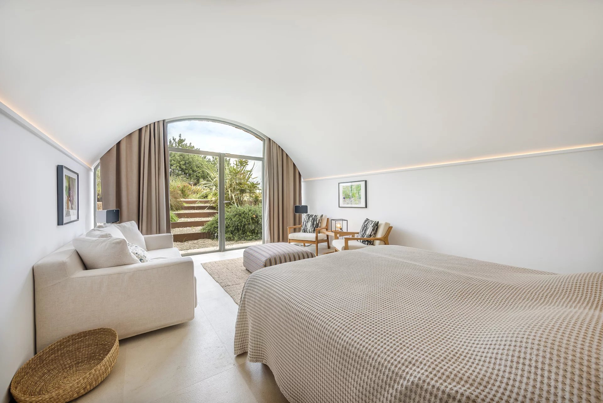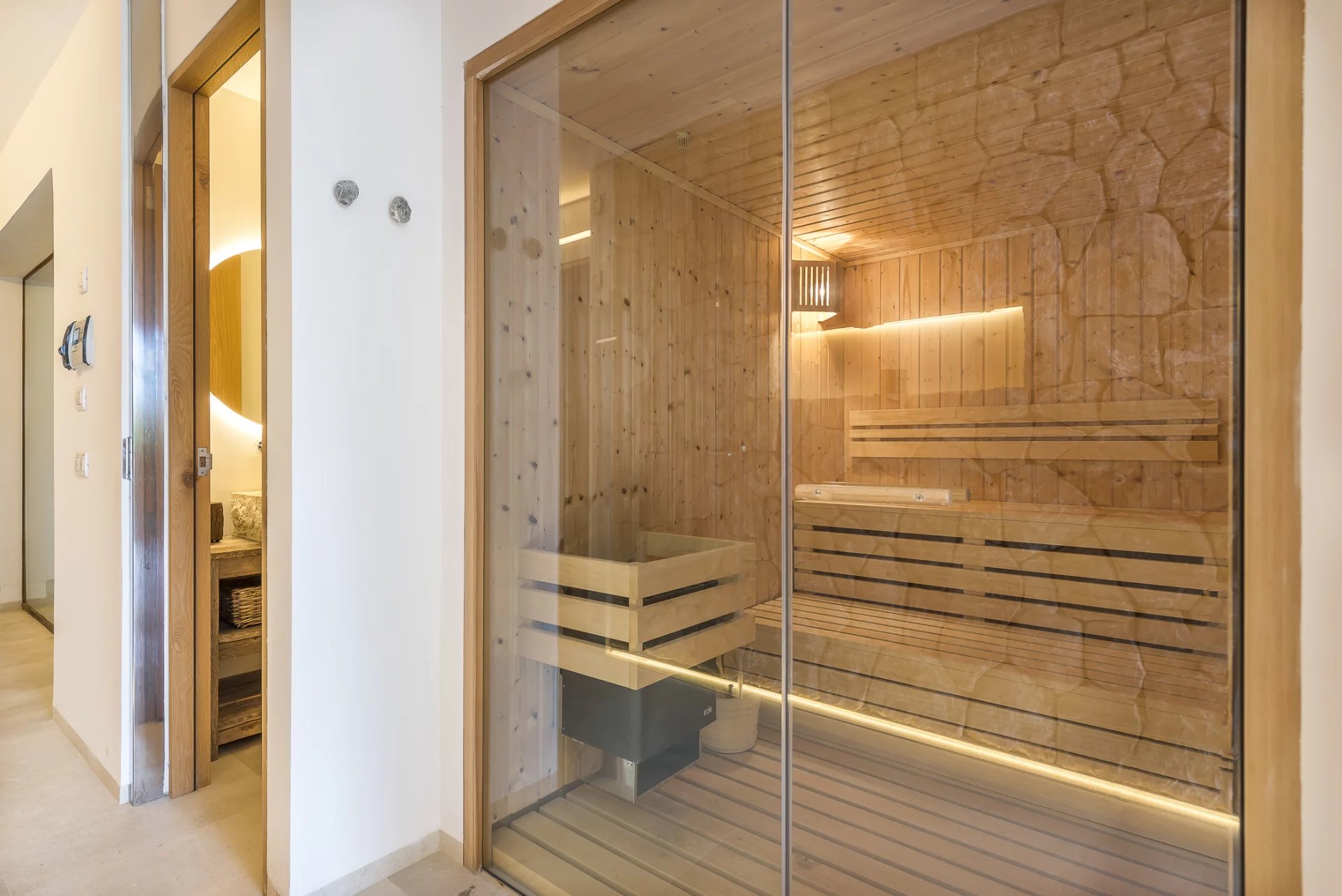 Upstairs, you’ll find three elegant suites, each with a private terrace, including the master suite with a fireplace and lounge area. The basement level offers a private spa with a sauna, a wine cellar, a gym, and an additional guest suite with an en-suite bathroom.