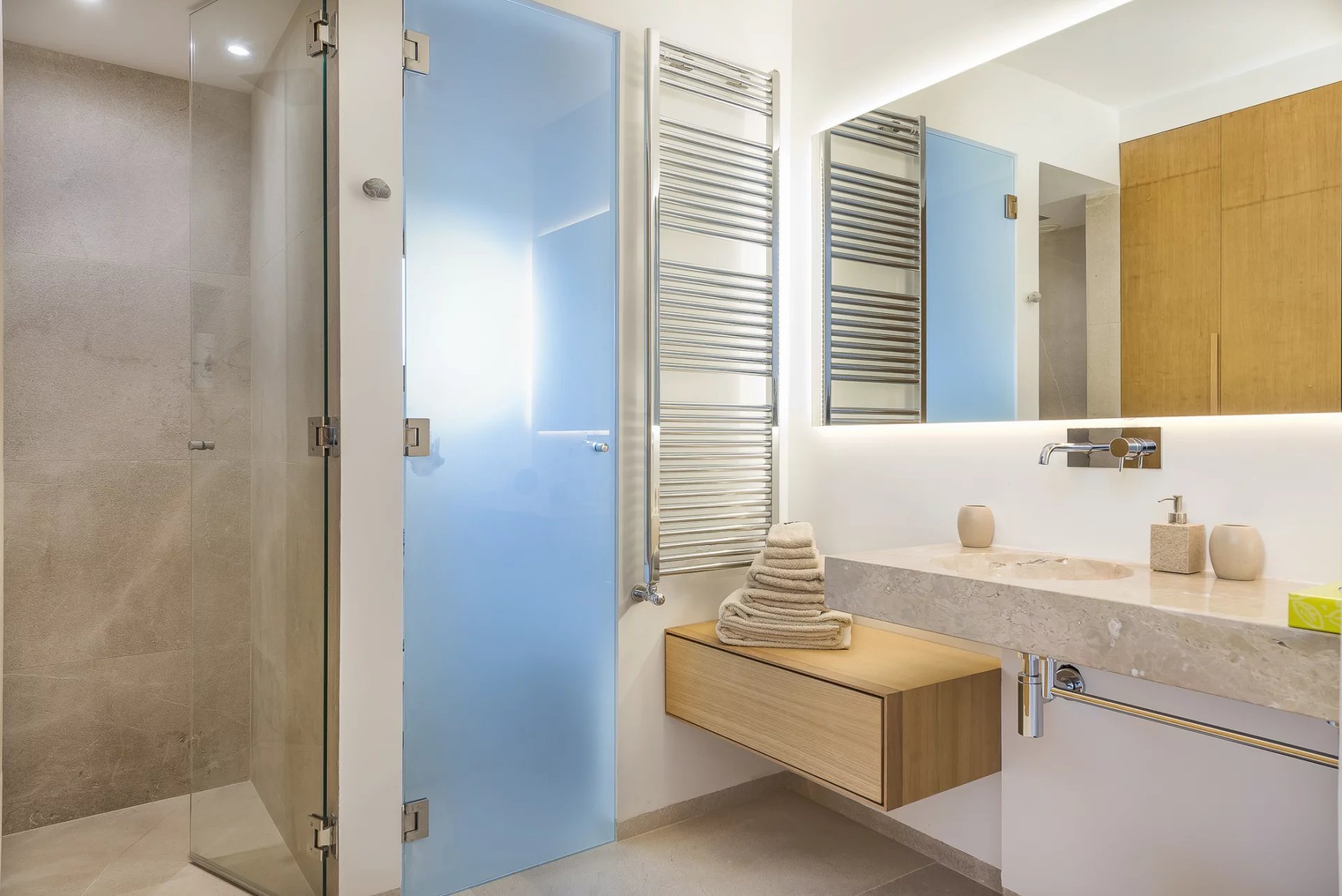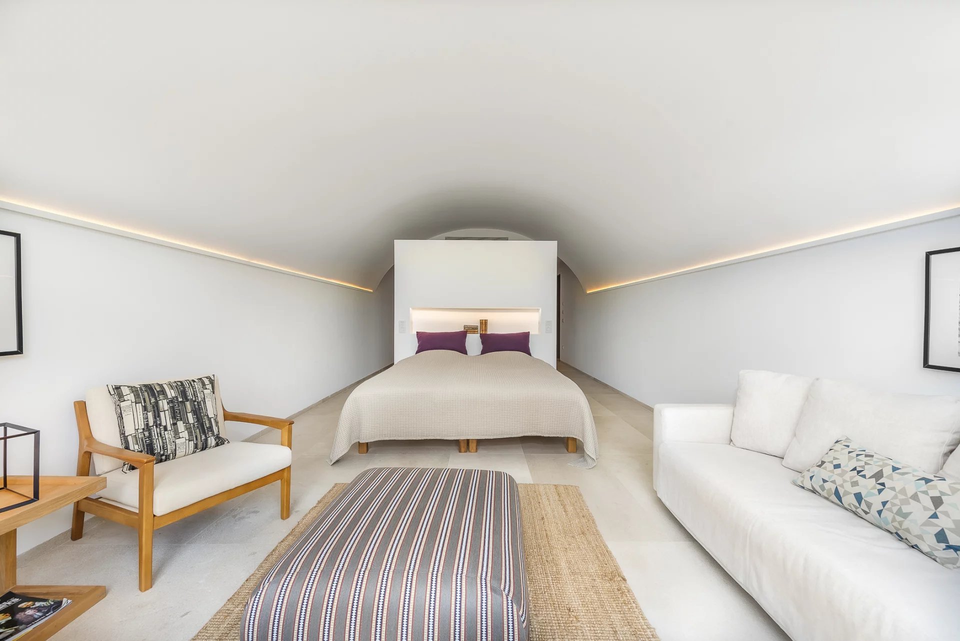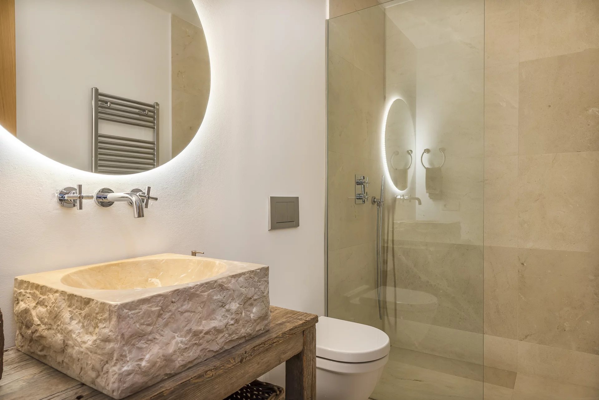 Upstairs, you’ll find three elegant suites, each with a private terrace, including the master suite with a fireplace and lounge area. The basement level offers a private spa with a sauna, a wine cellar, a gym, and an additional guest suite with an en-suite bathroom.