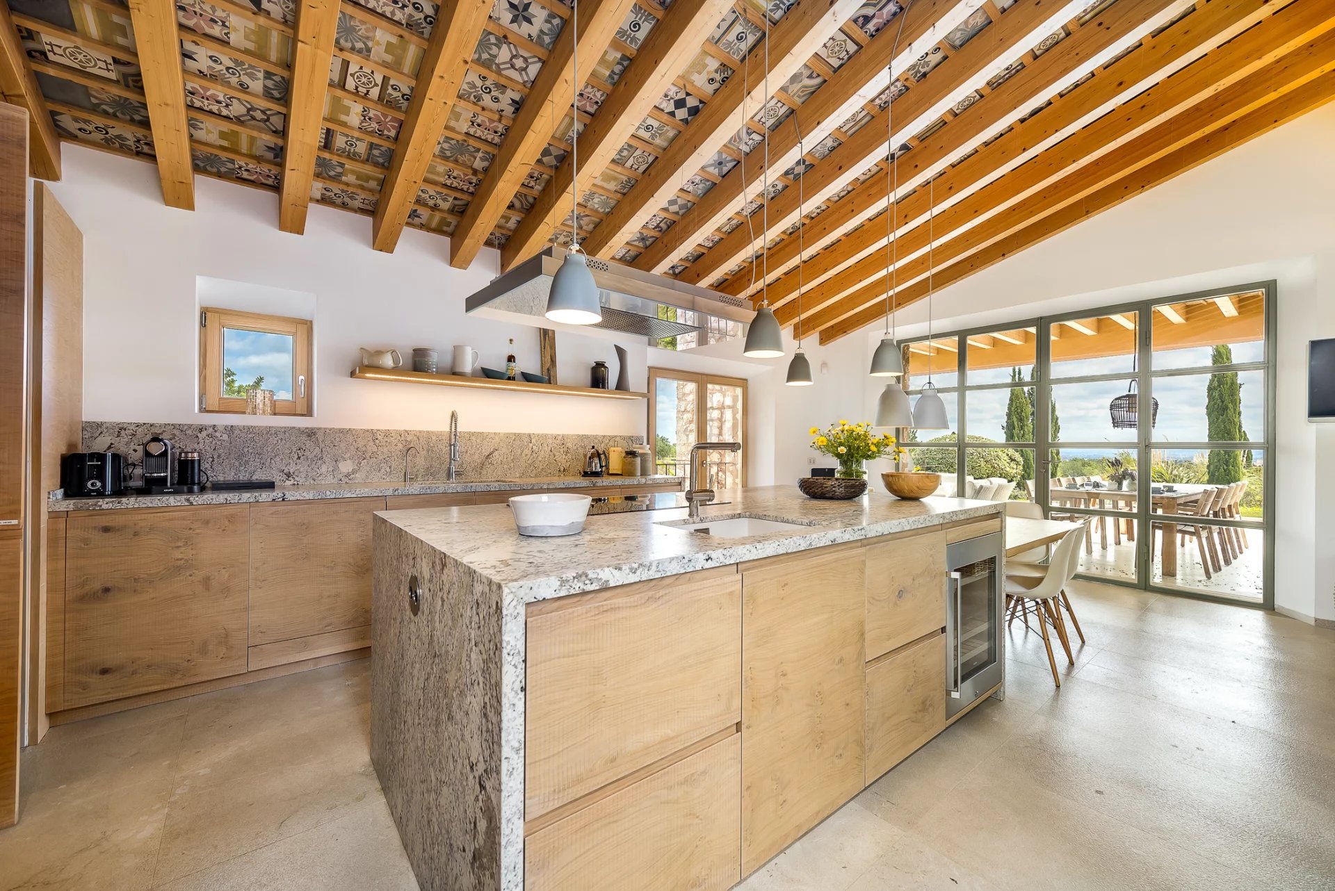 Outdoors, the 15 x 5 m pool is complemented by a spacious terrace with a summer kitchen, barbecue area, and outdoor bathroom—perfect for entertaining. This area, known as "Es Mirador" (The Lookout Point), offers breathtaking panoramic views across the entire island.