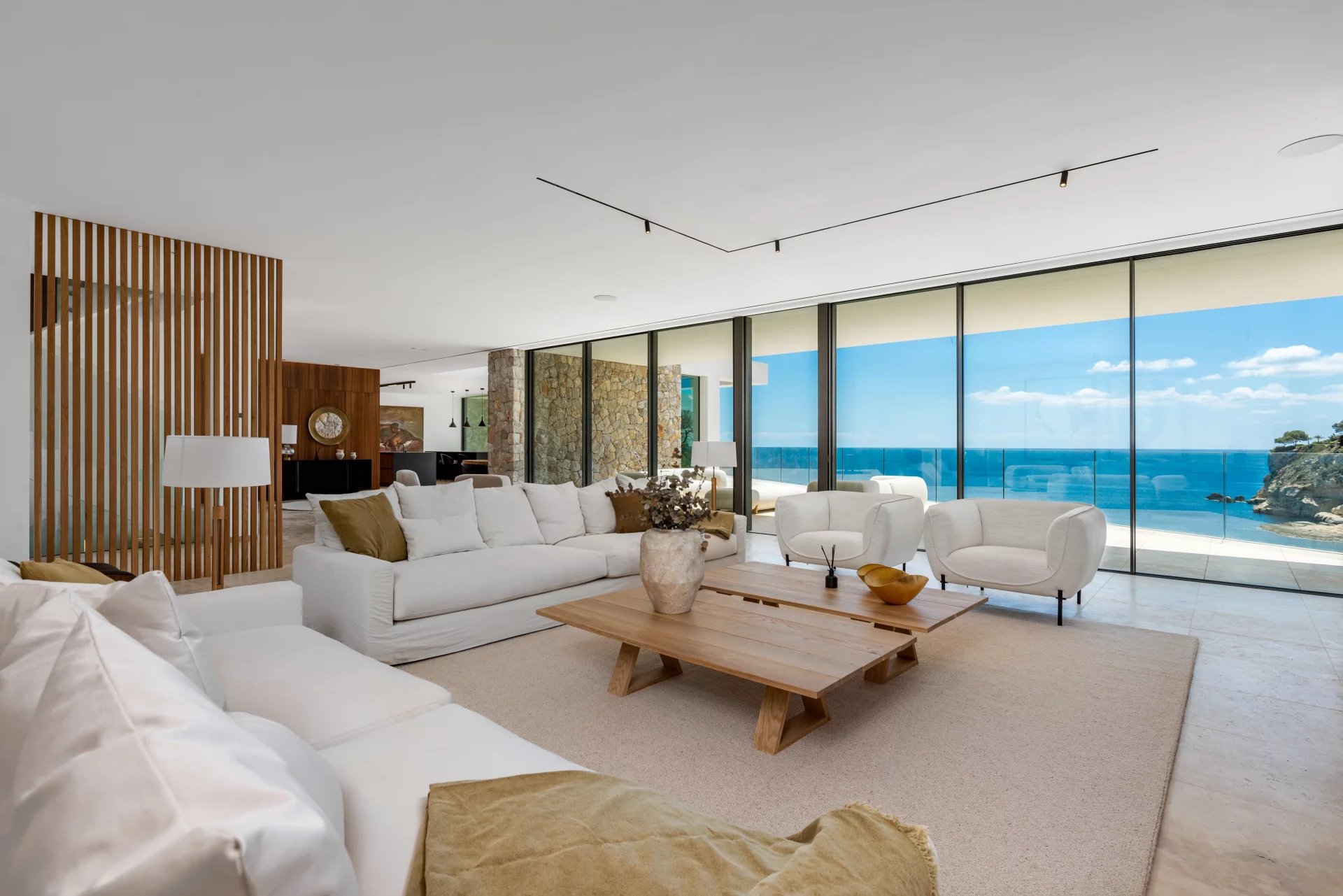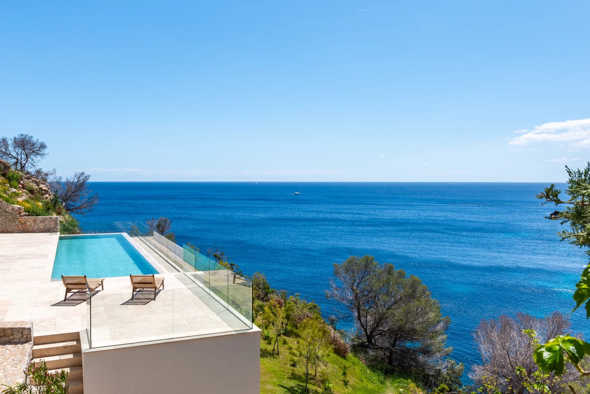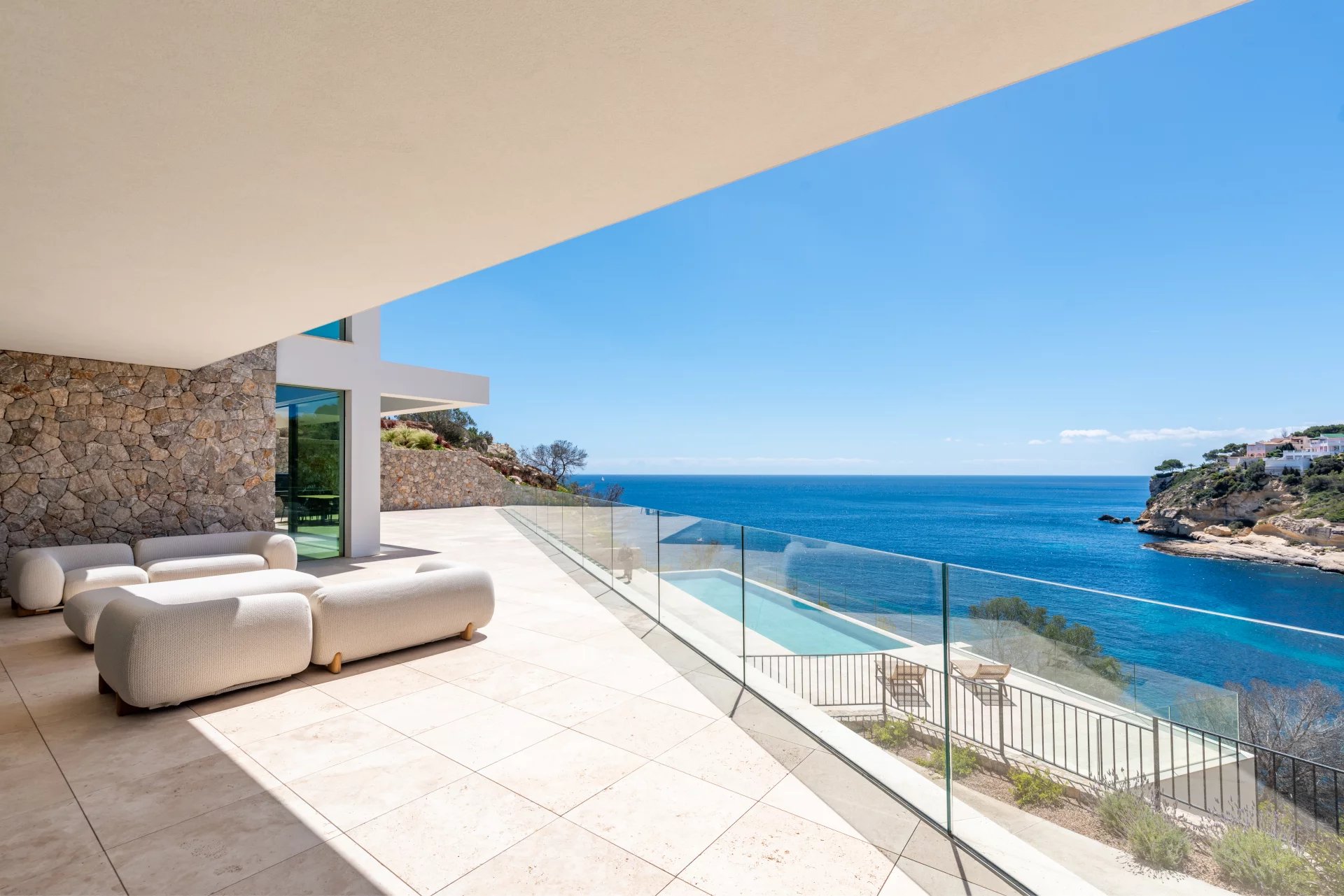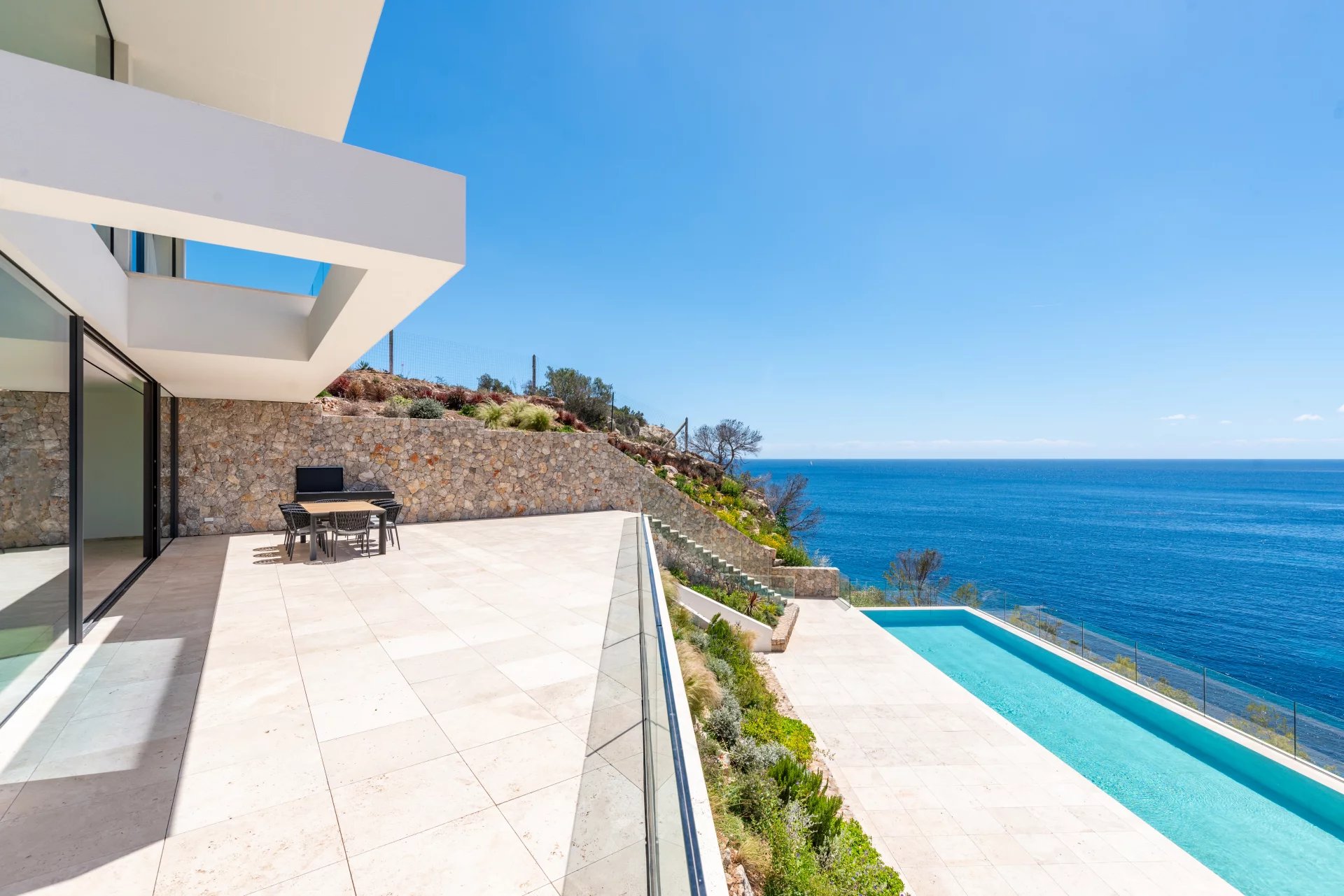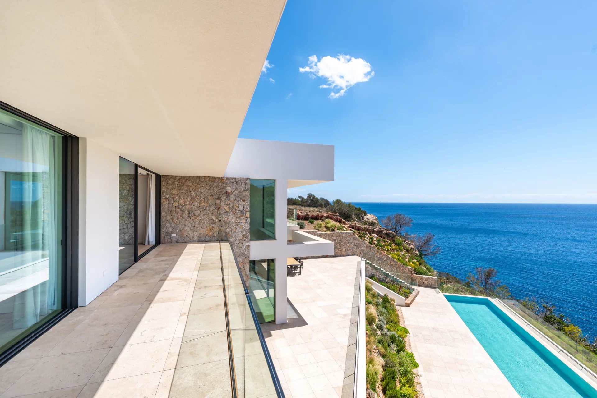 Experience the epitome of pure luxury living in this extraordinary newly built villa in the tranquil residential area of Sol de Mallorca! Step into this coastal masterpiece, which offers an unparalleled lifestyle! This breathtaking residence with an impeccable design in first line boasting unrivalled sea views redefines coastal luxury properties in Mallorca. With more than 1000 m2 of built area on a 2142 m2 plot this amazing house offers 3 floors connected by a lift. Upon entering the vestibule on the top floor you are inmediately welcomed by a stunning view of the Mediterranean sea. On this level there is the magnificent master suite with 2 walk-in closets and a sophisticated open plan bathroom. Every morning you will wake up with the continuously changing colours of the sea at your feet. On this floor there are also 3 more bedrooms, each one with its own bathroom. Descending a beautiful staircase one arrives at the main living area, completely light flooded, connected and spacious, but at the same time designed to offer clearly separate spaces for different moments, be it for a cosy evening at the fireplace, formal dining, a lively barbecue party with family and friends or simply relaxing on the lounge terrace. The basement of the house offers a garage for at least 7 cars and additionally some huge spaces, which can be dedicated to a fitness room, a home cinema or a play room for children. Many porches and open terraces to enjoy the sun around the stunning infinity pool complete this one of a kind retreat. Ready to elevate your living experience to new heights and turn this unmatched lifestyle into yours? Contact us today to make this dream a reality!
