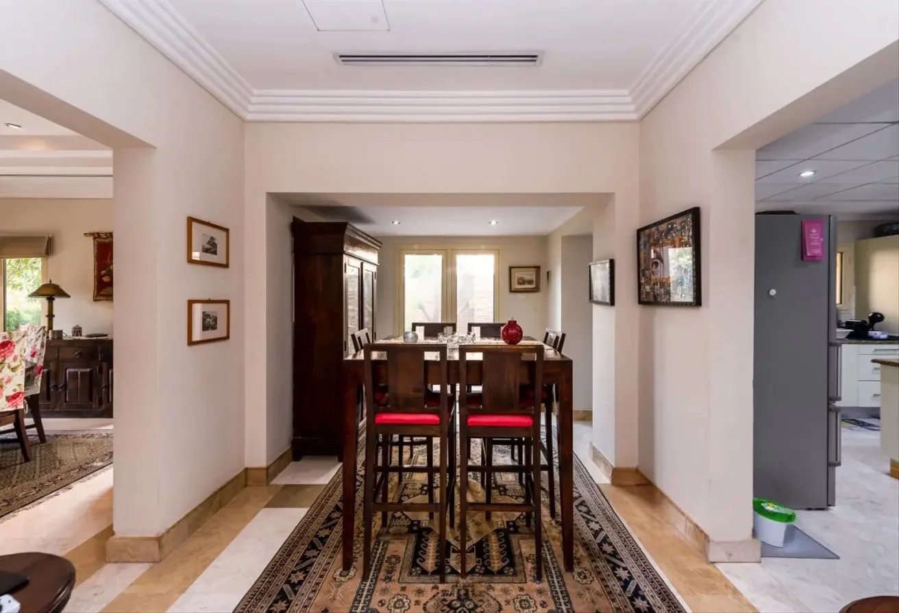 Spanning approximately 6,000 sq. ft., the villa features five en-suite bedrooms, an open-plan kitchen, three spacious reception areas, a maid’s quarters, and a grand entrance hall. The beautifully landscaped garden includes a private swimming pool and outdoor dining space, ideal for relaxation and entertaining.