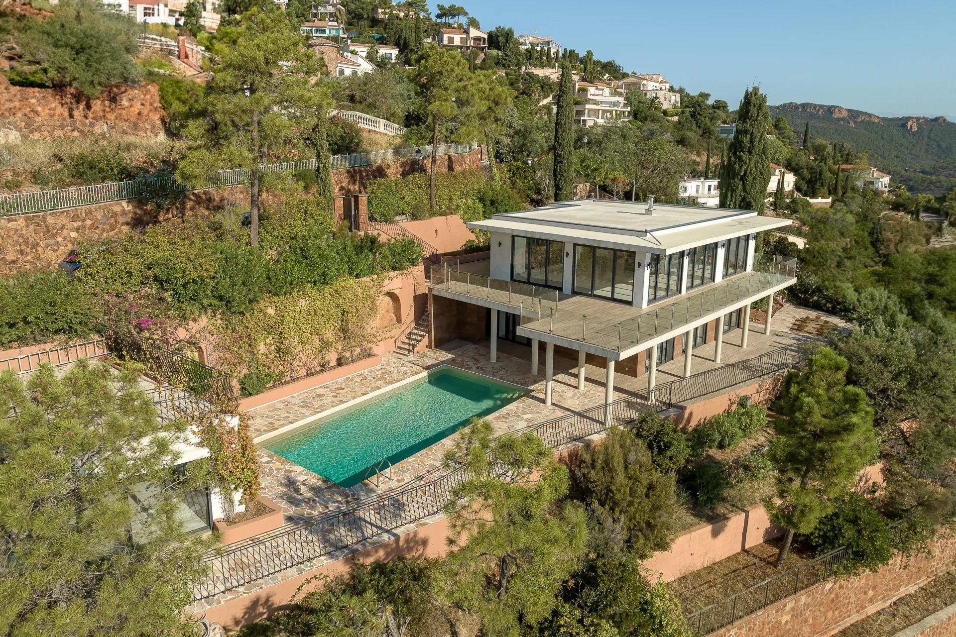 Located on the outskirts of Théoule, in a gated, secure estate overlooking the bay and the Esterel, modern villa entirely renovated on 2 levels with a total built area of approx. 210 m² on on land with swimming pool, offering an extraordinary sea view. Quiet and south-facing, the property has 4 bedrooms, including an independent studio. The beaches and restaurants of Port de La Figueirette are 5 minutes away. Theoule center is 10 minutes away, Cannes Croisette 35 minutes and Nice airport 45 minutes. Emotion guaranteed!