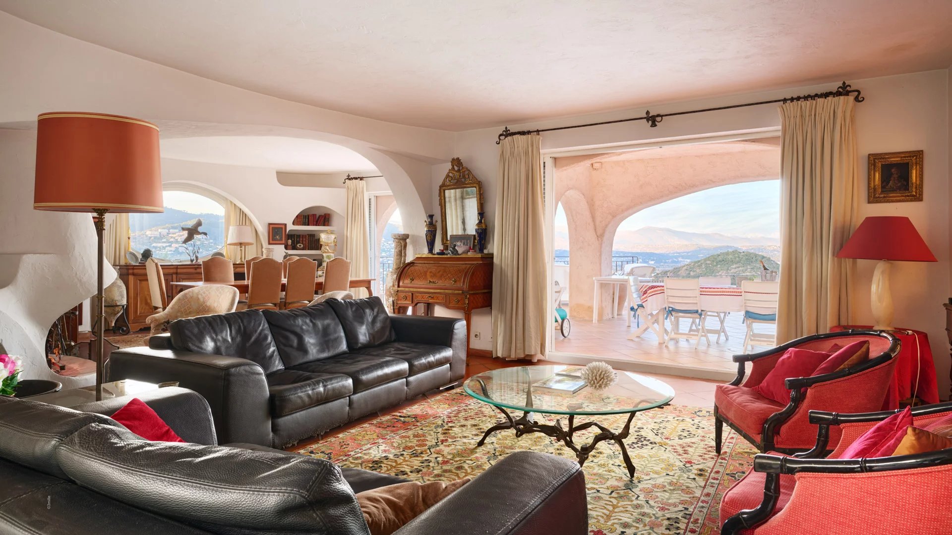 - A spacious living and dining room with fireplace, opening directly onto the terrace and pool ;