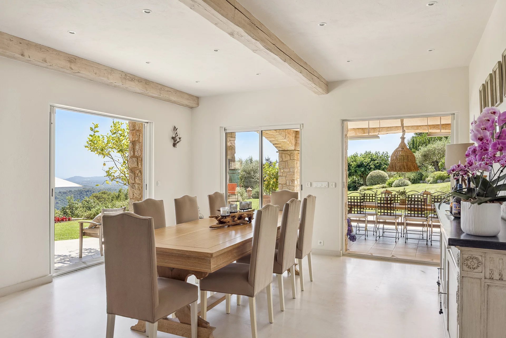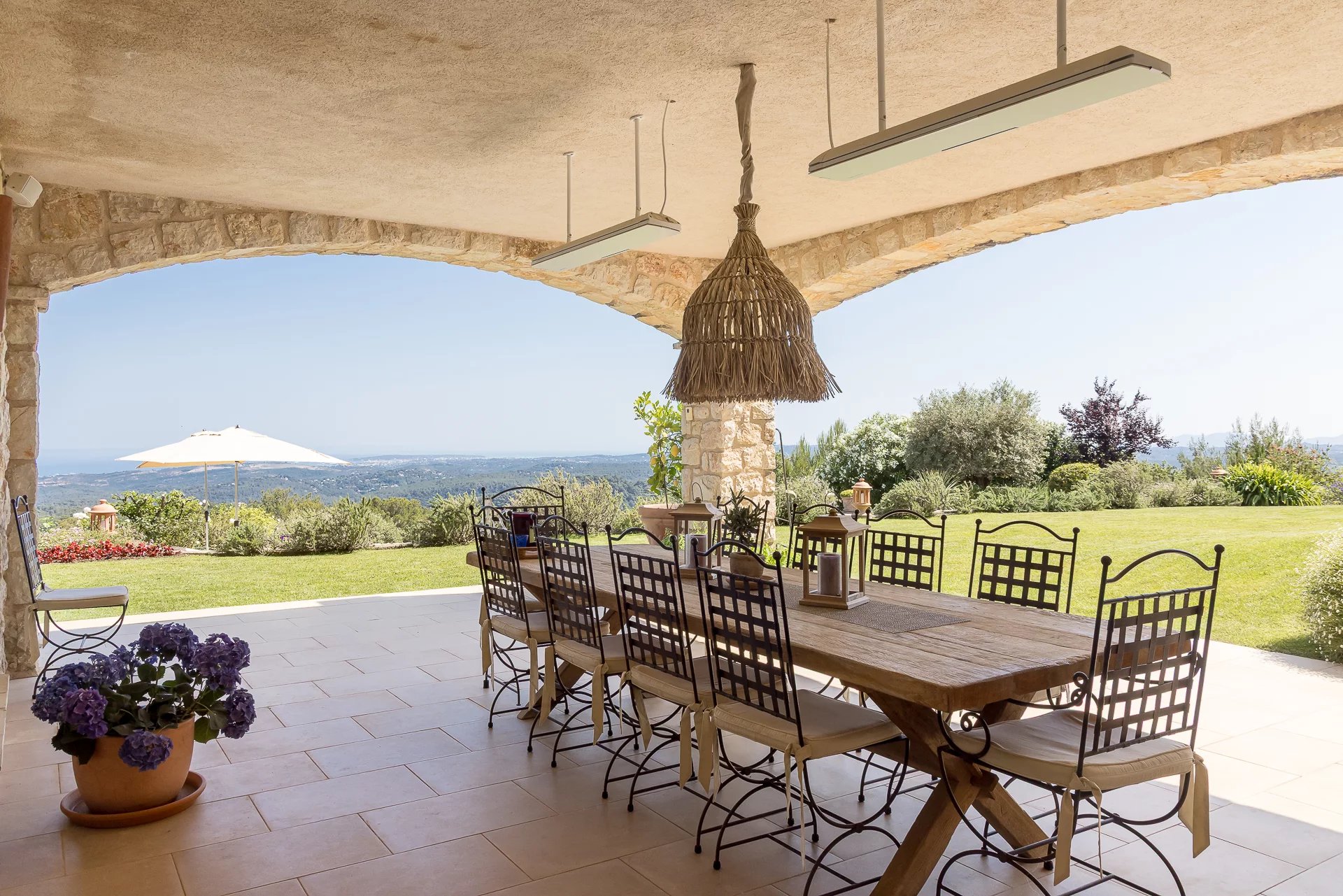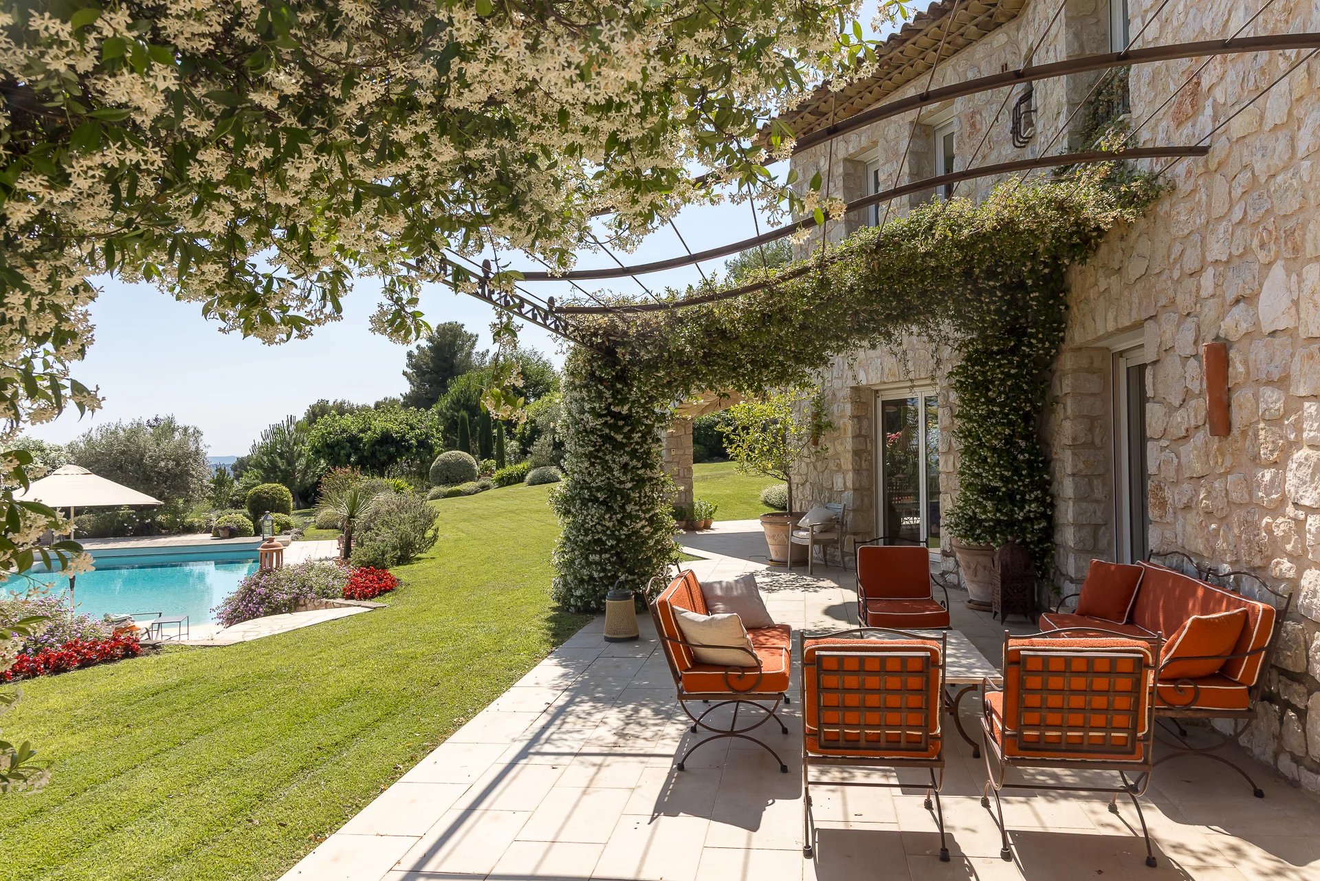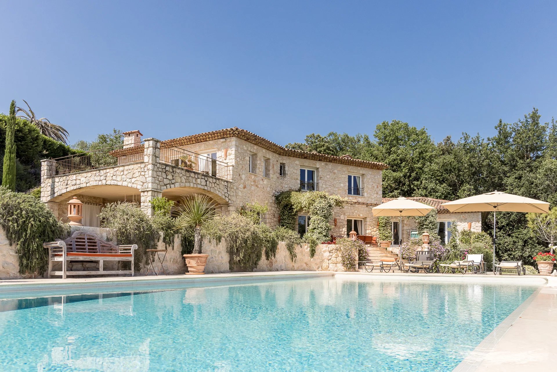 Superb Provençal residence recently finished and located close to the village of Tourrettes-sur-Loup and in total peace and quiet, with a superb panoramic view over the countryside to the sea . The house is set on a large garden with heated swimming pool and terraces. The interior is spacious and very bright with quality finishings and a total of 6 bedrooms and an office. The possibility to built a tennis court on the plot adds the finishing touch of this wonderful offering. Only 10 minutes to St. Paul de Vence.