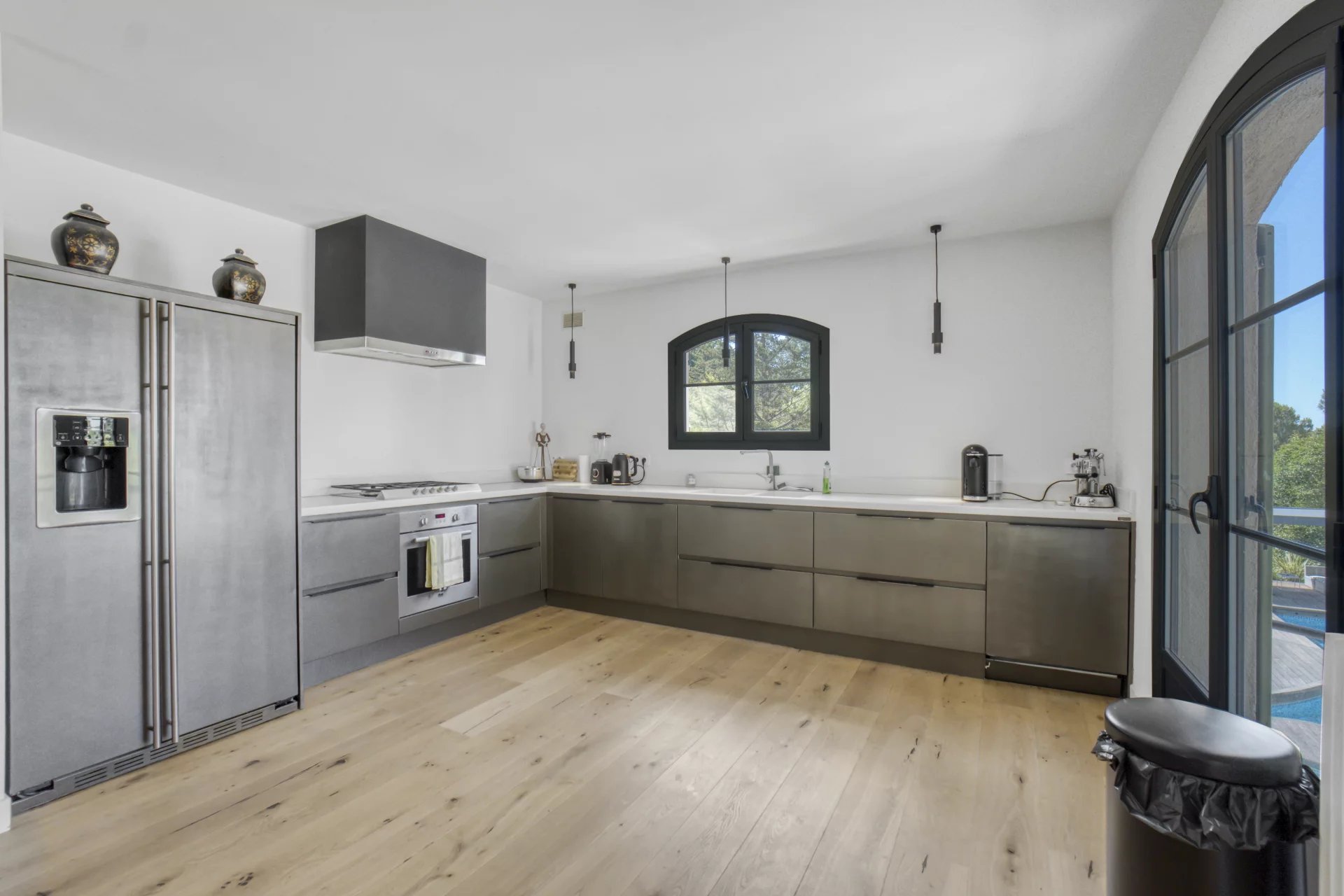 Set in a 1700 sqm plot, this 5-bedroom house features an easy-to-maintain lawn garden area with mature trees, a swimming pool, a pool house and an outdoor kitchen with outside dining area.