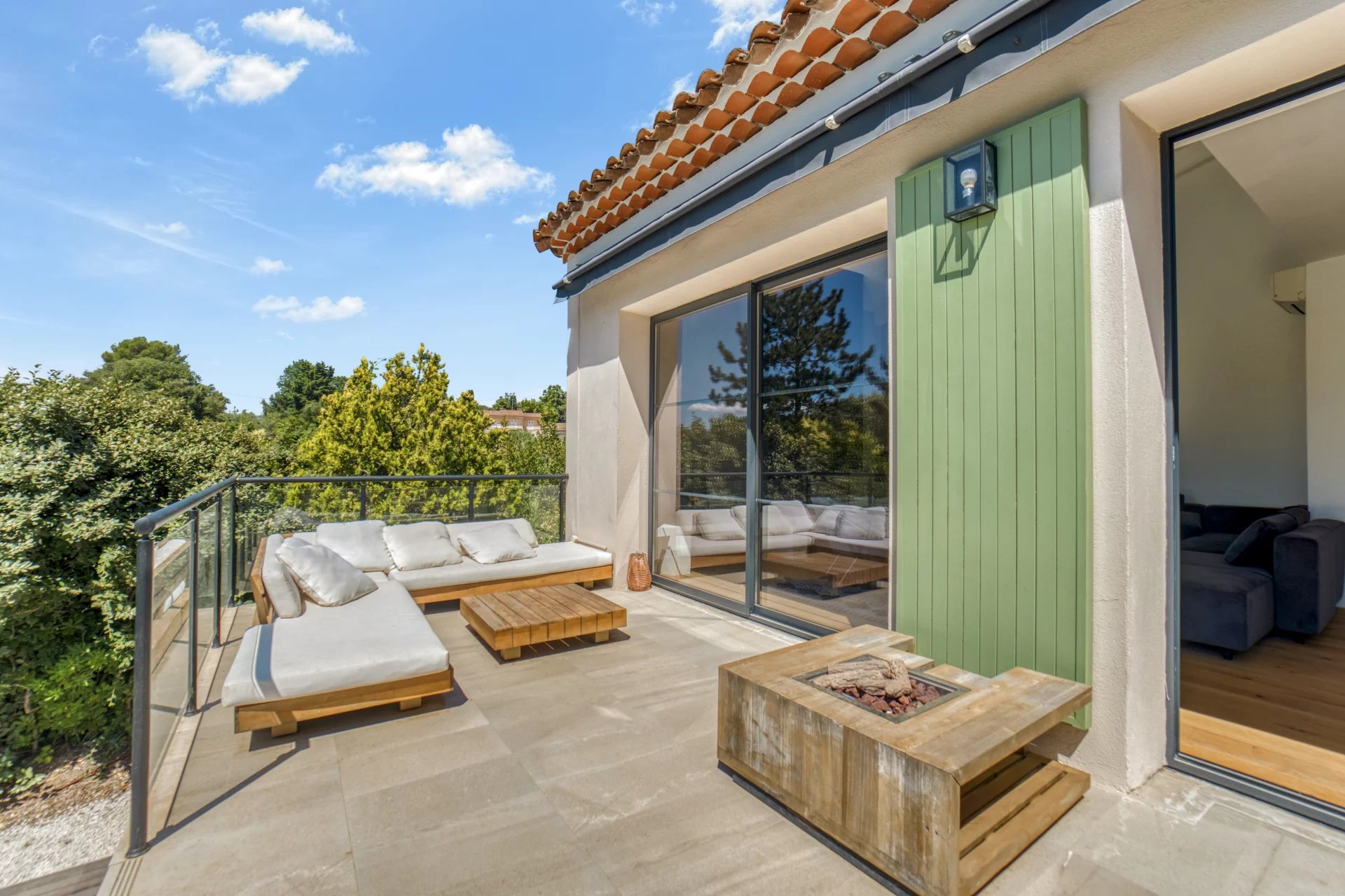 Learn moreThe new windows blend modernity with provencal style. The large sliding doors remove the boundaries between the indoor and outdoor areas. In winter time, a modern fireplace provides cosiness. Another highlight is the illuminated tropical hardwood terrace with more than 120 sqm.