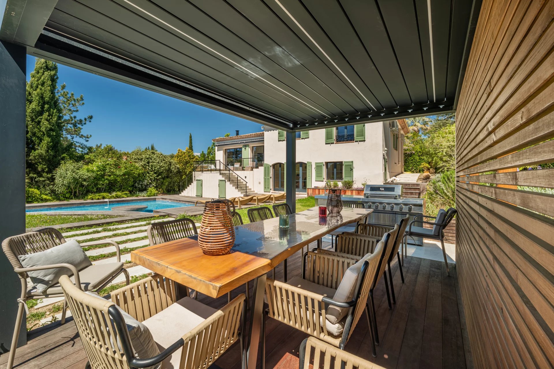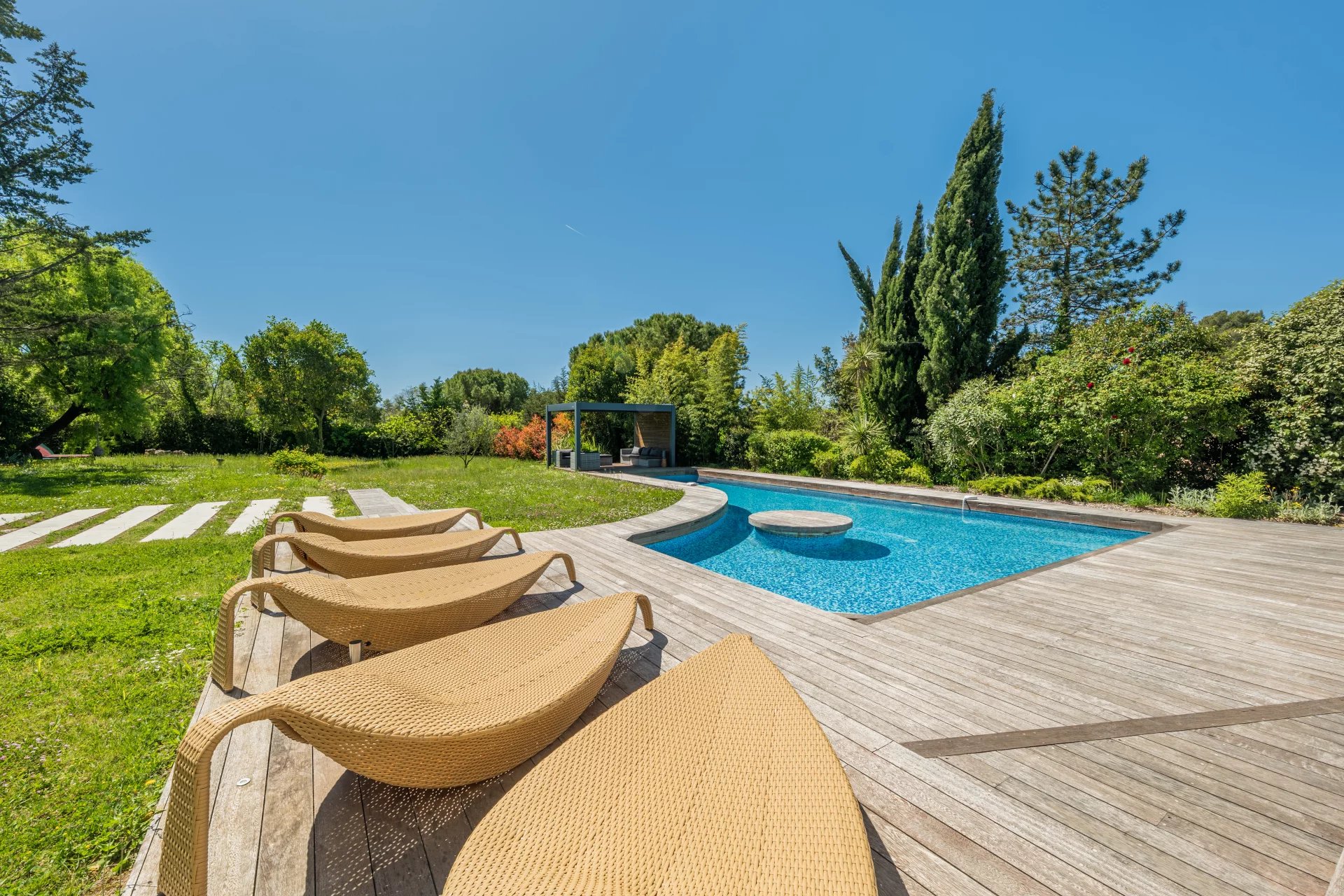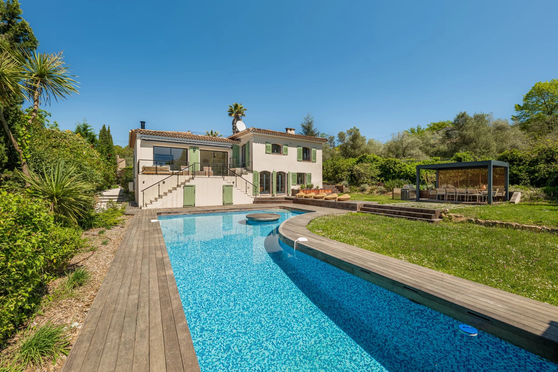 The swimming pool impresses with its exceptionally attractive shape and is surrounded by a summer kitchen with barbecue and a pretty pergola.