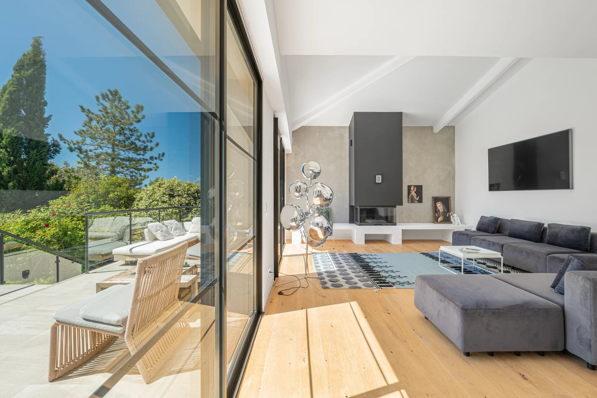 A few steps lead to the bright living area with fireplace, which connects directly to the beautiful terrace through large sliding doors.