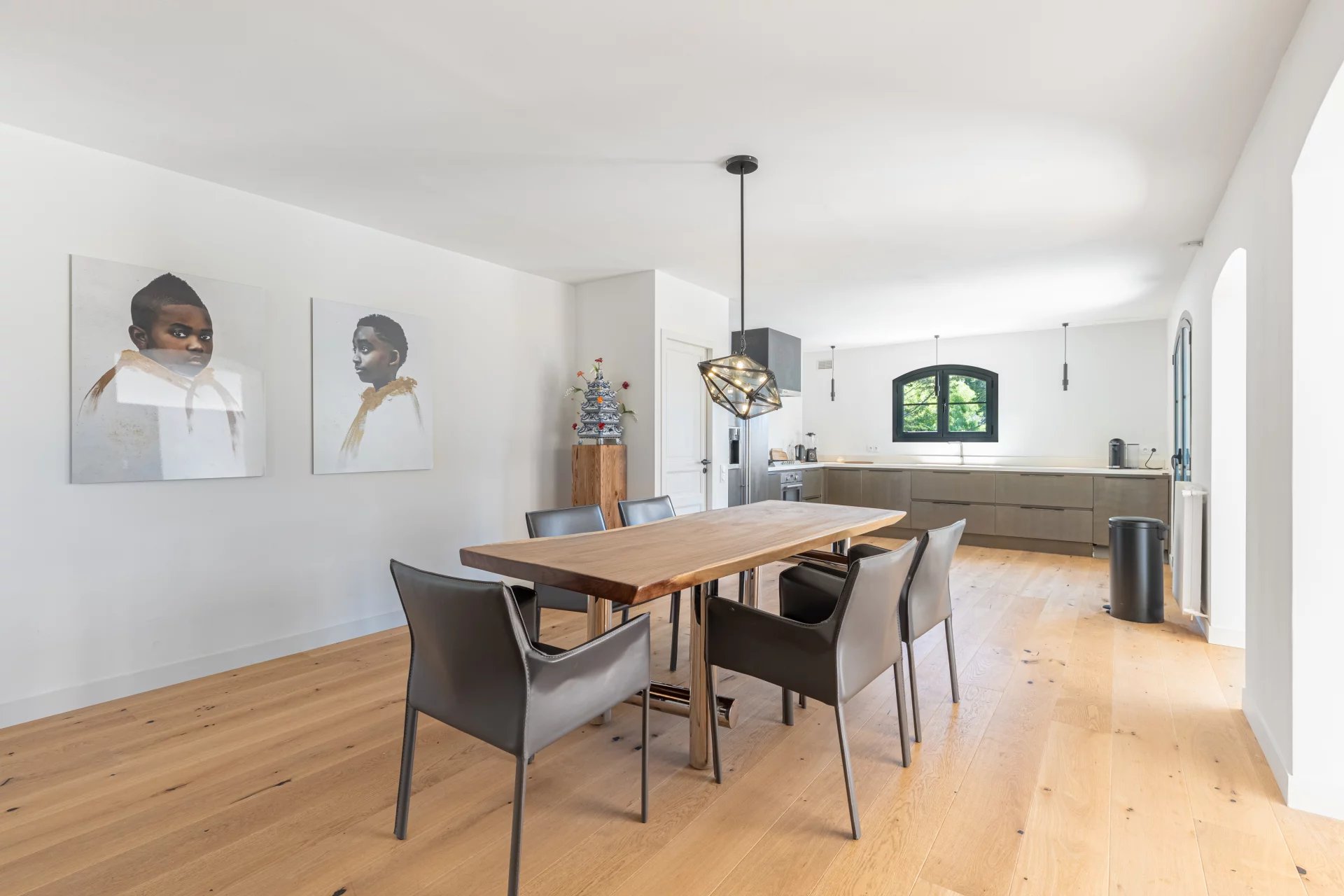 The entrance leads into a modern, fully equipped kitchen that opens onto a spacious dining room.
