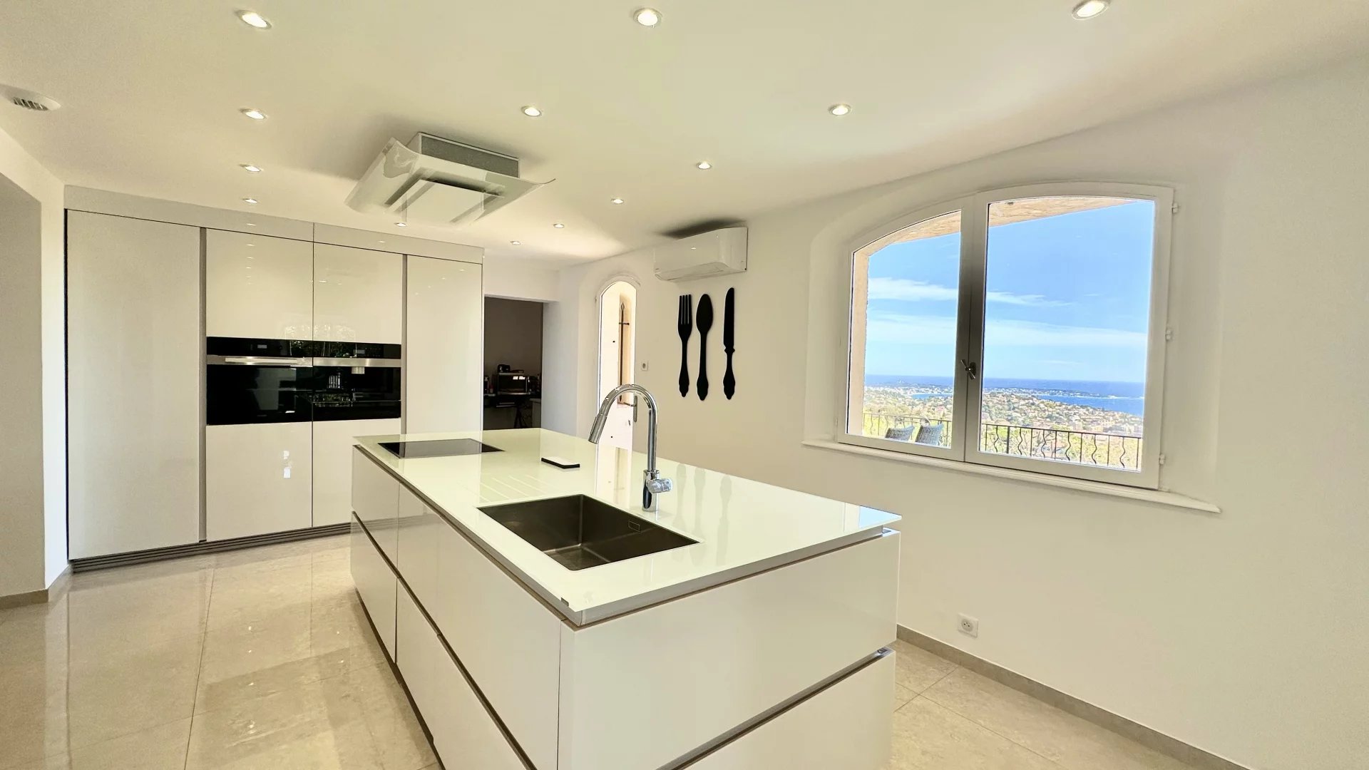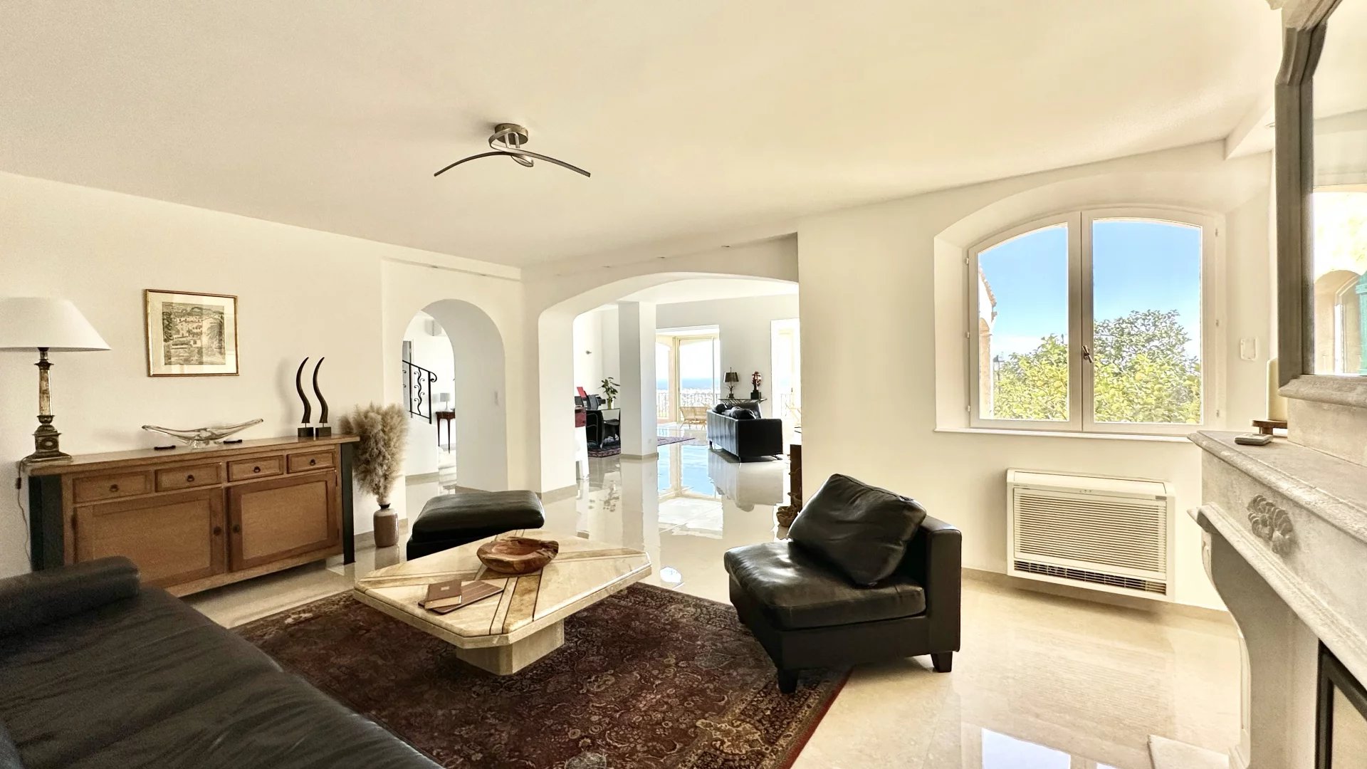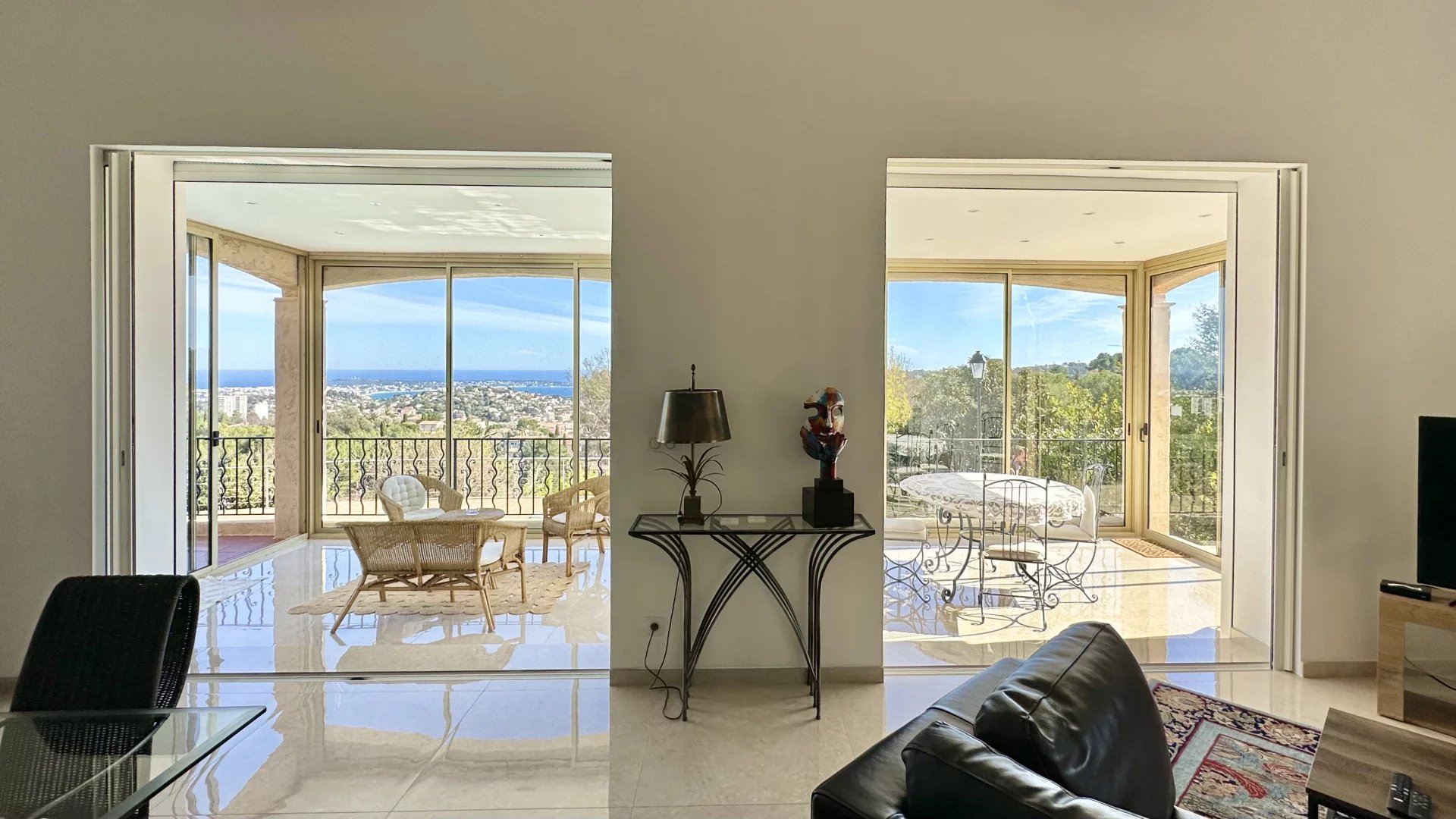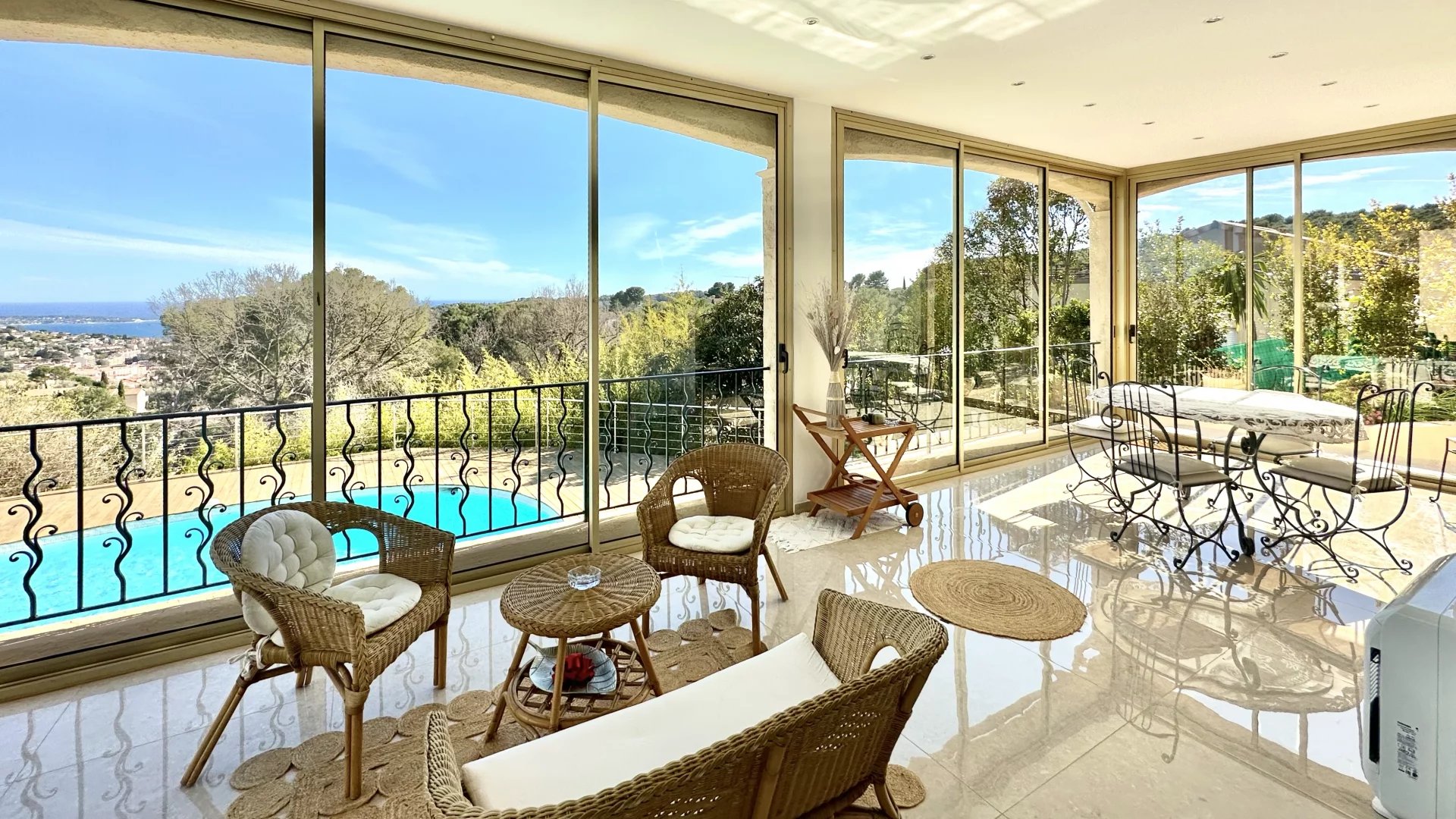 Located on the top of Vallauris in a quiet residential area, this renovated villa with beautiful materials offers wonderful views of the sea, Cap d'Antibes and hill of Super-Cannes.
