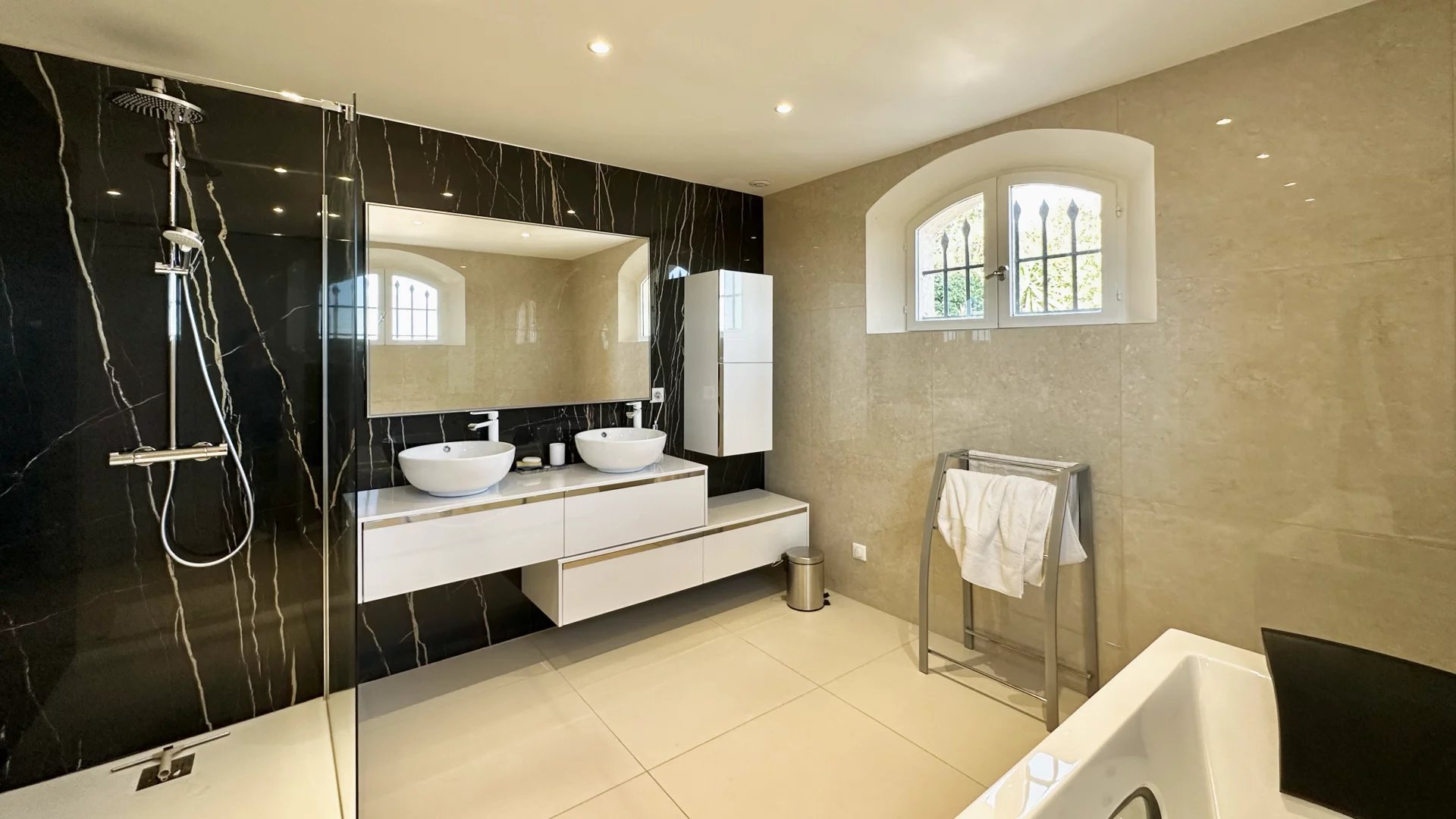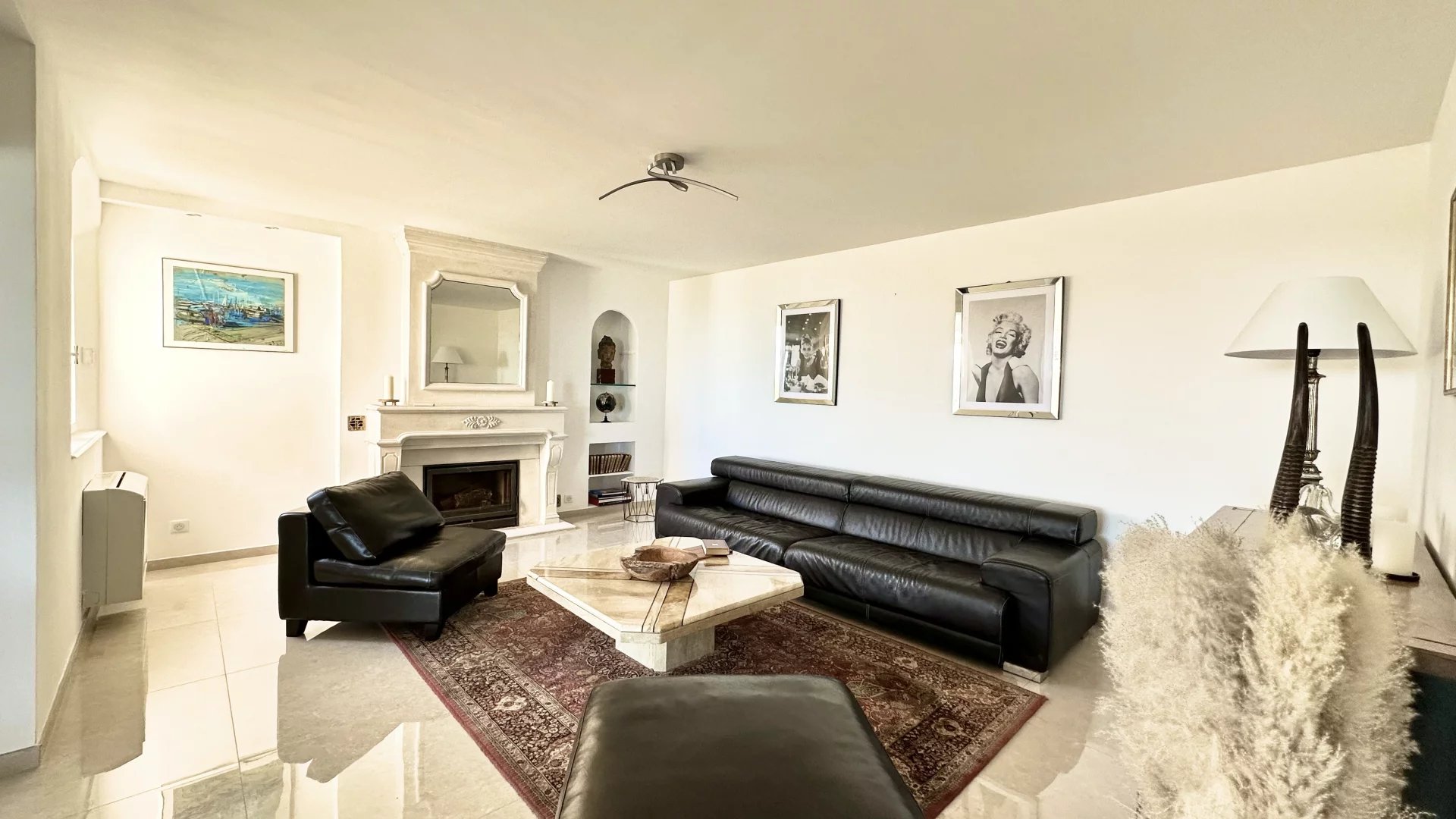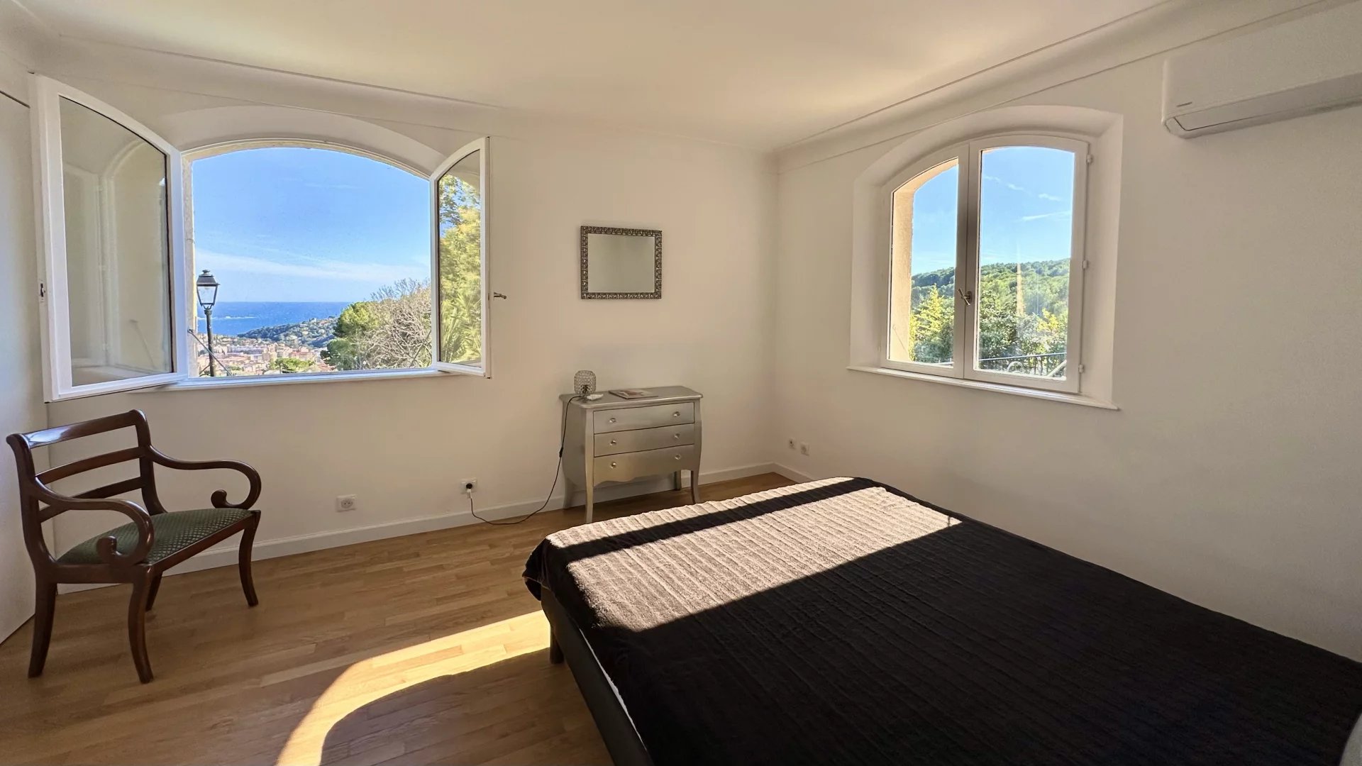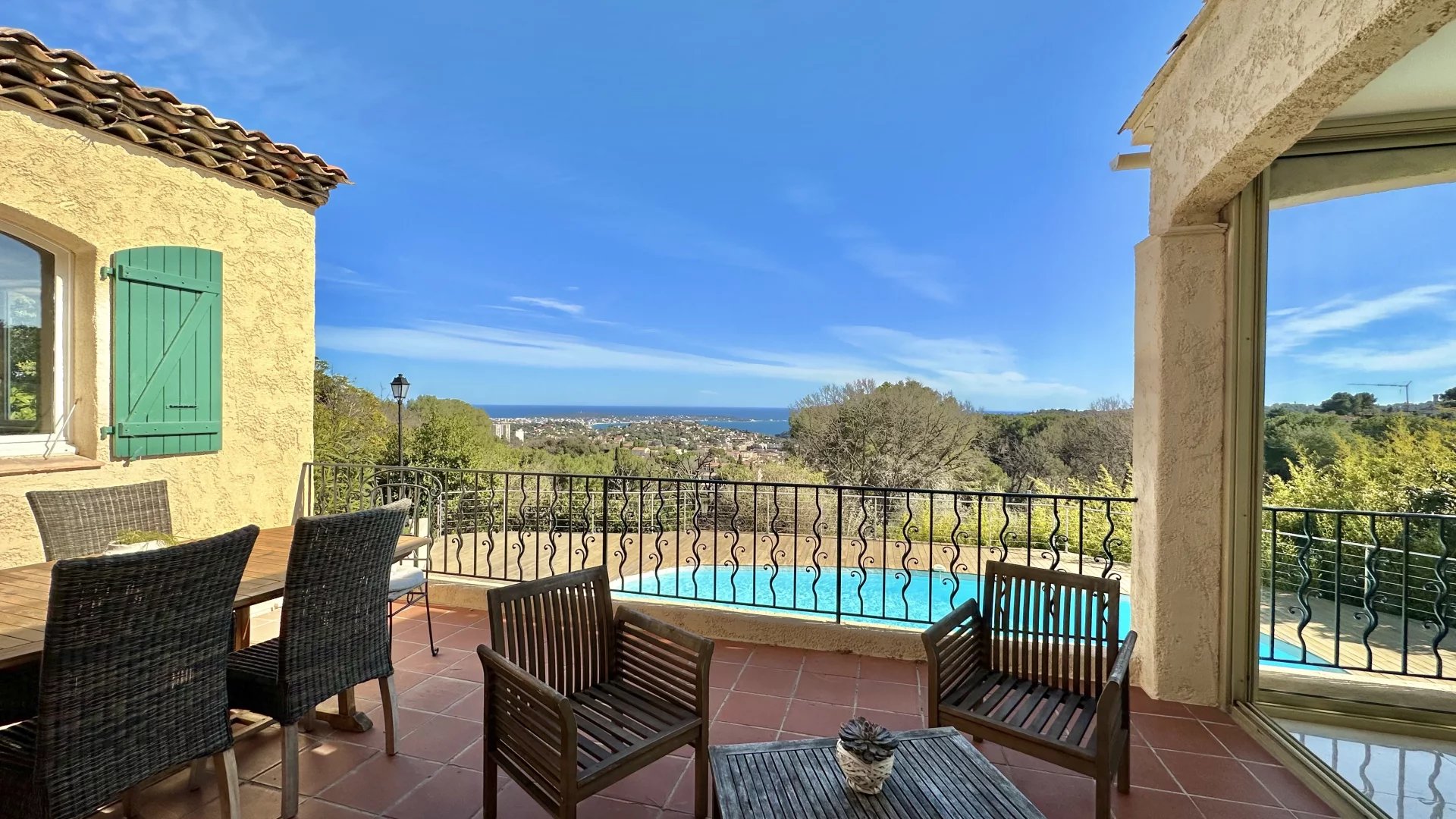 Located on the top of Vallauris in a quiet residential area, this renovated villa with beautiful materials offers wonderful views of the sea, Cap d'Antibes and hill of Super-Cannes.