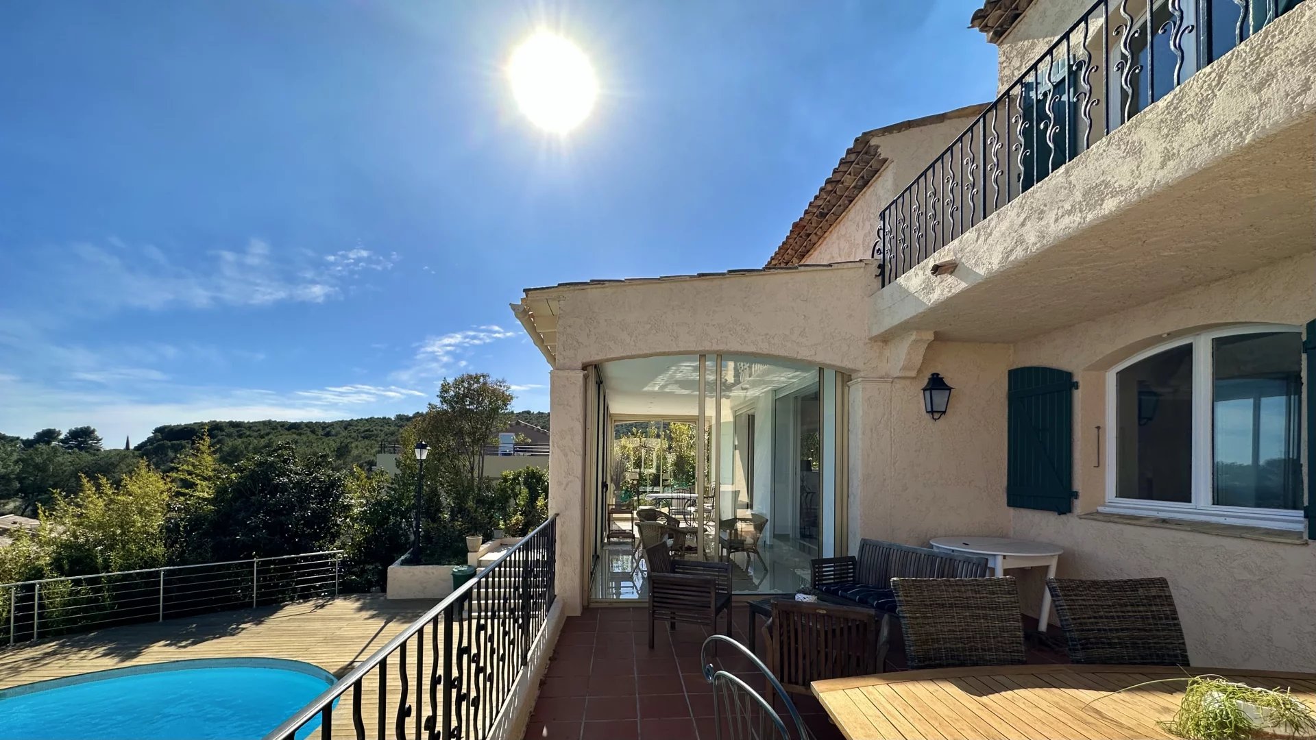 Outside a swimming pool and a large terrace complete this property.
