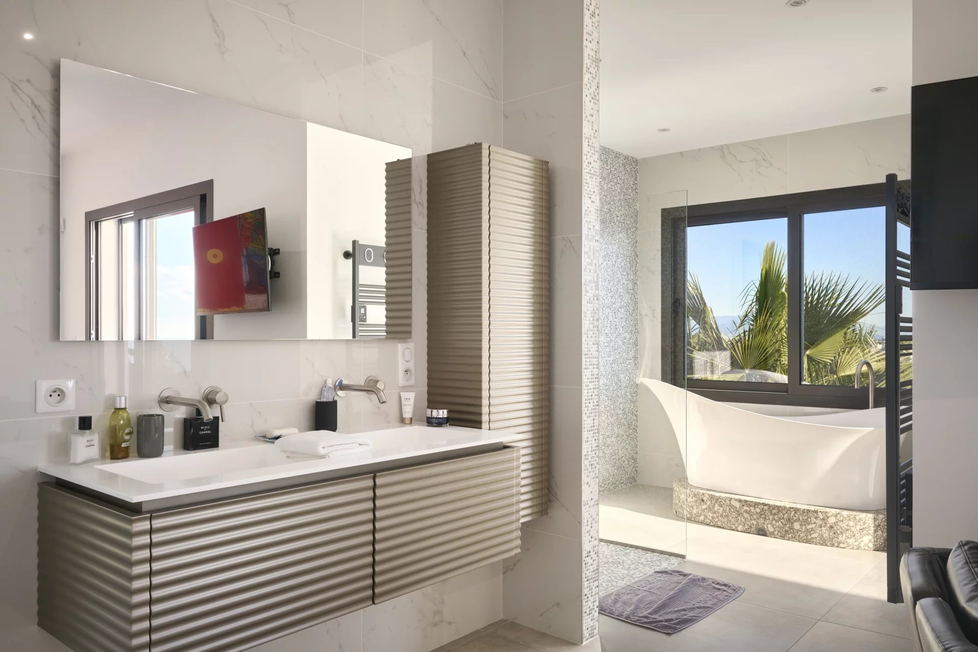 - On the ground floor: entrance, guest toilet, bedroom 1 with shower room, laundry room, fully equipped open kitchen, double living room, bedroom with en-suite shower room and dressing room and separate toilet, all overlooking the garden and swimming pool.