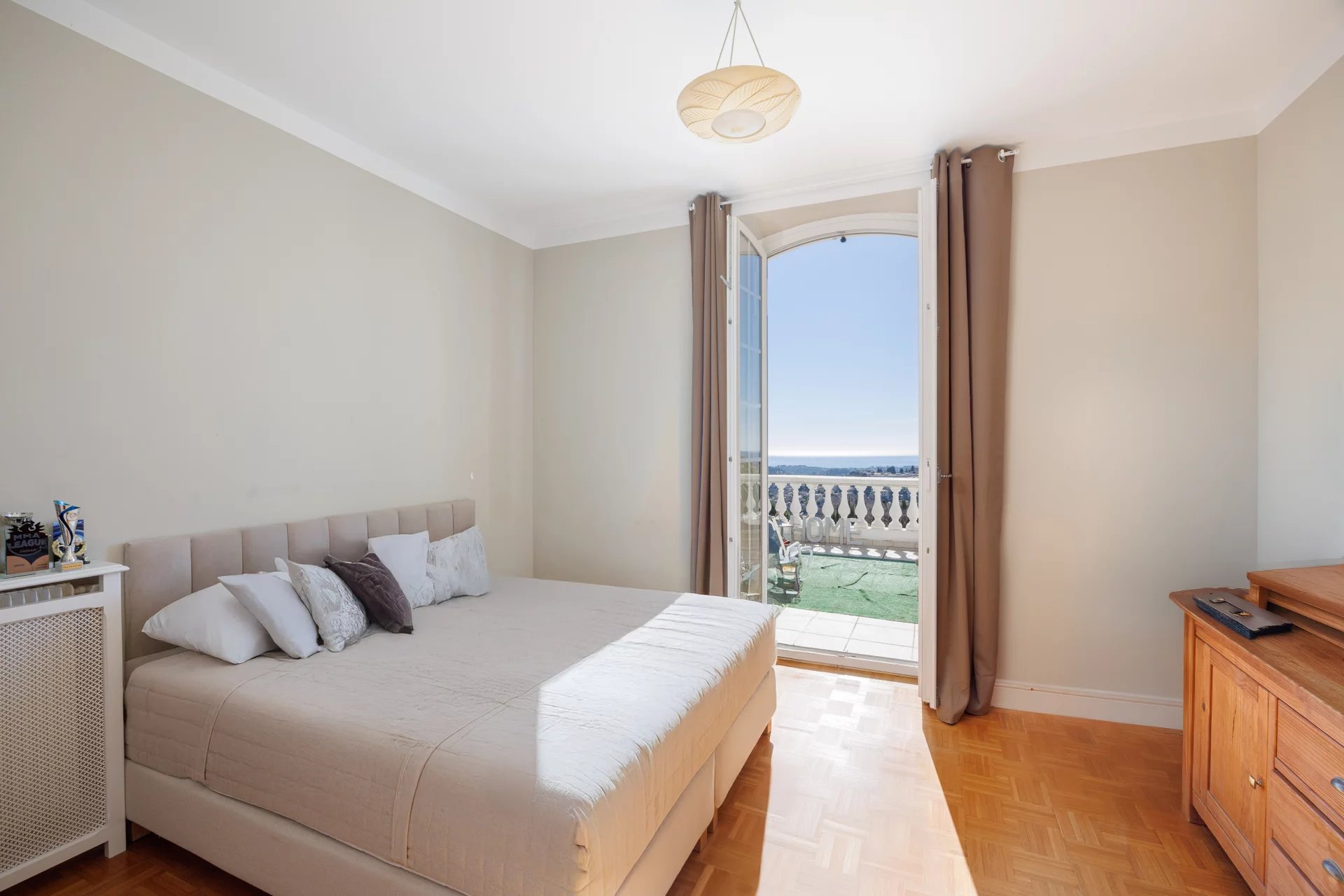 From the moment you step inside, the home’s elegant and welcoming atmosphere is felt. The spacious, light-filled living room, featuring a fireplace, and the separate fully equipped kitchen open onto a beautiful terrace, perfect for enjoying outdoor meals while admiring the Mediterranean scenery. This level also includes a lovely en-suite bedroom with a bathroom and toilet, a laundry room, a pantry, and a guest toilet. Upstairs, two exquisite suites each have their own bathrooms, while a magnificent 40sq.m terrace extends the pleasure of admiring the sea. The top floor houses a large cinema room, an additional bedroom, and a spacious shower room with toilet, offering the possibility of creating an independent apartment.