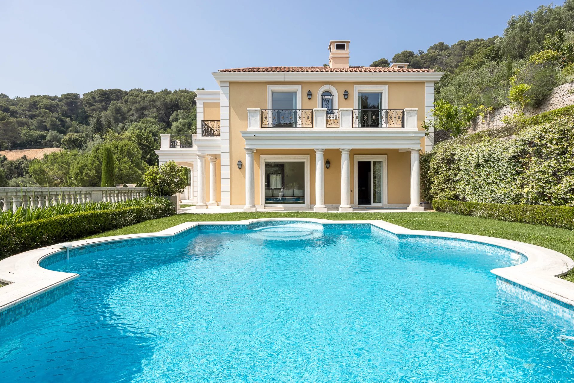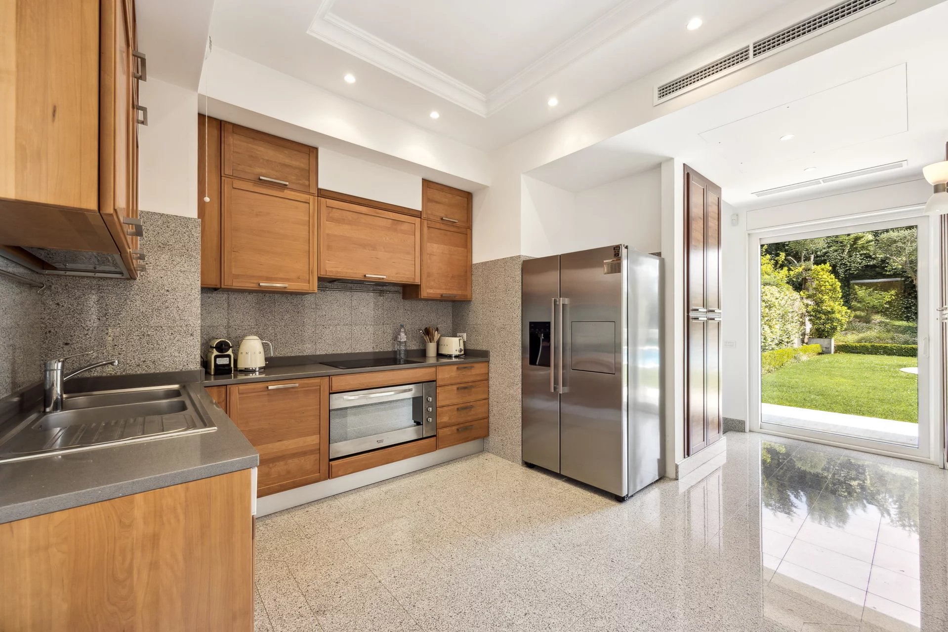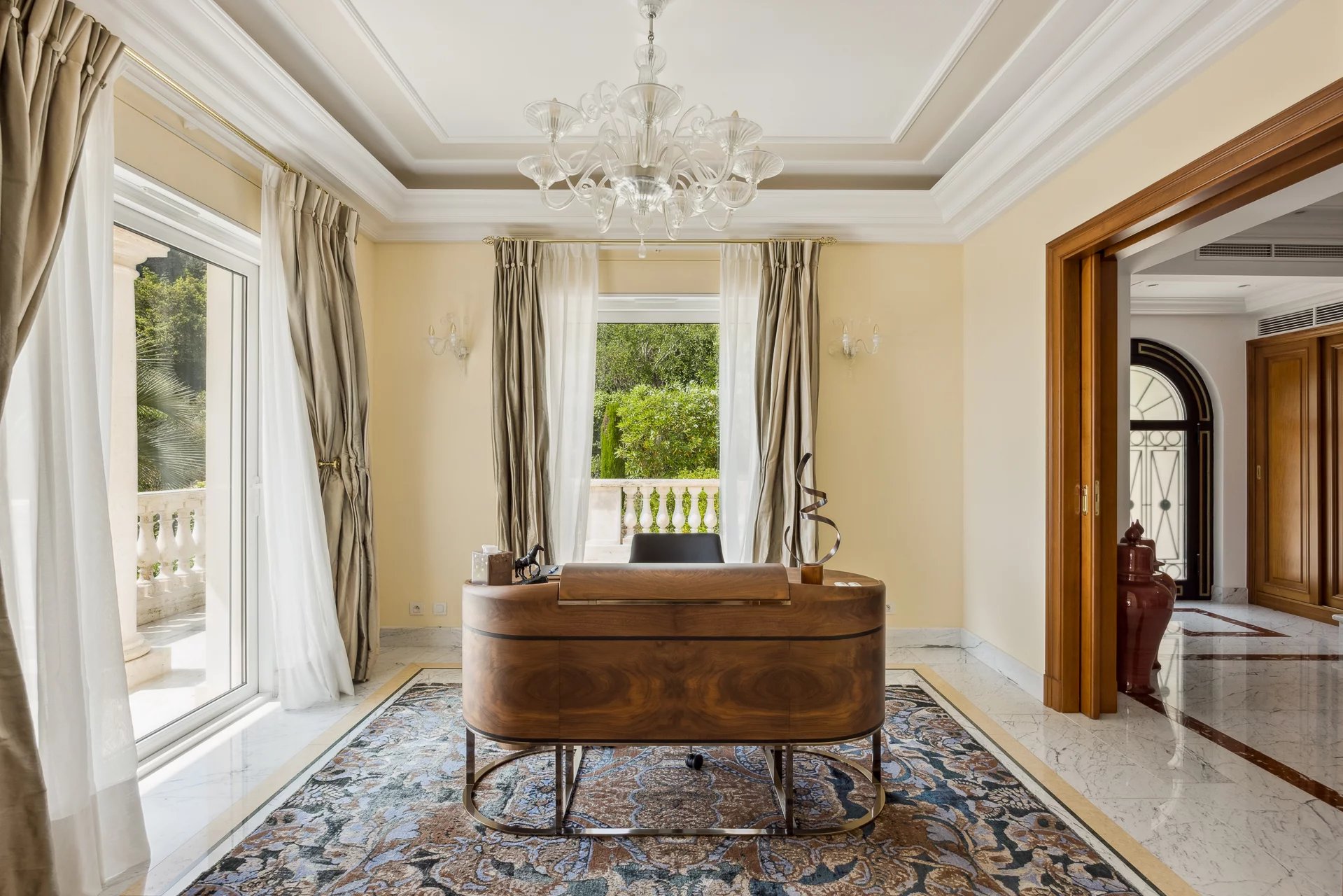 EXCLUSIVITY - This beautiful Palladian-style property offers spacious and bright interiors covering 400 m². The ground floor comprises a sunny living room, a dining room with a fireplace and a fully equipped kitchen – all rooms open onto a beautiful terrace with fantastic sea views. On the first floor, there are 5 bedrooms and 4 bathrooms, each with access to a terrace. In the basement, there is a garage for 6-8 cars, a separate studio and an office. This space could be used as a party room for various receptions and events. Elevator, A/C, alarm system, security cameras, heated swimming pool. The house is surrounded by a beautiful park of approximately 2,300 m².