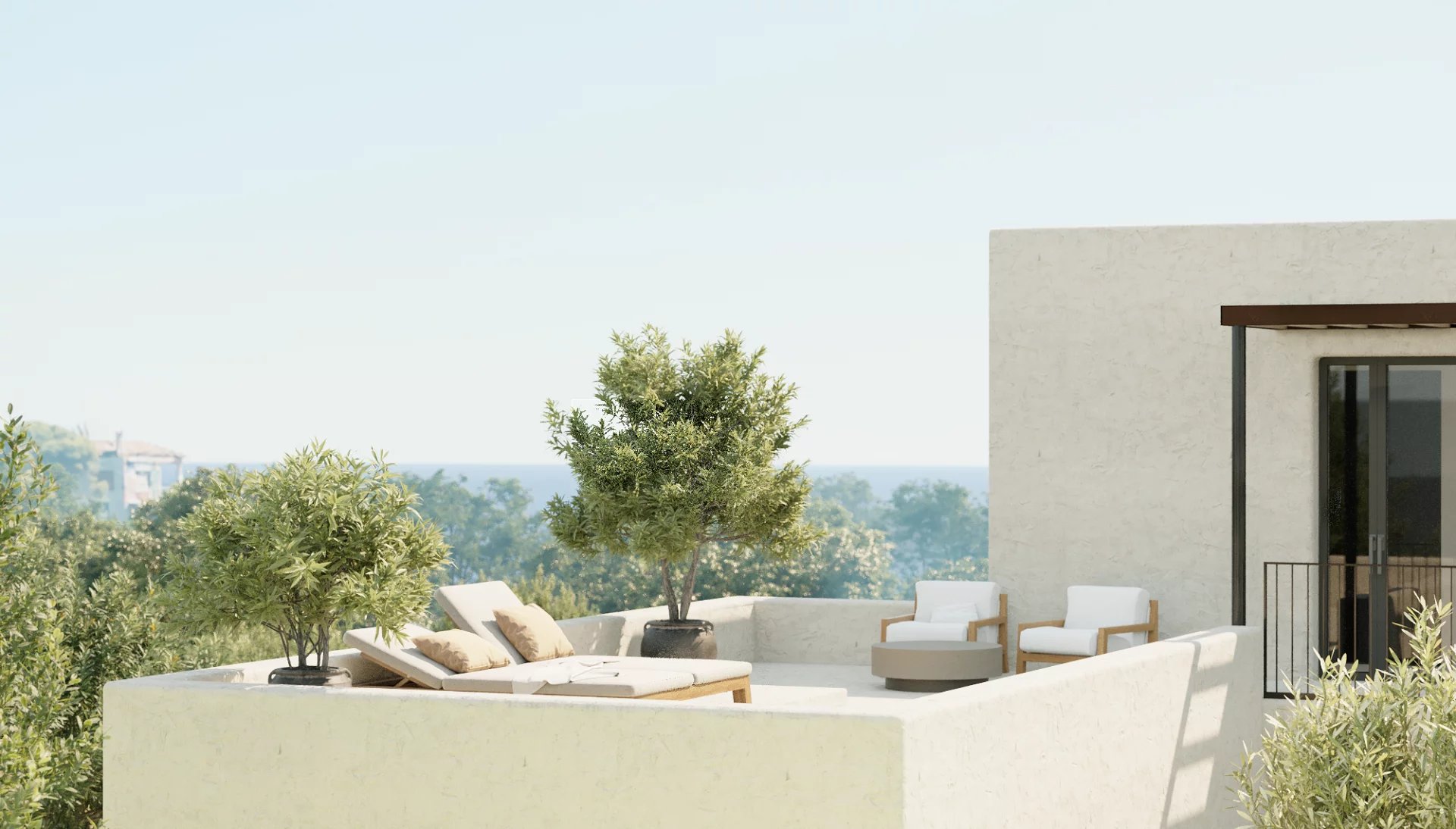 On the upper floor of 54,77m2 is the master bedroom with dressing room, bathroom and private terrace.