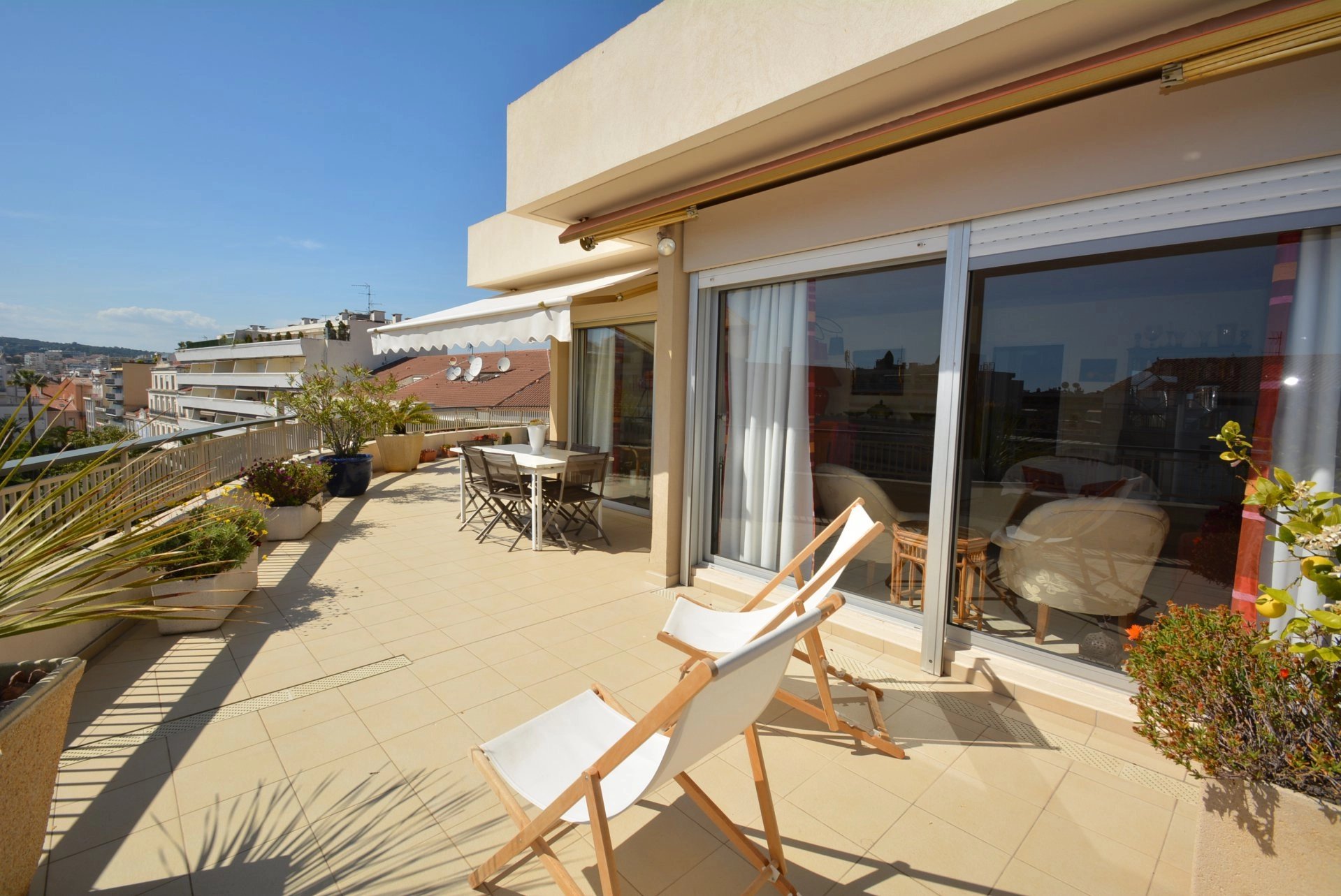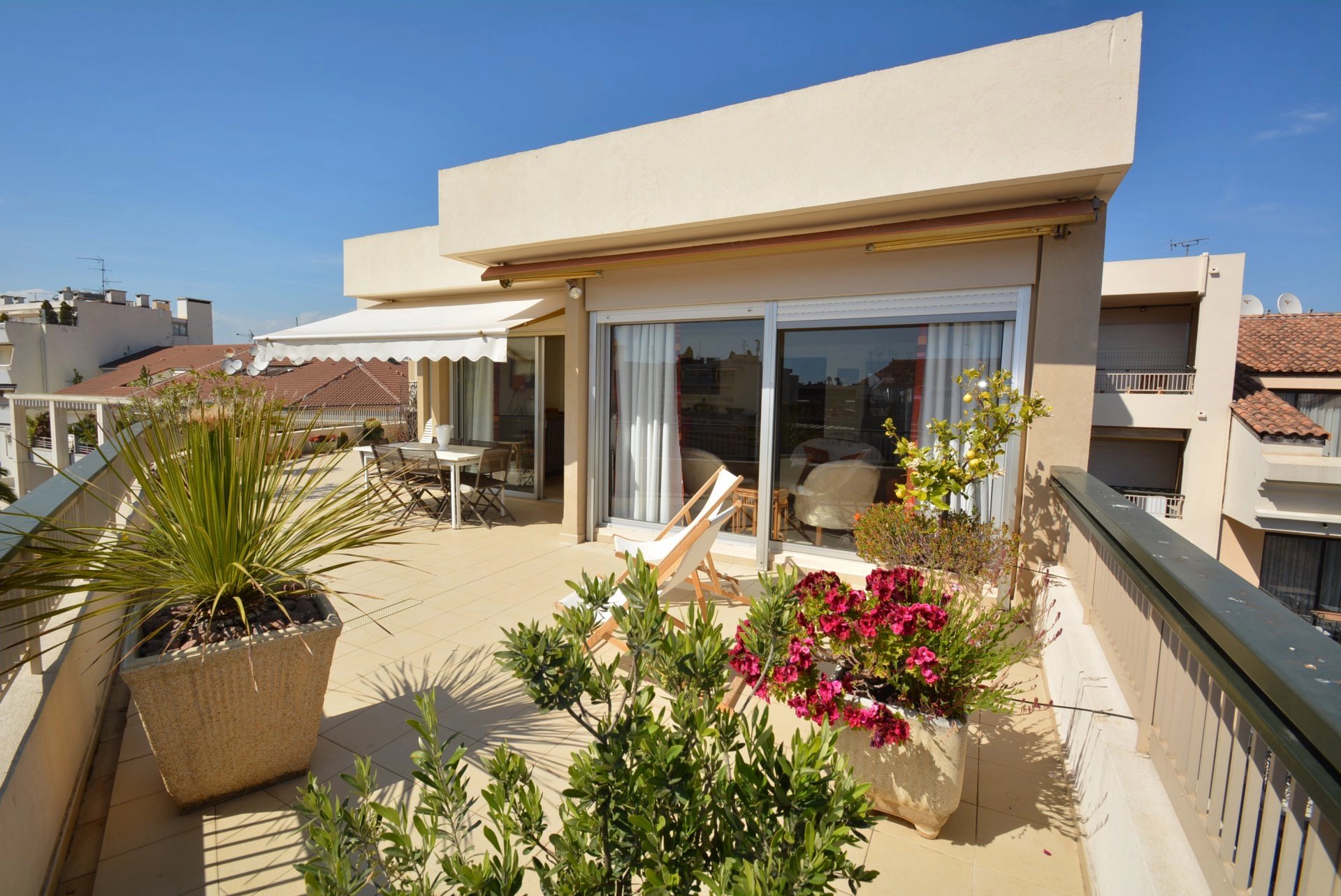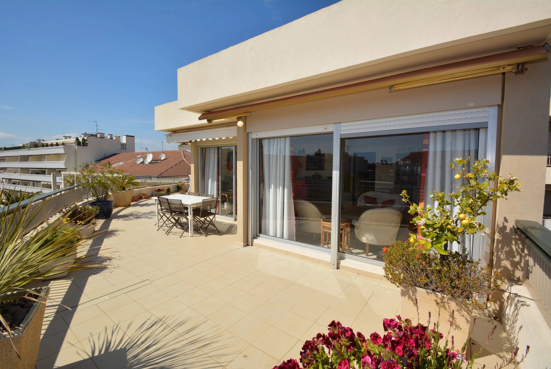 Large terrace of 70 sqm with trees and flowers and summer furniture