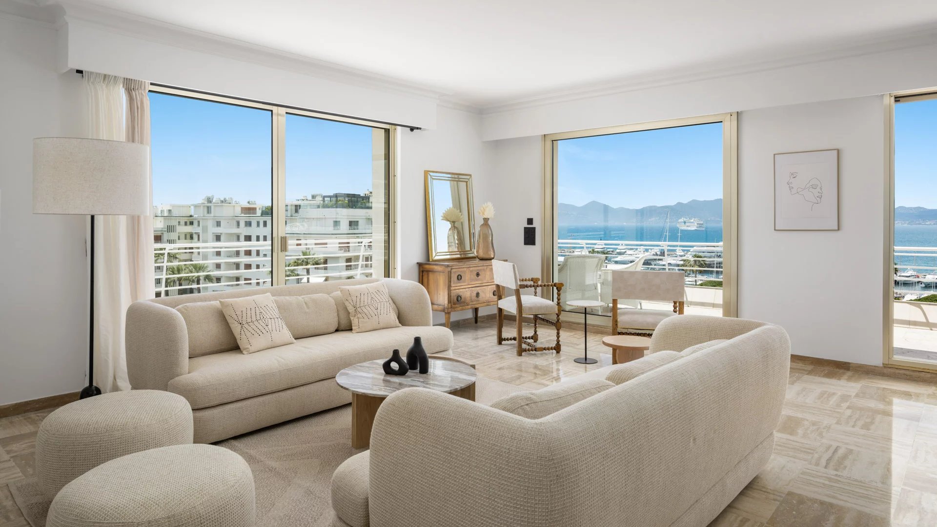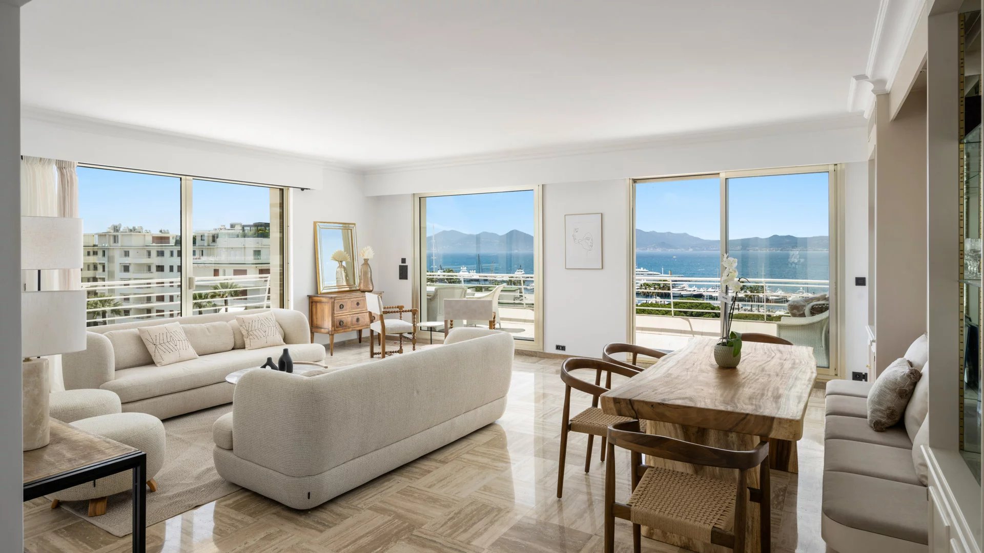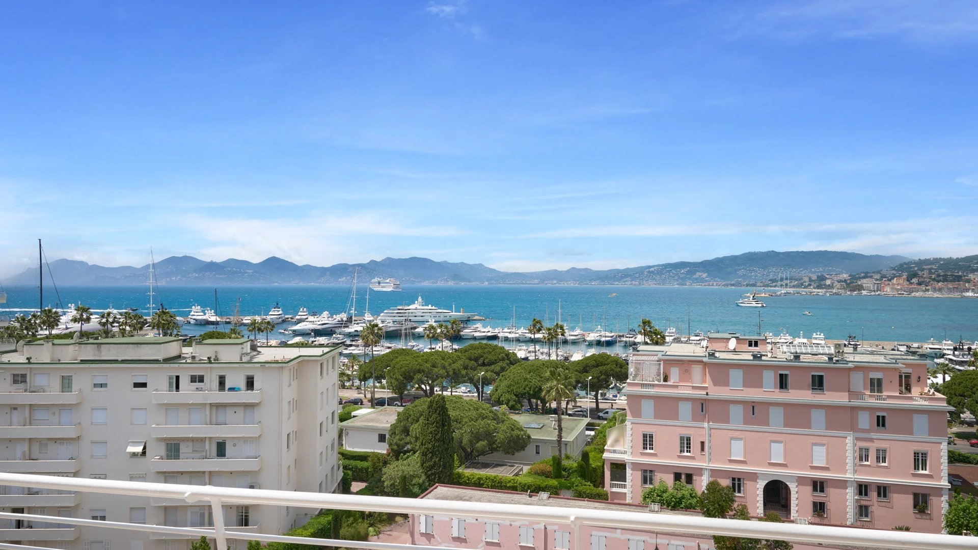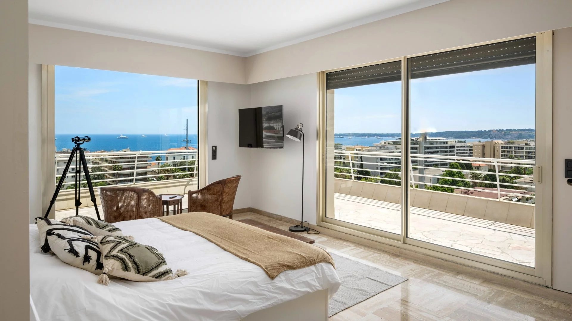 Located on the 7th and top floor of a prestigious residence in the residential Port Canto district of Cannes, this stunning 142 m² apartment is fully air-conditioned and offers an exceptional living environment. It boasts a magnificent 98 m² wraparound terrace, facing south, with breathtaking panoramic views over the Bay of Cannes, the Estérel mountains, Palm Beach, and Moure Rouge.
