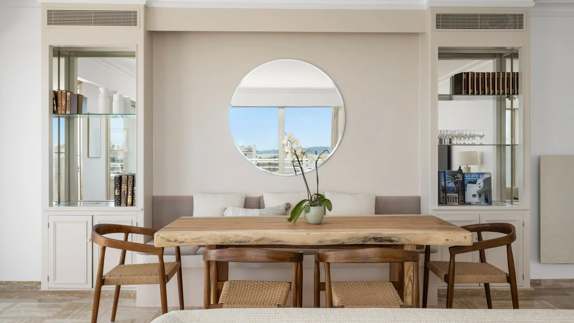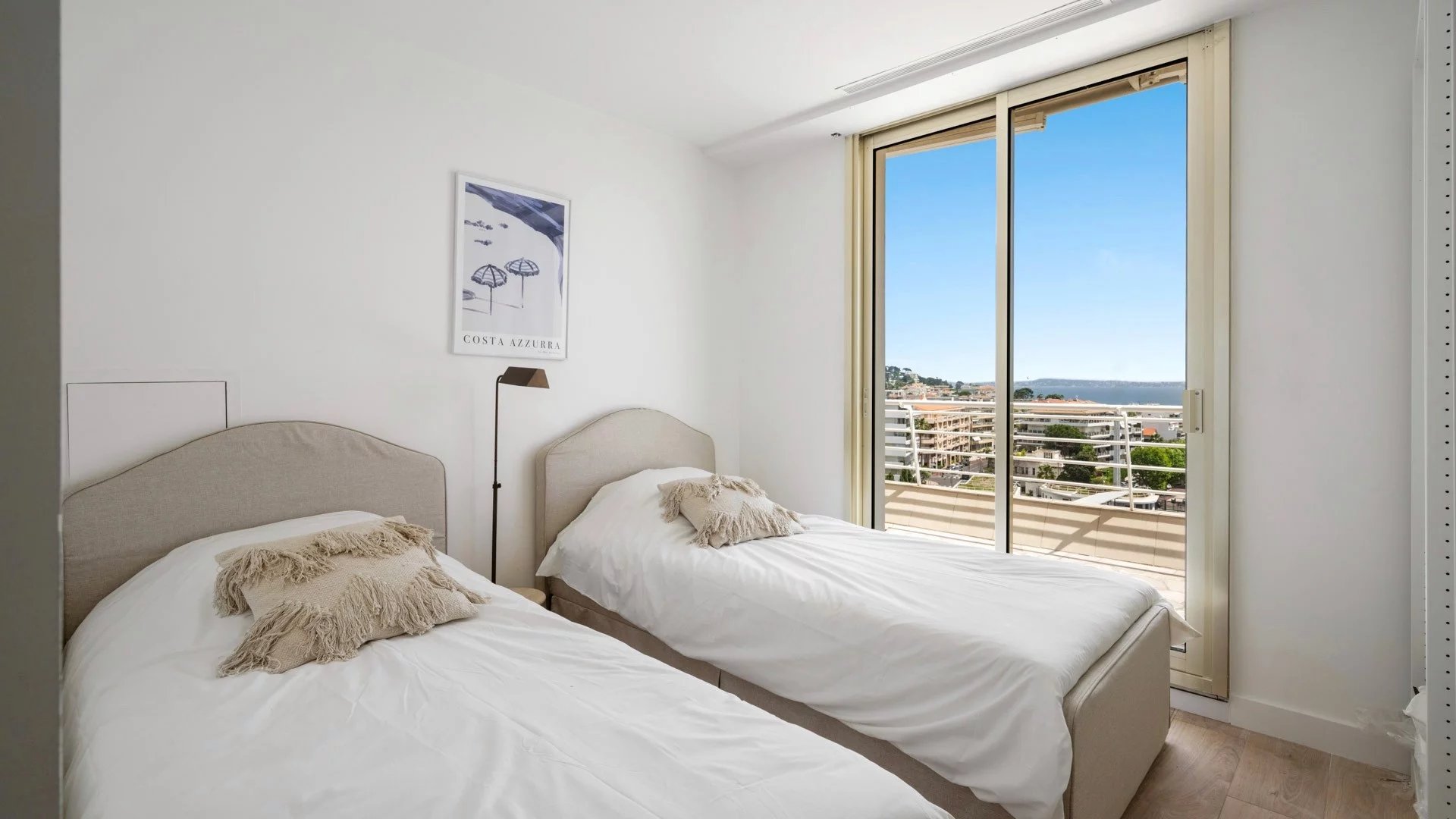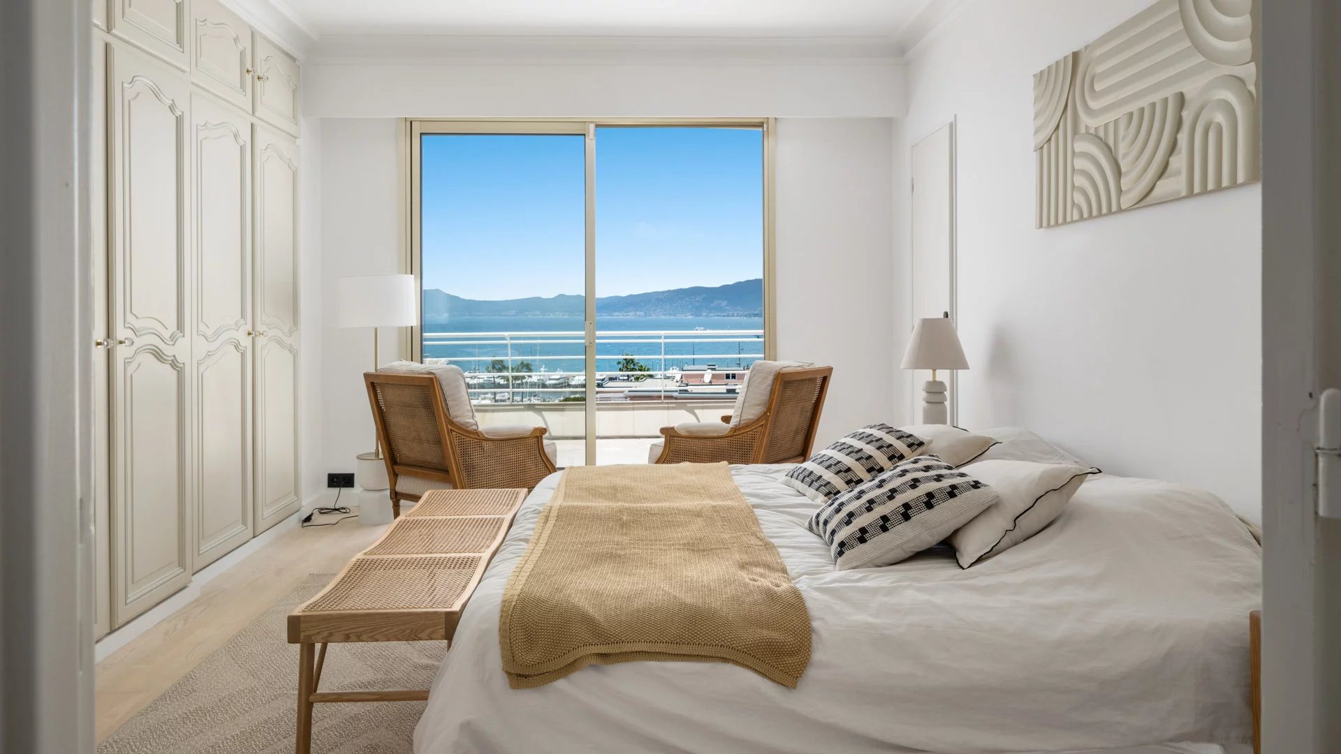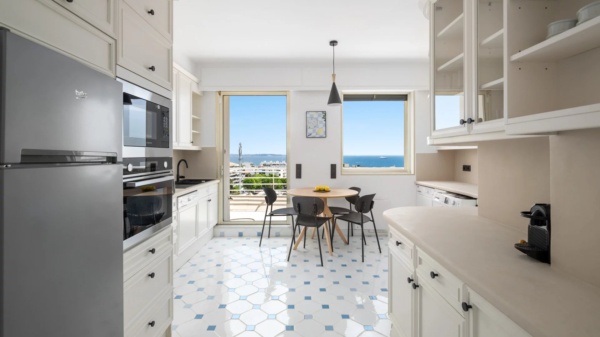 Located on the 7th and top floor of a prestigious residence in the residential Port Canto district of Cannes, this stunning 142 m² apartment is fully air-conditioned and offers an exceptional living environment. It boasts a magnificent 98 m² wraparound terrace, facing south, with breathtaking panoramic views over the Bay of Cannes, the Estérel mountains, Palm Beach, and Moure Rouge.