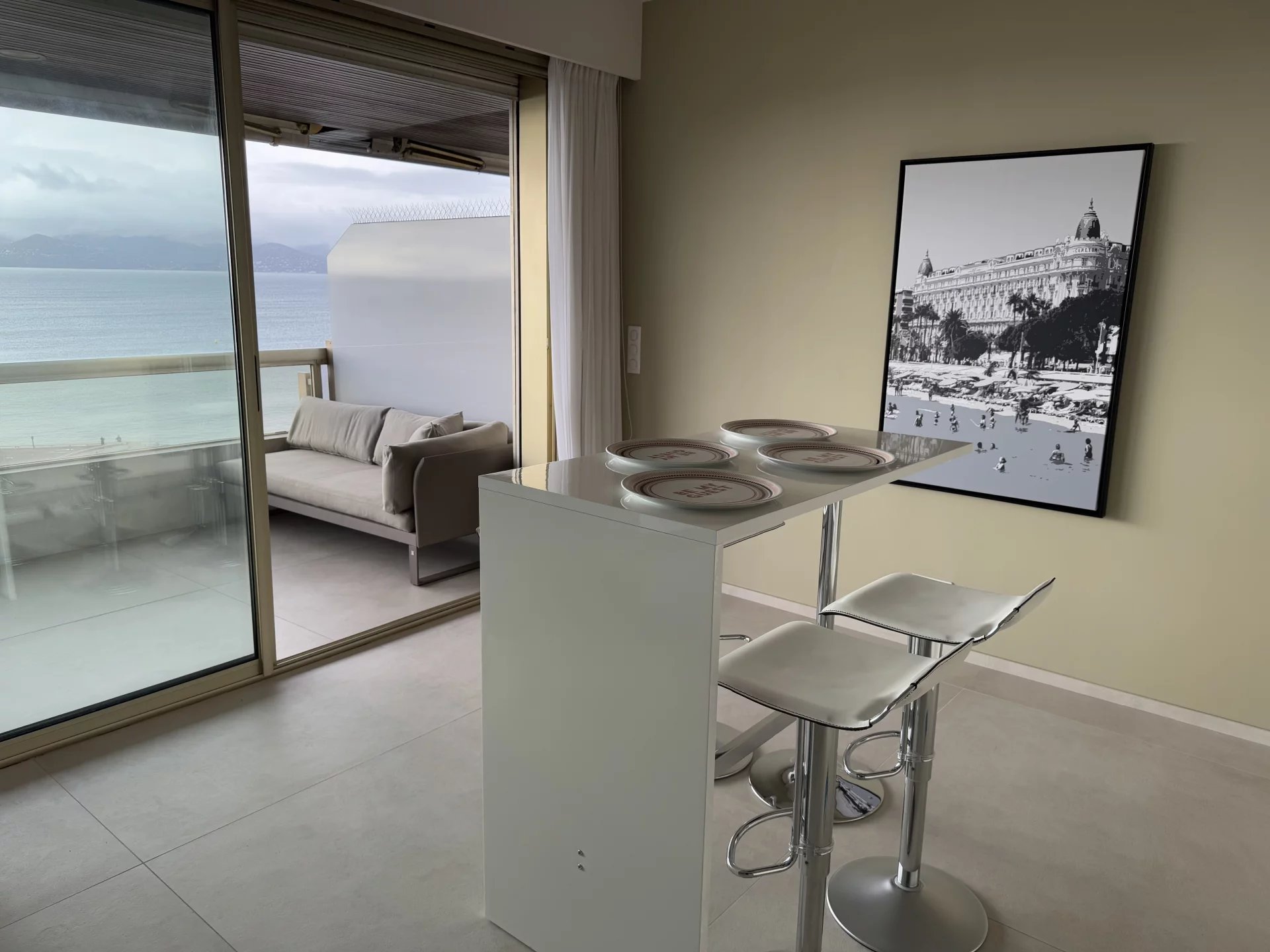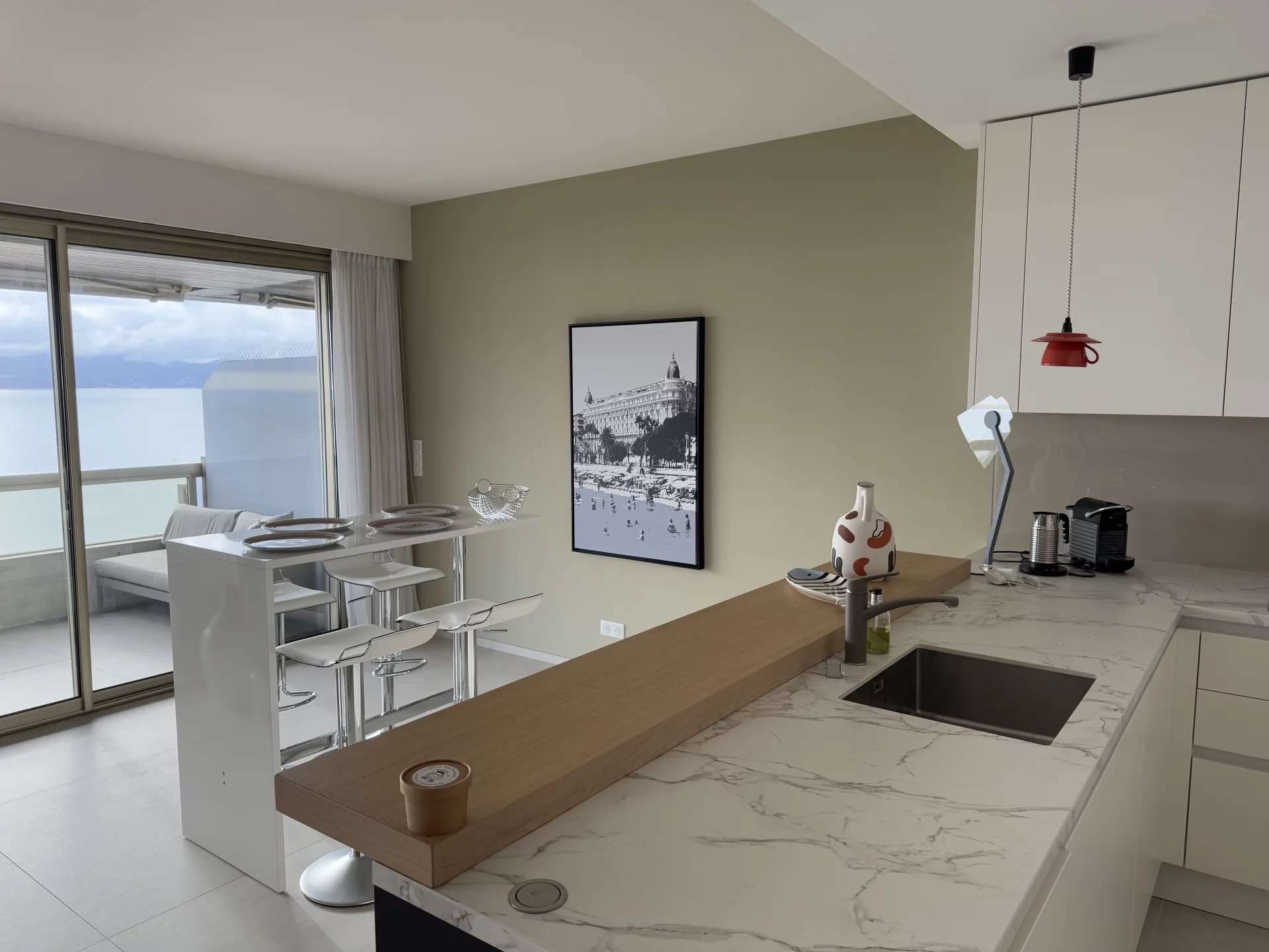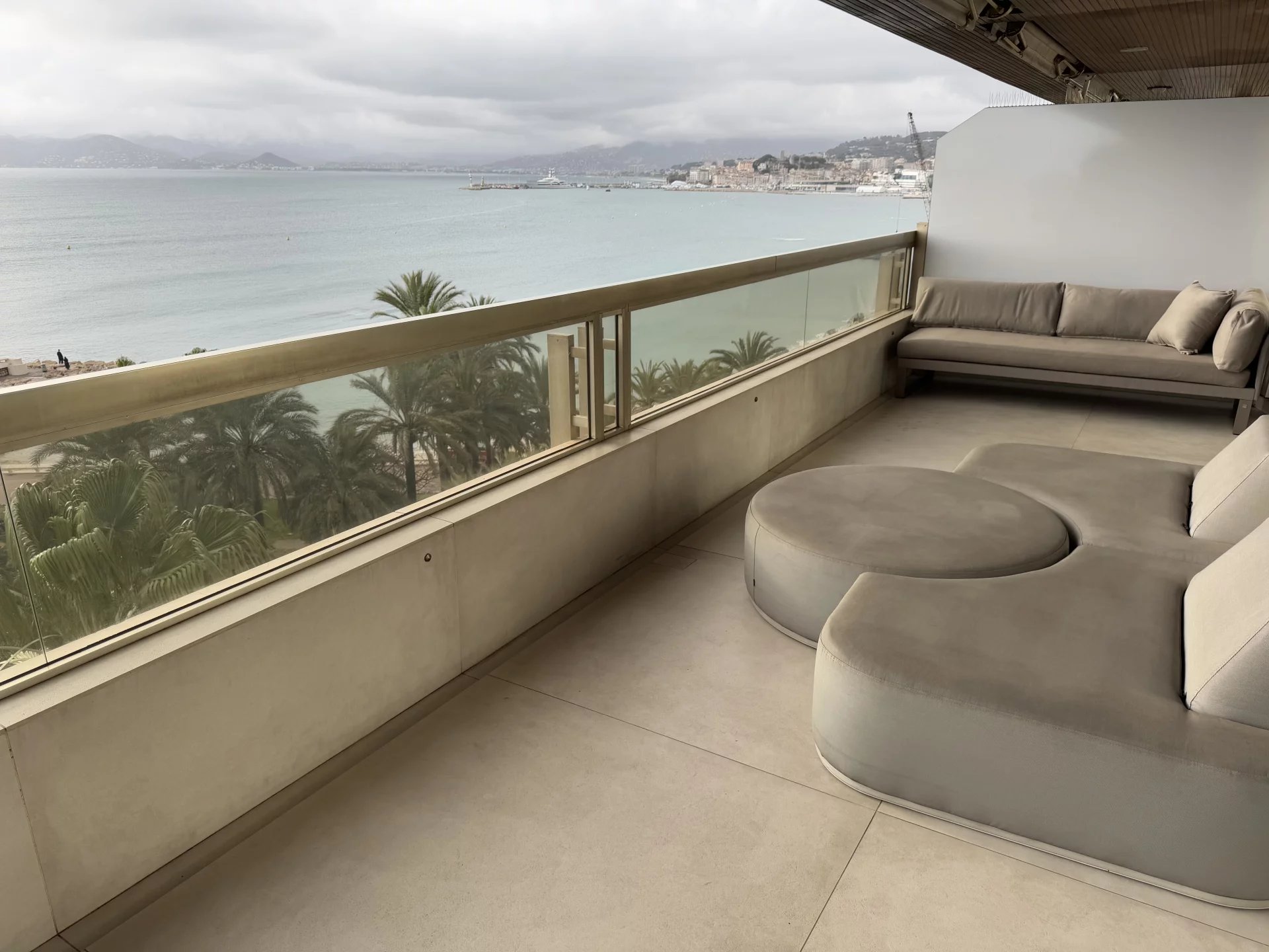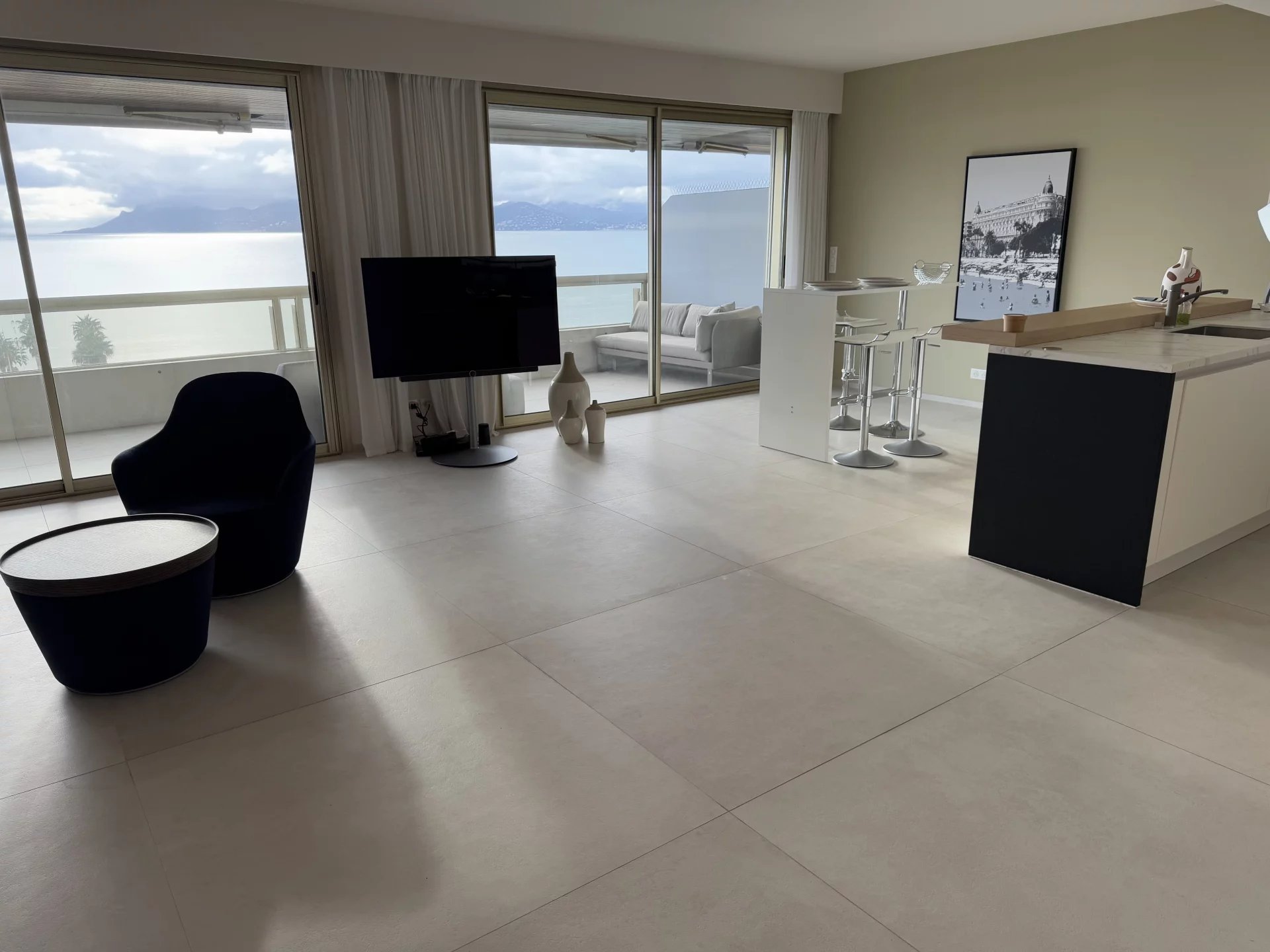 Ideally located on the Croisette, this apartment of approximately 110 m² includes: a large living room, dining room opening onto a terrace, an American-style kitchen and 2 en-suite bedrooms with shower room and bathroom. Very bright apartment. High floor.
