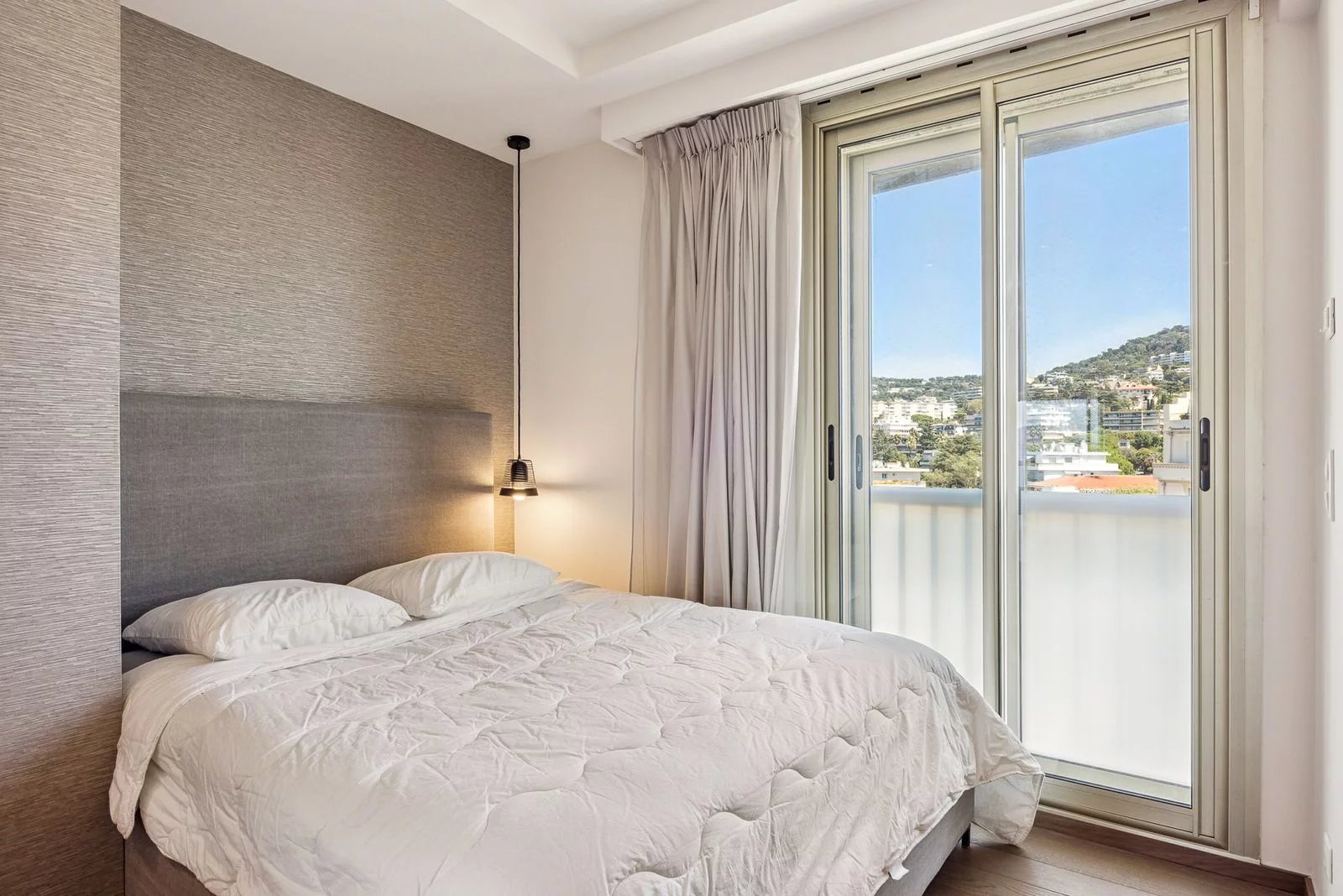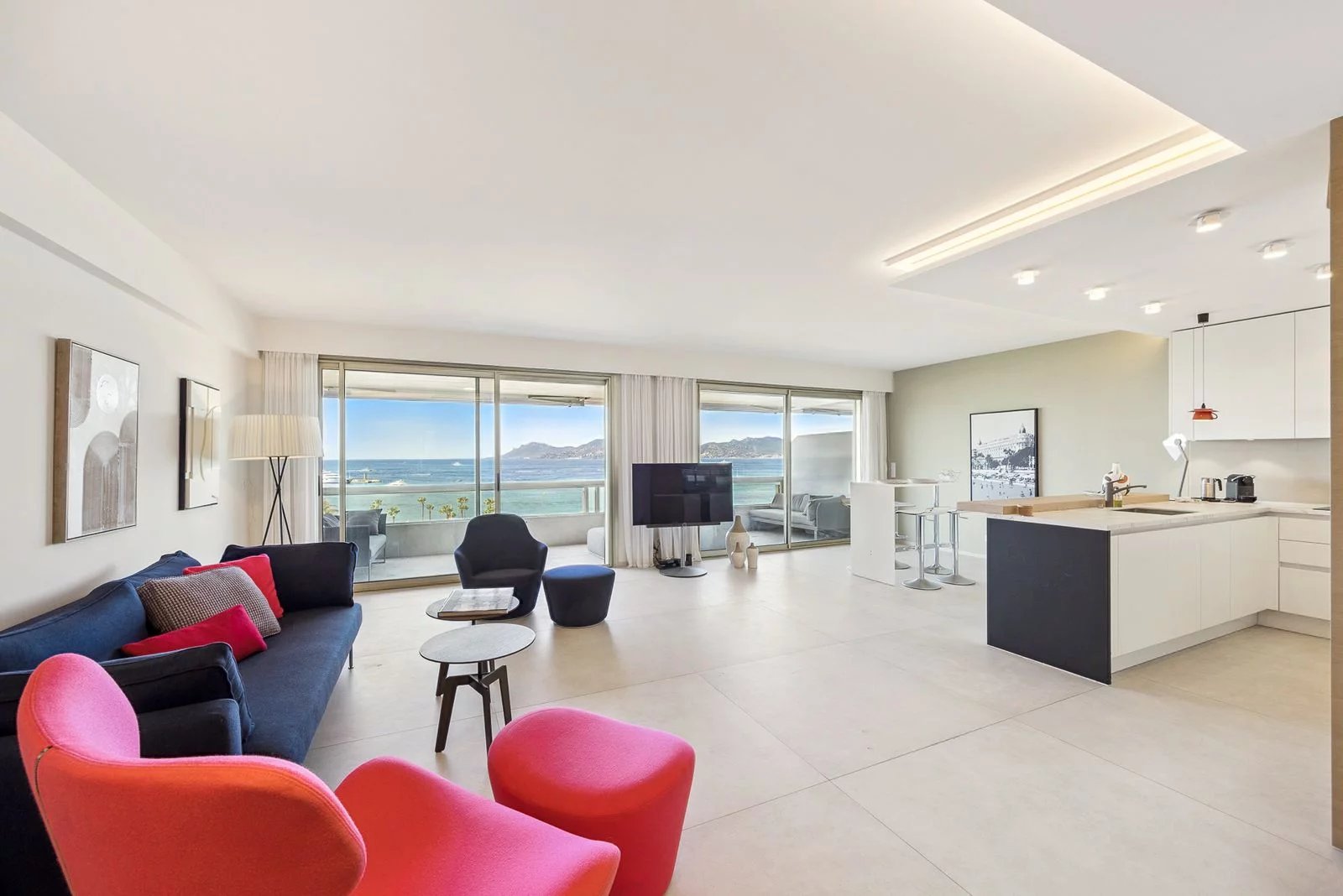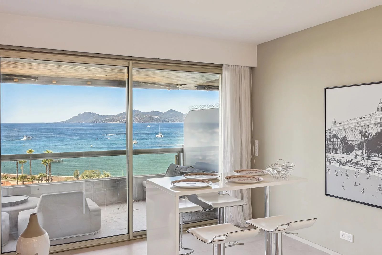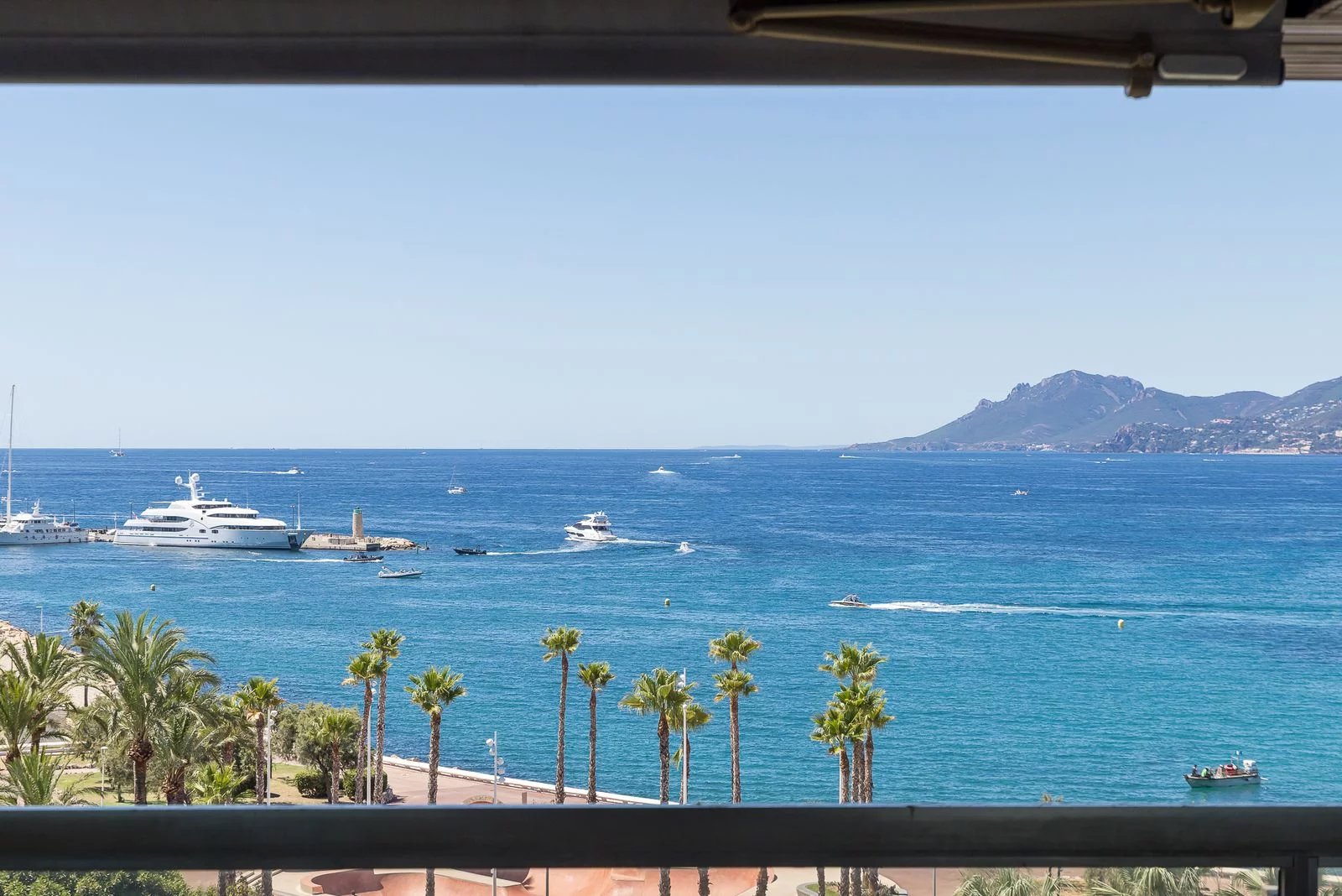 Ideally located on the Croisette, this apartment of approximately 110 m² includes: a large living room, dining room opening onto a terrace, an American-style kitchen and 2 en-suite bedrooms with shower room and bathroom. Very bright apartment. High floor.